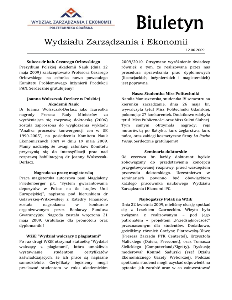 Biuletyn 12.06.2009 Redaktor dr Ewa Lechman