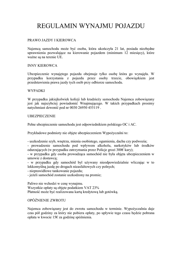 REGULAMIN WYNAJMU POJAZDU PRAWO JAZDY I KIEROWCA Najemcą samochodu może być osoba, która ukończyła 21 lat, posiada niezbędne uprawnienia pozwalające na kierowanie pojazdem (minimum 12 miesięcy), które ważne są na terenie UE. INNY KIEROWCA Ubezpieczenie wynajętego pojazdu obejmuje tylko osobę która go wynajęła. W przypadku korzystania z pojazdu przez osoby trzecie, obowiązkiem jest przedstawienia prawa jazdy tych osób przy odbiorze samochodu. WYPADKI W przypadku jakiejkolwiek kolizji lub kradzieży samochodu Najemca zobowiązany jest jak najszybciej powiadomić Wnajmującego. W takich przypadkach prosimy natychmiast dzwonić pod nr 0030 26950 455119 . UBEZPIECZENIE Pełne ubezpieczenie samochodu jest odpowiednikiem polskiego OC i AC. Przykładowe podmioty nie objęte ubezpieczeniem Wypożyczalni to: - uszkodzenie szyb, wnętrza, mienia osobistego, ogumienia, dachu czy podwozia; - prowadzenie samochodu pod wpływem alkoholu, narkotyków lub środków odurzających (w przypadku zatrzymania przez Policje grozi 300€ kary); - w przypadku gdy osoba prowadząca samochód nie była objęta ubezpieczeniem w umowie z dostawcą; - w przypadku gdy samochód byl używany nieodpowiedzialnie wliczając w to lekkomyślną jazdę po drogach nieasfaltowych czy polnych; - nieprawidłowe tankowanie pojazdu; - jeżeli samochód zostanie uszkodzony na promie; Paliwo nie wchodzi w cenę wynajmu. Wszystkie opłaty są objęte podatkiem VAT 23% Płatność może być realizowana kartą kredytową lub gotówką. OPÓŹNIENIE ZWROTU Najemca zobowiązany jest do zwrotu samochodu w terminie. Wypożyczalnia daje czas pół godziny za który nie pobiera opłaty, po upływie tego czasu będzie pobrana opłata w kwocie 15€ za godzinę spóźnienia. ZAKAZ Przewożenia ciężkich przedmiotów. Przewożenia większej ilości pasażerów niż jest dopuszczalne. Wyścigów samochodowych. Przemytu narkotyków. Najemca zobowiązany jest do pilnowania kluczyków, za zgubienie grozi kara 320€. Wypożyczalnia zastrzega sobie prawo do zmiany modelu samochodu niż ten, który jest w umowie. Dodatkowe wyposażenie jak foteliki, podstawki dla dzieci oraz wszelkie dodatkowe wyposażenie jest realizowane na żądanie klienta (w razie utraty kierowca ponosi karę w wysokości 60€). Okres wynajmu rozpoczyna się od momentu odebrania samochodu i kończy się następnego dnia o godz 8 rano, chyba, że jest zawarta inna umowa.