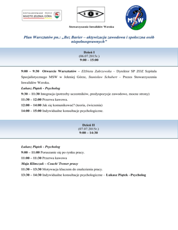 Plan Warsztatów pn.: „Bez Barier – aktywizacja zawodowa i
