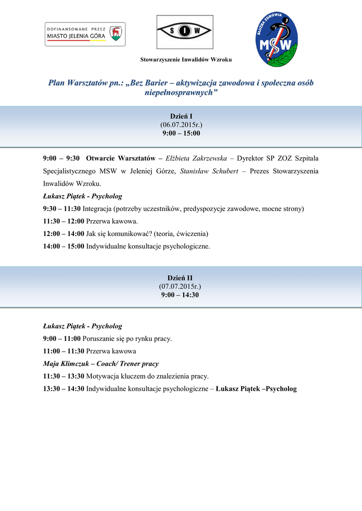 Stowarzyszenie Inwalidów Wzroku Plan Warsztatów pn.: „Bez Barier – aktywizacja zawodowa i społeczna osób niepełnosprawnych” Dzień I (06.07.2015r.) 9:00 – 15:00 9:00 – 9:30 Otwarcie Warsztatów – Elżbieta Zakrzewska – Dyrektor SP ZOZ Szpitala Specjalistycznego MSW w Jeleniej Górze, Stanisław Schubert – Prezes Stowarzyszenia Inwalidów Wzroku. Łukasz Piątek - Psycholog 9:30 – 11:30 Integracja (potrzeby uczestników, predyspozycje zawodowe, mocne strony) 11:30 – 12:00 Przerwa kawowa. 12:00 – 14:00 Jak się komunikować? (teoria, ćwiczenia) 14:00 – 15:00 Indywidualne konsultacje psychologiczne. Dzień II (07.07.2015r.) 9:00 – 14:30 Łukasz Piątek - Psycholog 9:00 – 11:00 Poruszanie się po rynku pracy. 11:00 – 11:30 Przerwa kawowa Maja Klimczuk – Coach/ Trener pracy 11:30 – 13:30 Motywacja kluczem do znalezienia pracy. 13:30 – 14:30 Indywidualne konsultacje psychologiczne – Łukasz Piątek –Psycholog Stowarzyszenie Inwalidów Wzroku Dzień III (08.08.2015r.) 09:00 – 14:30 Łukasz Piątek - Psycholog 09:00 – 12:00 Ćwiczenia/ zabawy kształtujące umiejętności społeczne/ zawodowe. 12:00 – 12:30 Przerwa kawowa. 12:30 – 13:30 Czy jestem asertywny? (teoria, kwestionariusz, ćwiczenia) 13:30 – 14:30 Indywidualne konsultacje psychologiczne. Dzień IV (09.07.2015r.) 9:00 – 15:30 Łukasz Piątek - Psycholog 09:00 – 11:00 Czy niepełnosprawność jest wyrokiem? (atuty niepełnosprawności, film o Nicku Vujcicu) 11:00 – 12:00 Jaka jest moja samoocena? (teoria, kwestionariusz, ćwiczenia) 12:00 – 12:30 Przerwa kawowa. 12:30 – 14:30 Jaka jest moja samoocena? (teoria, kwestionariusz, ćwiczenia) – dalszy ciąg. 14:30 – 15:30 Indywidualne konsultacje psychologiczne. Stowarzyszenie Inwalidów Wzroku Dzień V (10.07.2015r.) 9:00 – 14:00 Dominika Trawińska – Doradca Zawodowy – Powiatowy Urząd Pracy w Jeleniej Górze 09:00 – 11:00 Przygotowanie dokumentów aplikacyjnych. 11:00 – 11:30 Przerwa kawowa. 11:30 – 13:30 Przygotowanie się do rozmowy z pracodawcą. 13:30 – 14:00 Zakończenie Warsztatów - Elżbieta Zakrzewska – Dyrektor SP ZOZ Szpitala Specjalistycznego MSW w Jeleniej Górze, Stanisław Schubert – Prezes Stowarzyszenia Inwalidów Wzroku.