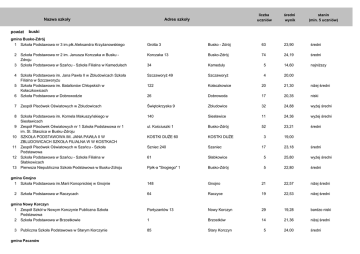 Nazwa szkoły powiat Adres szkoły liczba uczniów średni wynik stanin (min. 5 uczniów) buski gmina Busko-Zdrój 1 Szkoła Podstawowa nr 3 im.płk.Aleksandra Krzyżanowskiego Grotta 3 Busko - Zdrój 63 23,90 średni 2 Szkoła Podstawowa nr 2 im. Janusza Korczaka w Busku Zdroju Szkoła Podstawowa w Szańcu - Szkoła Filialna w Kamedułach Korczaka 13 Busko-Zdrój 74 24,19 średni 34 Kameduły 5 14,60 najniższy Szczaworyż 49 Szczaworyż 4 20,00 122 Kołaczkowice 20 21,30 niżej średni 6 Szkoła Podstawowa im. Jana Pawła II w Zbludowicach Szkoła Filialna w Szczaworyżu Szkoła Podstawowa im. Batalionów Chłopskich w Kołaczkowicach Szkoła Podstawowa w Dobrowodzie 26 Dobrowoda 17 20,35 niski 7 Zespół Placówek Oświatowych w Zbludowicach Świętokrzyska 9 Zbludowice 32 24,88 wyżej średni 8 Szkoła Podstawowa im. Kornela Makuszyńskiego w Siesławicach Zespół Placówek Oświatowych nr 1 Szkoła Podstawowa nr 1 im. St. Staszica w Busku-Zdroju SZKOŁA PODSTAWOWA IM. JANA PAWŁA II W ZBLUDOWICACH SZKOŁA FILIALNA W W KOSTKACH Zespół Placówek Oświatowych w Szańcu - Szkoła Podstawowa Szkoła Podstawowa w Szańcu - Szkoła Filialna w Słabkowicach Pierwsza Niepubliczna Szkoła Podstawowa w Busku-Zdroju 140 Siesławice 11 24,36 wyżej średni ul. Kościuszki 1 Busko-Zdrój 52 23,21 średni KOSTKI DUŻE 60 KOSTKI DUŻE 3 19,00 Szniec 240 Szaniec 17 23,18 średni 61 Słabkowice 5 25,80 wyżej średni Ppłk-a "Srogiego" 1 Busko-Zdrój 5 22,80 średni 3 4 5 9 10 11 12 13 gmina Gnojno 1 Szkoła Podstawowa im.Marii Konopnickiej w Gnojnie 148 Gnojno 21 22,57 niżej średni 2 Szkoła Podstawowa w Raczycach 64 Raczyce 19 22,53 niżej średni Partyzantów 13 Nowy Korczyn 29 19,28 bardzo niski 1 Brzostków 14 21,36 niżej średni 85 Stary Korczyn 5 24,00 średni gmina Nowy Korczyn 1 Zespół Szkół w Nowym Korczynie Publiczna Szkoła Podstawowa 2 Szkoła Podstawowa w Brzostkowie 3 Publiczna Szkoła Podstawowa w Starym Korczynie gmina Pacanów Nazwa szkoły 1 2 3 4 SZKOŁA PODSTAWOWA IM. FUNDACJI ZOFII I WŁADYSŁAWA POKUSÓW WSPIERANIA EDUKACJI Szkoła Podstawowa w Zespole Publicznych Placówek Oświatowych w Wójczy SZKOŁA PODSTAWOWA IM. JANA BRZECHWY W RATAJACH SŁUPSKICH Szkoła Podstawowa im.K. Makuszyńskiego w Pacanowie Adres szkoły liczba uczniów średni wynik stanin (min. 5 uczniów) 73 Oblekoń 8 20,63 niski 20 Wójcza 7 25,71 wyżej średni 39a Rataje Słupskie 21 21,33 niżej średni Karska 3 Pacanów 27 25,56 wyżej średni 1 Maja 18 Solec-Zdrój 29 19,28 bardzo niski Zborów 121 Zborów 26 24,62 wyżej średni Kazimierza Wielkiego 23 Stopnica 60 23,08 średni Niziny 120 a Niziny 17 20,71 niski 65 Kargów 5 22,00 niżej średni 33 Tuczępy 13 30,46 najwyższy gmina Solec-Zdrój 1 Szkoła Podstawowa w Zespole Szkół w Solcu-Zdroju Szkola Podstawowa w Zespole Publicznych Placówek Oświatowych w Zborowie gmina Stopnica 1 Zespół Szkolno-Przedszkolny Szkoła Podstawowa im. Batalionów Chłopskich w Stopnicy. gmina Tuczępy 1 Szkoła Podstawowa im.Tadeusza Kościuszki w ZPO w Nizinach 2 Szkoła Podstawowa im. gen. Władysława Andersa w Kargowie 3 Szkoła Podstawowa im. Henryka Sienkiewicza w Tuczępach 2 gmina Wiślica 1 Zespół Szkolno-Przedszkolny w Wiślicy Podwale 1 Wiślica 35 29,09 bardzo wysoki 2 Szkoła Podstawowa w Skotnikach Dolnych Skotniki Dolne 41 Skotniki Dolne 10 26,50 wysoki 16 19,94 niski powiat jędrzejowski gmina Imielno 1 Samorządowa Szkoła Podstawowa w Imielnie Kościelna 3 Imielno 2 Samorządowa Szkoła Podstawowa w Mierzwinie 11 MIERZWIN 9 17,44 najniższy 3 Samorządowa Szkoła Podstawowa w Motkowicach Szkolna 1 Motkowice 12 20,33 niski 7 32,00 najwyższy 10 19,70 niski gmina Jędrzejów 1 Szkoła Podstawowa w Łysakowie 44 Łysaków Drugi 2 ZPO Szkoła Podstawowa im. bł Wincentego Kadłubka w Prząsławiu Prząsław 55 Prząsław Nazwa szkoły Adres szkoły liczba uczniów średni wynik stanin (min. 5 uczniów) ul. Przypkowskiego 12 Jędrzejów 66 23,65 średni Reymonta 1 Jędrzejów 52 21,56 niżej średni 5 Szkoła Podstawowa nr 2 im. Komisji Edukacji Narodowej w Jędrzejowie Szkoła Podstawowa nr 3 im.Władysława Broniewskiego w Jędrzejowie Zespól Szkół-Szkoła Podstawowa nr4 w Jędrzejowie Przypkowskiego 43 Jędrzejów 39 22,54 niżej średni 6 Szkoła Podstawowa im. Roalda Amundsena w Skroniowie Skroniów 75 Skroniów 8 26,38 wysoki 7 Szkoła Podstawowa w Jasionnie Jasionna 8 Jasionna 10 30,60 najwyższy 8 Szkoła Podstawowa w Potoku Wielkim Potok Wielki 9 Potok Wielki 9 21,44 niżej średni 9 Szkoła Podstawowa w Piaskach 83 Piaski 5 29,60 bardzo wysoki 10 Szkoła Podstawowa w Podchojnach 106 Podchojny 19 26,68 wysoki 11 Szkoła Podstawowa w Rakowie Raków 45 Raków 9 29,22 bardzo wysoki 12 Szkoła Podstawowa w Mnichowie 72 Mnichów 11 22,09 niżej średni 13 Niepubliczna Szkoła Podstawowa w Brusie Brus 59 Brus 8 20,75 niski 3 4 gmina Małogoszcz 1 Szkoła Podstawowa w Złotnikach 66a Złotniki 19 22,16 niżej średni 2 11 Listopada 14b Małogoszcz 58 19,83 niski 3 Szkoła Podstawowa im. 24 Lutego 1863 Roku w Zespole Szkół Ogólnokształcących w Małogoszczu Szkoła Podstawowa w Kozłowie 182 Kozłów 14 25,50 wyżej średni 4 Szkoła Podstawowa Żarczyce Duże im ks. St. H. Konarskiego 29 Żarczyce Duże 14 22,64 niżej średni 5 SZKOŁA PODSTAWOWA W REMBIESZYCACH 10 REMBIESZYCE 24 21,79 niżej średni Mikołaja Reja 40 Nagłowice 31 25,23 wyżej średni 95 Warzyn Pierwszy 14 25,21 wyżej średni Pl. Mikołaja Reja 19 Oksa 23 22,48 niżej średni gmina Nagłowice 1 Szkoła Podstawowa im. Mikołaja Reja w Zespole Placówek Oświatowych w Nagłowicach 2 Szkoła Podstawowa w Zespole Placówek Oświatowych w Warzynie Pierwszym gmina Oksa 1 Szkoła Podstawowa w Oksie Nazwa szkoły 2 Szkoła Podstawowa w Węgleszynie Adres szkoły liczba uczniów średni wynik stanin (min. 5 uczniów) 50A Węgleszyn 13 19,62 niski gmina Sędziszów 1 Szkoła Podstawowa nr 1 w Zespole Szkół Ogólnokształcących ul. T.Kościuszki 7 Sędziszów 51 24,29