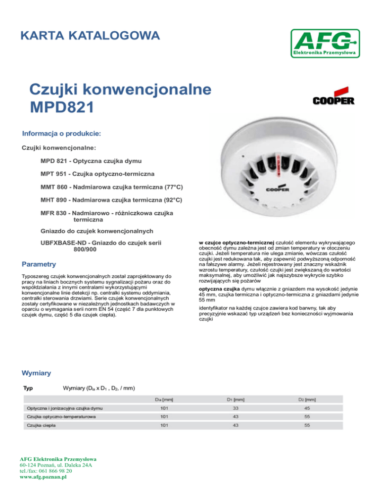 KARTA KATALOGOWA Czujki konwencjonalne MPD821 Informacja o produkcie: Czujki konwencjonalne: MPD 821 - Optyczna czujka dymu MPT 951 - Czujka optyczno-termiczna MMT 860 - Nadmiarowa czujka termiczna (77°C) MHT 890 - Nadmiarowa czujka termiczna (92°C) MFR 830 - Nadmiarowo - różniczkowa czujka termiczna Gniazdo do czujek konwencjonalnych UBFXBASE-ND - Gniazdo do czujek serii 800/900 Parametry Typoszereg czujek konwencjonalnych został zaprojektowany do pracy na liniach bocznych systemu sygnalizacji pożaru oraz do współdziałania z innymi centralami wykorzystującymi konwencjonalne linie detekcji np. centralki systemu oddymiania, centralki sterowania drzwiami. Serie czujek konwencjonalnych zostały certyfikowane w niezależnych jednostkach badawczych w oparciu o wymagania serii norm EN 54 (część 7 dla punktowych czujek dymu, część 5 dla czujek ciepła). Wymiary Typ Wymiary (Dia x D1 , D2, / mm) AFG Elektronika Przemysłowa 60-124 Poznań, ul. Daleka 24A tel./fax: 061 866 98 20 www.afg.poznan.pl w czujce optyczno-termicznej czułość elementu wykrywającego obecność dymu zależna jest od zmian temperatury w otoczeniu czujki. Jeżeli temperatura nie ulega zmianie, wówczas czułość czujki jest redukowana tak, aby zapewnić podwyższoną odporność na fałszywe alarmy. Jeżeli rejestrowany jest znaczny wskaźnik wzrostu temperatury, czułość czujki jest zwiększaną do wartości maksymalnej, aby umożliwić jak najszybsze wykrycie szybko rozwijających się pożarów optyczna czujka dymu włącznie z gniazdem ma wysokość jedynie 45 mm, czujka termiczna i optyczno-termiczna z gniazdami jedynie 55 mm identyfikator na każdej czujce zawiera kod barwny, tak aby precyzyjnie wskazać typ urządzeń bez konieczności wyjmowania czujki KARTA KATALOGOWA Opis urządzenia: czujka Opis urządzenia: gniazdo certyfikowane na zgodność z EN54 konstrukcja Przy konstruowaniu gniazd brano pod uwagę prostotę, elastyczność montażową i szybkość instalacji. niskoprofilowa innowacyjna technologia umożliwia obserwowanie wskaźnika zadziałania LED z dowolnego kąta widzenia gniazda posiadają specjalnie skonstruowane podzespoły w celu umożliwienia przekazania sygnału uszkodzenia w przypadku usunięcia czujki z gniazda przy zachowaniu pełnej ciągłości toru transmisji Interfejs użytkownika wskaźnik LED sygnalizuje stan pracy czujki o wskaźnik zadziałania widoczny pod kątem 360 wszystkie połączenia kablowe realizuje się za pośrednictwem gniazda czujki Uwagi instalacyjne Czerwona – alarm AFG Elektronika Przemysłowa 60-124 Poznań, ul. Daleka 24A tel./fax: 061 866 98 20 www.afg.poznan.pl Żółty - awaria czujki są montowane i przyłączane do linii za pośrednictwem gniazda przepust kablowy gniazda może znajdować się z boku lub z tyłu możliwe jest mechaniczne zablokowanie czujki w gnieździe ,aby zapobiec nieuprawnionemu usunięciu czujki z gniazda bez specjalnego narzędzia zastosowano mechanizm zapadkowy w celu łatwego wskazania że czujka została prawidłowo zamocowana w gnieździe w gniazdach przewidziano oddzielne zaciski do przyłączenia wejścia i wyjścia linii dozorowej każdy zacisk umożliwia przyłączenie kabla o przekroju do 2 2,5 mm możliwość zachowania dystansu w celu uniknięcia powstania odkształceń konstrukcji gniazda przy montażu na nierównych powierzchniach (mocowania odpowiadają wymaganiom standardu BESA) lub umożliwiające bezpośredni montaż czujki na powierzchni.