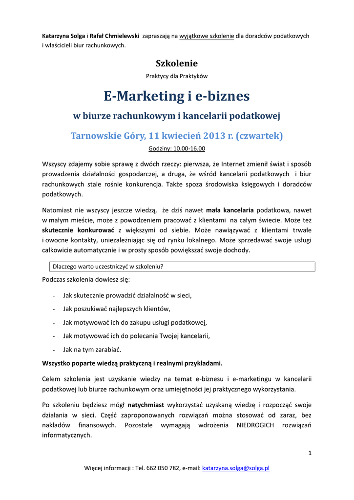 Katarzyna Solga i Rafał Chmielewski zapraszają na wyjątkowe szkolenie dla doradców podatkowych i właścicieli biur rachunkowych. Szkolenie Praktycy dla Praktyków E-Marketing i e-biznes w biurze rachunkowym i kancelarii podatkowej Tarnowskie Góry, 11 kwiecień 2013 r. (czwartek) Godziny: 10.00-16.00 Wszyscy zdajemy sobie sprawę z dwóch rzeczy: pierwsza, że Internet zmienił świat i sposób prowadzenia działalności gospodarczej, a druga, że wśród kancelarii podatkowych i biur rachunkowych stale rośnie konkurencja. Także spoza środowiska księgowych i doradców podatkowych. Natomiast nie wszyscy jeszcze wiedzą, że dziś nawet mała kancelaria podatkowa, nawet w małym mieście, może z powodzeniem pracować z klientami na całym świecie. Może też skutecznie konkurować z większymi od siebie. Może nawiązywać z klientami trwałe i owocne kontakty, uniezależniając się od rynku lokalnego. Może sprzedawać swoje usługi całkowicie automatycznie i w prosty sposób powiększać swoje dochody. Dlaczego warto uczestniczyć w szkoleniu? Podczas szkolenia dowiesz się: - Jak skutecznie prowadzić działalność w sieci, - Jak poszukiwać najlepszych klientów, - Jak motywować ich do zakupu usługi podatkowej, - Jak motywować ich do polecania Twojej kancelarii, - Jak na tym zarabiać. Wszystko poparte wiedzą praktyczną i realnymi przykładami. Celem szkolenia jest uzyskanie wiedzy na temat e-biznesu i e-marketingu w kancelarii podatkowej lub biurze rachunkowym oraz umiejętności jej praktycznego wykorzystania. Po szkoleniu będziesz mógł natychmiast wykorzystać uzyskaną wiedzę i rozpocząć swoje działania w sieci. Część zaproponowanych rozwiązań można stosować od zaraz, bez nakładów finansowych. Pozostałe wymagają wdrożenia NIEDROGICH rozwiązań informatycznych. 1 Więcej informacji : Tel. 662 050 782, e-mail: [email protected] I jeszcze jedno: mówimy o polskich doświadczeniach i metodach, które sprawdziliśmy w naszych warunkach! Dla kogo jest przeznaczone szkolenie? Szkolenie jest przeznaczone dla doradców podatkowych prowadzących kancelarie oraz właścicieli biur rachunkowych, w tym także bardzo małych biur położonych w niedużych miejscowościach. Internet daje szanse każdemu, trzeba je tylko umieć wykorzystać! Sylwetki wykładowców: Rafał Chmielewski - prawnik, twórca i właściciel web.lex - firmy konsultingowej, której celem jest pomoc kancelariom prawnym w prowadzeniu ich działalności w sieci, zarówno w zakresie e-marketingu, jak i e-biznesu. Uznany ekspert w zakresie e-marketingu, zapraszany do udziału w ogólnopolskich konferencjach dla profesjonalistów. Autor licznych publikacji z zakresu e-marketingu kancelarii m. in. na łamach Forum Doradcy Podatkowego i Biuletynu Krajowej Izby Doradców Podatkowych. Doradzał takim klientom jak Kancelaria Domański Zakrzewski Palinka, Deloiite. Wcześniej konsultant w dziale doradztwa podatkowego KPMG, dziś prowadzi trzy blogi podatkowe oraz jeden e-marketingowy: www.e-MarketingPrawniczy.pl Katarzyna Solga – wspólnik kancelarii prawnej i właścicielka firmy szkoleniowej. Trener z wieloletnim doświadczeniem zawodowym. Tematykę związaną z rynkiem i marketingiem usług profesjonalnych zgłębia od wielu lat na własne potrzeby. Niedawno postanowiła odrobinę podzielić się wiedzą i zaprosić do współpracy sprawdzonych ekspertów. Na szkoleniu przekaże wyniki analizy rynku oraz przewidywane trendy rozwoju, jak również swoje refleksje, jako wieloletnia klientka biur rachunkowych (aktualnie poszukująca nowego biura ). Odpowiedzialna również za miłą atmosferę i dobrą kawę. Plan szkolenia 1. Rynek się zmienia: nowe czasy, nowe wyzwania dla kancelarii doradców podatkowych i biur rachunkowych Jak zmienia się rynek usług księgowych i doradczych, dzisiaj i co nas czeka za 10-20 lat Analiza czynników wpływających na rynek usług profesjonalnych Nowe technologie i trendy w oprogramowaniu dla kancelarii i klientów 2. Czy warto prowadzić kancelarię w sieci? Korzyści prowadzenie biznesu przy pomocy Internetu e-biznes Automatyzacja procesów marketingowych i sprzedażowych Uproduktowianie usług e-marketing: Ponadczasowość Niska cena 2 Więcej informacji : Tel. 662 050 782, e-mail: [email protected] Prostota Możliwości nawiązywania relacji Efekt pierwszego wrażenia Efekt wirusowości porównanie biznesu kancelarii w sieci do biznesu kancelarii w świecie realnym 3. Sposoby uzyskiwania dochodów z sieci przez kancelarię świadczenie usługi drogą elektroniczną półautomatyzacja automatyzacja pełna Ebooki (poradniki, raporty, prezentacje, itp.) Szkolenia wideo Webinary Abonamenty Reklama? systemy płatności Brak systemu Systemy automatyczne (sms, przelewy, karty) systemy partnerskie 4. Fundamenty biznesu kancelarii w sieci reklama dźwignią handlu e-marketing dźwignią e-biznesu relacja – klucz do powodzenia Relacja rozumiana tradycyjnie Relacja głęboka jak budujemy relację, czyli zaufanie i sympatię jakich używamy do tego narzędzi 5. E-marketing kancelarii podatkowej strategia e-marketingowa hard e-marketing vs soft e-marketing blog podatkowy Prowadzenie bloga Treść Forma Interakcje social media Fora Grupy dyskusyjne Blogi Mikroblogi Facebook Serwisy prasowe Systemy wymiany artykułów e-marketing tradycyjny Newslettery Mailingi Pozycjonowanie Linki sponsorowane Reklama na Facebooku 3 Więcej informacji : Tel. 662 050 782, e-mail: [email protected] - system e-marketingowy w kancelarii podatkowej 6. E-biznes w kancelarii podatkowej system tradycyjny półautomatyzacja sprzedaży usług Organizacja systemu Oferta pionowa vs oferta pozioma Przełamywanie oporu transakcyjnego Technologia pełna automatyzacja sprzedaży usług/produktów Jak zamieniać usługi w produkty Ebooki Szkolenia Abonamenty Webinary Technologia Systemy płatności sprzedaż wielostopniowa Upselling Crosselling Afterselling Technologia jak napisać ofertę sprzedaż