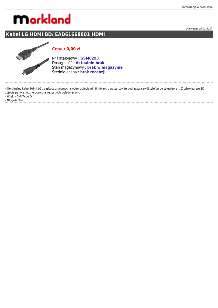 Informacje o produkcie Utworzono 03-03-2017 Kabel LG HDMI BD/ EAD61668801 HDMI Cena : 0,00 zł Nr katalogowy : GSM0293 Dostępność : Aktualnie brak Stan magazynowy : brak w magazynie Średnia ocena : brak recenzji - Oryginalny kabel Hdmi LG , zaskocz znajomych swoimi zdjęciami i filmikami , wystarczy że podłączysz swój telefon do telewizora! . Z telewizorem 3D zdjęcia panoramiczne oczarują wszystkich oglądających. - Wtyk HDMI Typu D - Długość 2m