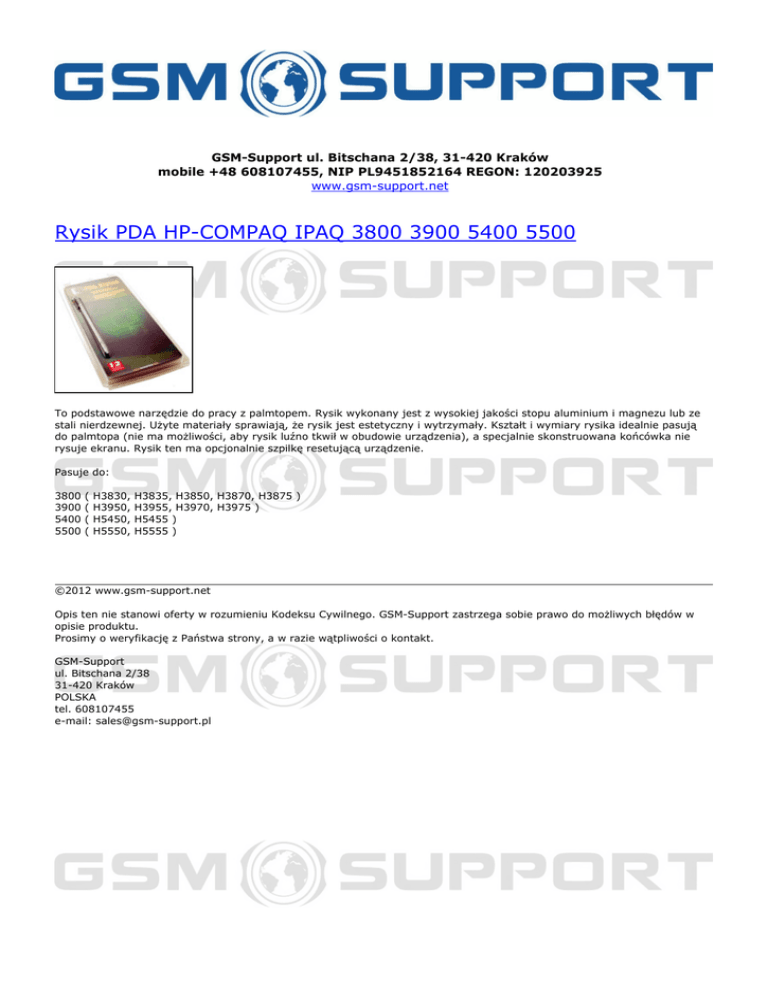 GSM-Support ul. Bitschana 2/38, 31-420 Kraków mobile +48 608107455, NIP PL9451852164 REGON: 120203925 www.gsm-support.net Rysik PDA HP-COMPAQ IPAQ 3800 3900 5400 5500 To podstawowe narzędzie do pracy z palmtopem. Rysik wykonany jest z wysokiej jakości stopu aluminium i magnezu lub ze stali nierdzewnej. Użyte materiały sprawiają, że rysik jest estetyczny i wytrzymały. Kształt i wymiary rysika idealnie pasują do palmtopa (nie ma możliwości, aby rysik luźno tkwił w obudowie urządzenia), a specjalnie skonstruowana końcówka nie rysuje ekranu. Rysik ten ma opcjonalnie szpilkę resetującą urządzenie. Pasuje do: 3800 3900 5400 5500 ( ( ( ( H3830, H3950, H5450, H5550, H3835, H3850, H3870, H3875 ) H3955, H3970, H3975 ) H5455 ) H5555 ) ©2012 www.gsm-support.net Opis ten nie stanowi oferty w rozumieniu Kodeksu Cywilnego. GSM-Support zastrzega sobie prawo do możliwych błędów w opisie produktu. Prosimy o weryfikację z Państwa strony, a w razie wątpliwości o kontakt. GSM-Support ul. Bitschana 2/38 31-420 Kraków POLSKA tel. 608107455 e-mail: [email protected] Powered by TCPDF (www.tcpdf.org)