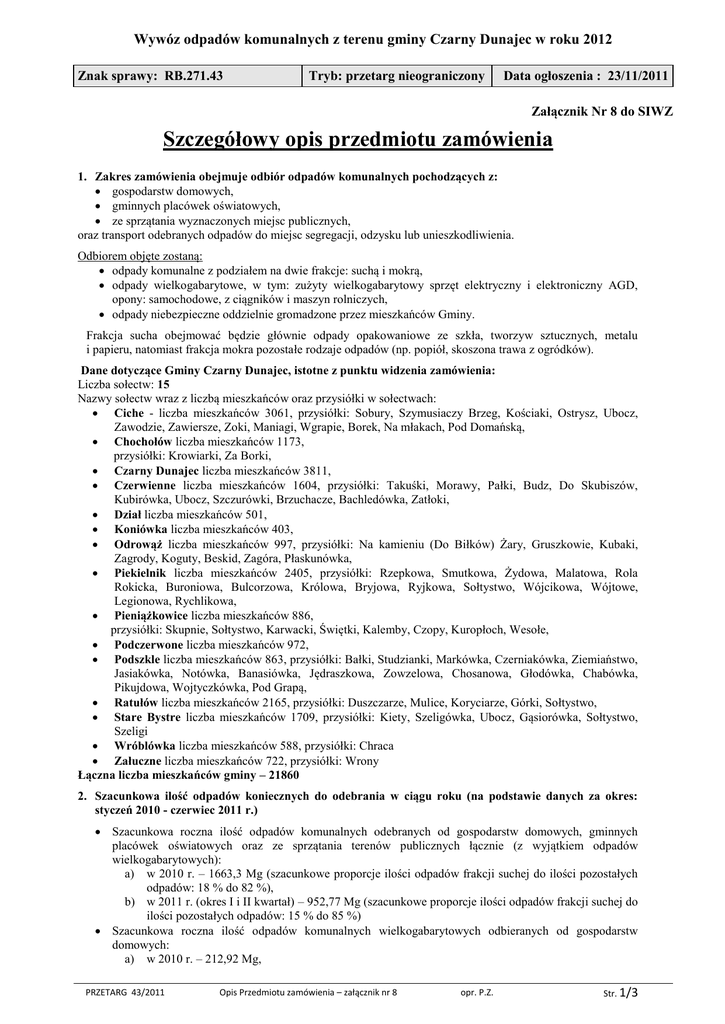 Wywóz odpadów komunalnych z terenu gminy Czarny Dunajec w roku 2012 Znak sprawy: RB.271.43 Tryb: przetarg nieograniczony Data ogłoszenia : 23/11/2011 Załącznik Nr 8 do SIWZ Szczegółowy opis przedmiotu zamówienia 1. Zakres zamówienia obejmuje odbiór odpadów komunalnych pochodzących z: gospodarstw domowych, gminnych placówek oświatowych, ze sprzątania wyznaczonych miejsc publicznych, oraz transport odebranych odpadów do miejsc segregacji, odzysku lub unieszkodliwienia. Odbiorem objęte zostaną: odpady komunalne z podziałem na dwie frakcje: suchą i mokrą, odpady wielkogabarytowe, w tym: zużyty wielkogabarytowy sprzęt elektryczny i elektroniczny AGD, opony: samochodowe, z ciągników i maszyn rolniczych, odpady niebezpieczne oddzielnie gromadzone przez mieszkańców Gminy. Frakcja sucha obejmować będzie głównie odpady opakowaniowe ze szkła, tworzyw sztucznych, metalu i papieru, natomiast frakcja mokra pozostałe rodzaje odpadów (np. popiół, skoszona trawa z ogródków). Dane dotyczące Gminy Czarny Dunajec, istotne z punktu widzenia zamówienia: Liczba sołectw: 15 Nazwy sołectw wraz z liczbą mieszkańców oraz przysiółki w sołectwach: Ciche - liczba mieszkańców 3061, przysiółki: Sobury, Szymusiaczy Brzeg, Kościaki, Ostrysz, Ubocz, Zawodzie, Zawiersze, Zoki, Maniagi, Wgrapie, Borek, Na młakach, Pod Domańską, Chochołów liczba mieszkańców 1173, przysiółki: Krowiarki, Za Borki, Czarny Dunajec liczba mieszkańców 3811, Czerwienne liczba mieszkańców 1604, przysiółki: Takuśki, Morawy, Pałki, Budz, Do Skubiszów, Kubirówka, Ubocz, Szczurówki, Brzuchacze, Bachledówka, Zatłoki, Dział liczba mieszkańców 501, Koniówka liczba mieszkańców 403, Odrowąż liczba mieszkańców 997, przysiółki: Na kamieniu (Do Biłków) Żary, Gruszkowie, Kubaki, Zagrody, Koguty, Beskid, Zagóra, Płaskunówka, Piekielnik liczba mieszkańców 2405, przysiółki: Rzepkowa, Smutkowa, Żydowa, Malatowa, Rola Rokicka, Buroniowa, Bulcorzowa, Królowa, Bryjowa, Ryjkowa, Sołtystwo, Wójcikowa, Wójtowe, Legionowa, Rychlikowa, Pieniążkowice liczba mieszkańców 886, przysiółki: Skupnie, Sołtystwo, Karwacki, Świętki, Kalemby, Czopy, Kuropłoch, Wesołe, Podczerwone liczba mieszkańców 972, Podszkle liczba mieszkańców 863, przysiółki: Bałki, Studzianki, Markówka, Czerniakówka, Ziemiaństwo, Jasiakówka, Notówka, Banasiówka, Jędraszkowa, Zowzelowa, Chosanowa, Głodówka, Chabówka, Pikujdowa, Wojtyczkówka, Pod Grapą, Ratułów liczba mieszkańców 2165, przysiółki: Duszczarze, Mulice, Koryciarze, Górki, Sołtystwo, Stare Bystre liczba mieszkańców 1709, przysiółki: Kiety, Szeligówka, Ubocz, Gąsiorówka, Sołtystwo, Szeligi Wróblówka liczba mieszkańców 588, przysiółki: Chraca Załuczne liczba mieszkańców 722, przysiółki: Wrony Łączna liczba mieszkańców gminy – 21860 2. Szacunkowa ilość odpadów koniecznych do odebrania w ciągu roku (na podstawie danych za okres: styczeń 2010 - czerwiec 2011 r.) Szacunkowa roczna ilość odpadów komunalnych odebranych od gospodarstw domowych, gminnych placówek oświatowych oraz ze sprzątania terenów publicznych łącznie (z wyjątkiem odpadów wielkogabarytowych): a) w 2010 r. – 1663,3 Mg (szacunkowe proporcje ilości odpadów frakcji suchej do ilości pozostałych odpadów: 18 % do 82 %), b) w 2011 r. (okres I i II kwartał) – 952,77 Mg (szacunkowe proporcje ilości odpadów frakcji suchej do ilości pozostałych odpadów: 15 % do 85 %) Szacunkowa roczna ilość odpadów komunalnych wielkogabarytowych odbieranych od gospodarstw domowych: a) w 2010 r. – 212,92 Mg, PRZETARG 43/2011 Opis Przedmiotu zamówienia – załącznik nr 8 opr. P.Z. Str. 1/3 Wywóz odpadów komunalnych z terenu gminy Czarny Dunajec w roku 2012 Znak sprawy: RB.271.43 Tryb: przetarg nieograniczony Data ogłoszenia : 23/11/2011 b) w 2011 r. (okres I i II kwartał) – 126,93 Mg. 3. Zakres usług 3.1 Odbiór odpadów komunalnych posegregowanych na frakcje oraz ze sprzątania terenów publicznych: 1. Odbiór odpadów komunalnych z zapewnieniem oddzielnego odbioru odpadów komunalnych frakcji suchej oraz frakcji mokrej z częstotliwością: 1 raz na miesiąc. Odbiór odpadów w foliowych workach o kolorach: - niebieski dla frakcji suchej, - czarny dla frakcji mokrej, wystawionych przez mieszkańców na pobocza dróg przebiegających przez tereny zabudowane. Usługa obejmuje zapewnienie przez Wykonawcę dojazdu do osiedli trudno dostępnych (szczególnie zimą w przypadkach tego wymagających) poprzez zorganizowanie dodatkowych środków transportu (traktor, mały samochód). Usługa nie obejmuje dostarczenia worków mieszkańcom. Usługa obejmuje również odbiór odpadów komunalnych, w przypadku gdy zostaną wystawione przez właścicieli – gospodarstwa domowe – w przystosowanych do tego pojemnikach, oznakowanych: frakcja sucha i mokra. Transport odpadów frakcji suchej do miejsca segregacji, w celu uzyskania i przekazania do odzysku surowców wtórnych w postaci: szkła, tworzyw sztucznych i metalu, papieru i kartonu, w tym odpadów opakowaniowych – z zachowaniem przepisów o gospodarowaniu odpadami. Transport odpadów frakcji mokrej do miejsca unieszkodliwiania/odzysku/segregacji – z zachowaniem warunku, iż co najmniej 50 % (wagowo) odebranych odpadów ulegających biodegradacji zostanie zagospodarowana w sposób inny niż składowanie na składowisku odpadów. Uwaga: usługa obejmuje również odbiór odpadów komunalnych (w workach lub z pojemników) pochodzących z: a) Szkoły Podstawowe: Chochołów, Ciche, Czarny Dunajec, Czerwienne Dolne, Czerwienne Górne, Odrowąż, Piekielnik, Pieniążkowice, Podczerwone, Podszkle, Ratułów, Stare Bystre 1, Stare Bystre 2, b) Gimnazja: Ciche, Czarny Dunajec, Piekielnik, Stare Bystre, Załuczne, c) Przedszkola: Czarny Dunajec. 2. Odbiór odpadów komunalnych pochodzących z osiedli Romskich w m. Czarny Dunajec w ilości max. 5,5 m3 miesięcznie. Usługa obe