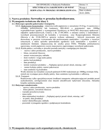 SM SPOMLEK w Radzyniu Podlaskim SPECYFIKACJA JAKOŚCIOWA SP-WP/07 SERWATKA W PROSZKU HYDROLIZOWANA Strona 1/4 Wersja 1 Data wydania: 20.01.2009r. 1. Nazwa produktu: Serwatka w proszku hydrolizowana. 2. Wymagania techniczne dla klasy I. 2.1. Dotyczące sposobu pakowania i transportu. 2.1.1. Opakowanie bezpośrednie - stanowią worki papierowe o zawartości 25.0 kg, 4 warstwowe z wkładką polietylenową lub kontenery BIG-BAG o pojemności max 1000kg wyprodukowane zgodnie z wymaganiami Dyrektywy nr 94/62/WE dotyczącej opakowań i odpadów opakowaniowych, Ustawy z dn. 27.08.2003r. o zmianie ustawy o materiałach i wyrobach przeznaczonych do kontaktu z Ŝywnością oraz Rozporządzeniem Ministra Zdrowia z dn. 22.06.2007r.w sprawie wykazu substancji , których stosowanie jest dozwolone w procesie wytwarzania lub przetwarzania materiałów i wyrobów z tworzyw sztucznych, a takŜe sposobu sprawdzania zgodności tych materiałów i wyrobów z ustalonymi limitami. (dopuszczoną do uŜytku przez PZH). Wkładka polietylenowa zgrzewana, worek papierowy zszyty maszynowo zapewniający szczelność pakowania. 2.1.2. KaŜda paleta z serwatką w proszku posiada metrykę z następującymi danymi: − nazwa i adres producenta , nazwa produktu − klasa, zawartość tłuszczu − numer weterynaryjny zakładu − ilość worków i waga netto palety − partia, kod produkcji − data produkcji − termin waŜności produktu : „ Najlepiej spoŜyć przed: dzień, miesiąc, rok” − numer kolejny palety, numer pakowacza − inne ustalenia wg kontraktu Worki ułoŜone na wizualnie czystych paletach EURO maksimum po 1000kg owinięte folią stretch nie wystające poza obręby palety. Inne ustalenia wg kontraktu z odbiorcą. 2.1.3. Transport. Realizowany tylko specjalistycznymi środkami transportu zabezpieczającymi produkt przed uszkodzeniem, zawilgoceniem oraz innymi szkodliwymi wpływami otoczenia. Aktualna ksiąŜka sanitarna pojazdu. 2.2. Dotyczące oznakowania. - nazwa i adres producenta , nazwa produktu - klasa jakości, zawartość tłuszczu - warunki przechowywania - masa netto - data minimalnej trwałości : „Najlepiej spoŜyć przed: dzień, miesiąc, rok” - nr partii, data produkcji - numer identyfikacyjny zakładu - pozostałe wymagania zgodnie z podpisanym kontraktem. 3. Wymagania dotyczące cech organoleptycznych, chemicznych SM SPOMLEK w Radzyniu Podlaskim SPECYFIKACJA JAKOŚCIOWA SP-WP/07 SERWATKA W PROSZKU HYDROLIZOWANA Strona 2/4 Wersja 1 Data wydania: 20.01.2009r. i mikrobiologicznych CECHY ORGANOLEPTYCZNE Lp. Cechy Parametry jakościowe Instrukcja badawcza lub PN /częstotliwość badań/ 1 Wygląd Proszek sypki, puszysty, jednolity, dopuszczalne lekkie zbrylenie, łatwo rozsypujące się pod naciśnięciem palcem PB-QL/C/05 PB-QL/C/05 2 Barwa biała do lekko kremowej, jednolita 3 Smak i zapach smak słodkawy, wyczuwalna lekka goryczka, posmak pasteryzacji typowy dla serwatki w proszku, bez obcych posmaków i zapachów PB-QL/C/05 PB-QL/C/28 4 Zanieczyszczenie mechaniczne brak, dopuszcza się cząstki przypalone wg wzorca A, B, C CECHY FIZYKO- CHEMICZNE 5 Zawartość wody, %, nie więcej niŜ 4.0 PB-QL/C/26 6 Zawartość tłuszczu, %, nie więcej niŜ 1.5 PN-EN ISO 1736 7 Białko, % nie mniej niŜ 10 PN-EN ISO 8968-2 8 Laktoza ,% nie mniej niŜ 70 PB-NL/04 met. instrumentalna 9 Popiół, % nie więcej niŜ 8.5 PN-78/A-86030 10 Kwasowość serwatki regenerowanej w °SH nie więcej niŜ 6.0-8.0 11 Kwasowość serwatki regenerowanej , w procentach kwasu mlekowego nie więcej niŜ 0,16 PN-78/A-86030 PB-QL/C/29 SM SPOMLEK w Radzyniu Podlaskim SPECYFIKACJA JAKOŚCIOWA SP-WP/07 SERWATKA W PROSZKU HYDROLIZOWANA 12 Wskaźnik rozpuszczalności wyraŜony w cm3 osadu, nie więcej niŜ 13 Zawartość metali szkodliwych Strona 3/4 Wersja 1 Data wydania: 20.01.2009r. 0,5 zgodnie z Rozporządzeniem 1881/2006/WE 14. Zanieczyszczenia antybiotykami i innymi substancjami hamującymi 15. Zawartość pestycydów PB-QL/C/27 Metoda absorbcyjnej spektometrii atomowej PB-QL/M/12 nieobecne zgodnie z Rozporządzeniem 396/2005 CECHY MIKROBIOLOGICZNE 16. Ogólna liczba drobnoustrojów w jtk/g, nie więcej niŜ 50000 PN-EN ISO 4833 17. Salmonella w 25g nieobecne n=5 c=0 PN-EN ISO 6579 18. Listeria monocytogenes w 25g nieobecna n=5 c=0 PN-EN ISO 11290-1 19. Staphylococcus aureus w jtk /g m=10 M=100 n=5 c=2 PN –EN ISO 6888-2 20. Enterobacteriaceae w jtk/g m=M=10 n=5 c=0 max 100 m=0,M=10 n=5 c=2 21. Pleśnie i droŜdŜe w jtk/g 22. Bakterie z gr. coli PN-ISO 21528-2 PN- ISO 7954 PN- ISO 4832 Wartość odŜywcza 100g produktu 1. Białko (g) 11,5 2. Węglowodany (g) 76,5 3. Tłuszcz (g) 0,95 4. Woda 2,75 Wartość energetyczna (g) Wartość energetyczna 100g produktu (kJ) 1510 Wartość energetyczna (kcal) 361 SM SPOMLEK w Radzyniu Podlaskim SPECYFIKACJA JAKOŚCIOWA SP-WP/07 SERWATKA W PROSZKU HYDROLIZOWANA Strona 4/4 Wersja 1 Data wydania: 20.01.2009r. 4. Przechowywanie 4.1. Warunki przechowywania Serwatka w proszku naleŜy przechowywać w suchych, czystych i przewiewnych magazynach na paletach, najlepiej w odległości co najmniej 10cm od ścian. Temp. nie powinna przekraczać 20°C, przy wilg. względnej nie przekraczającej 75%. 4.2. Okres przechowywania Serwatka w proszku w workach papierowych z wkładką polietylenową naleŜy przechowywać w warunkach jak w pkt. 4.1. 6 miesięcy od daty produkcji. 5. Deklaracja zgodności Specyfikacja jest zgodna z obowiązującymi przepisami prawnymi. 6. Dokumenty związane Mleko i przetwory mleczarskie. Pobieranie prób.-PN-86/A-86041 Mleko i przetwory mleczarskie. Mleko w proszku. Metody badań -PN-78/A-86030, PN-EN ISO 1736, PN-EN ISO 8968-2 Mleko i przetwory mleczne. Wytyczne pobierania prób PN-EN ISO 707 Normy mikrobiologiczne PN-EN ISO 4833, PN-EN ISO 6579, PN-EN ISO 11290-1, PN-EN ISO 6888-2, PN-ISO 21528-2, PN-ISO 7954, PN-ISO 4832 Procedura badawcza- PB-QL /C/20,PB-QL/C/05, PB-QL/C/28, PB-QL/C/26, PB-NL/04, PB-QL/C/29, PB-QL/C/27, PB-QL/M/12 DATA 20.01.2009r OPRACOWA