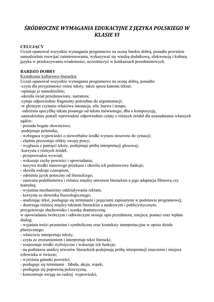 ŚRÓDROCZNE WYMAGANIA EDUKACYJNE Z JĘZYKA POLSKIEGO W KLASIE VI CELUJĄCY Uczeń opanował wszystkie wymagania programowe na ocenę bardzo dobrą, ponadto powinien samodzielnie rozwijać zainteresowania, wykazywać się wiedzą dodatkową, elokwencją i kulturą języka w przekazywaniu wiadomości, uczestniczyć w konkursach przedmiotowych. BARDZO DOBRY Kształcenie kulturowo-literackie Uczeń opanował wszystkie wymagania programowe na ocenę dobrą, ponadto: -czyta dla przyjemności różne teksty, także spoza kanonu lektur; -opiniuje je samodzielnie; -określa świat przedstawiony, narratora; -cytuje odpowiednie fragmenty potrzebne do argumentacji; -w głośnym czytaniu właściwa intonacja, siła, barwa i tempo, -odróżnia specyfikę tekstu pisanego od tekstu mówionego, dba o kompozycję, -samodzielnie potrafi wprowadzić odpowiednie cytaty z różnych źródeł dla uzasadnienia własnych sądów; - posiada bogate słownictwo; -podejmuje polemikę, - wzbogaca wypowiedzi o niewerbalne środki wyrazu stosowne do sytuacji; - chętnie prezentuje efekty swojej pracy; - wygłasza z pamięci teksty, podejmuje próbę interpretacji głosowej; -korzysta z różnych źródeł; - przeprowadza wywiad; - wskazuje cechy powieści i opowiadania; - nazywa środki masowego przekazu i określa ich podstawowe funkcje; - określa rodzaje czasopism; - odróżnia język potoczny od literackiego; - zauważa podobieństwa i różnice między utworem literackim a jego adaptacja filmową czy teatralną; - wyjaśnia mechanizmy oddziaływania reklam; - korzysta ze słownika frazeologicznego; - analizując tekst, posługuje się terminami i pojęciami zapisanymi w podstawie programowej; - dostrzega różnicę między tekstem literackim a naukowym i publicystycznym; przygotowuje słuchowisko i scenkę dramatyczną; w opowiadaniu twórczym i odtwórczym stosuje opis przedmiotu, miejsca, postaci oraz wplata dialog; - wyjaśnia treści przenośne i symboliczne oraz konteksty interpretacyjne w opisie dzieła plastycznego; - właściwie interpretuje teksty; - czyta ze zrozumieniem i interpretuje tekst literacki; - rozpoznaje środki stylistyczne i wskazuje ich funkcje; - na podstawie analizy utworów literackich podejmuję próbę interpretacji znaczenia i miejsca człowieka w świecie; - wyróżnia gatunki powieści; - posługuje się terminami : fabuła, akcja, wątek; - posługuje się poprawną polszczyzną, - koncentruje uwagę na cudzej wypowiedzi, - rozpoznaje intencję mówiącego z intonacji głosu, -samodzielnie określa tematykę słyszanego tekstu, podaje szczegóły treści. Nauka o języku Uczeń opanował wszystkie wymagania programowe na ocenę dobrą, ponadto: -przestrzega form wypowiedzi odpowiednio do treści, tworzy: opowiadanie, list, zaproszenie, ogłoszenie, zawiadomienie, opis, sprawozdanie, list oficjalny dziennik, pamiętnik, -pisze poprawnie pod względem językowym, ortograficznym i interpunkcyjnym; -właściwie stosuje akapity, - zachowuje logiczny tok myślenia w wypowiedziach, -swobodnie korzysta z wiedzy przy poszerzaniu wiadomości o częściach mowy, - dokonuje rozbioru gramatycznego i logicznego wypowiedzenia pojedynczego, rysuje wykres; - stosuje zasady koniugacji i deklinacji; -bez trudu rozpoznaje części mowy i ich formy; rozróżnia części zdania i rodzaje zdań; - zna rodzaje zdań złożonych; - rozpoznaje zdanie bezpodmiotowe; - tworzy rodzinę wyrazów i bada budowę słowotwórczą wyrazu - potrafi zinterpretować związki frazeologiczne i zastosować je; - w zakresie ortografii doskonali umiejętności nabyte w klasach poprzednich oraz : - przenosi wyrazy zawierające przedrostek; - stosuje zasady pisowni „nie” z różnymi częściami mowy; - pisze poprawnie liczebniki; - stosuje zasady interpunkcyjne poznane w klasach 4 i 5. - poprawnie zapisuje przedrostki; - stosuje zasady pisowni i, j po przedrostkach zakończonych na spółgłoskę. -wykorzystuje właściwie słowniki. DOBRY Kształcenie kulturowo-literackie Uczeń opanował wszystkie wymagania programowe na ocenę dostateczną, ponadto: - uczestniczy w sytuacji komunikacyjnej; - buduje spójne i logiczne wypowiedzi, posługując się poprawnym słownictwem; - uczestniczy w dyskusji na dany temat, przedstawia logiczne, rzeczowe argumenty, stara się przekonać uczestników dyskusji do przyjęcia jego stanowiska; - wzbogaca wypowiedzi o niewerbalne środki wyrazu stosowne do sytuacji; - mówi o swoich przeżyciach w danej sytuacji , nazywa przeżycia bohatera literackiego; - charakteryzuje i ocenia bohatera literackiego; - wygłasza z pamięci teksty i dobiera odpowiednio barwę i ton głosu; - zwraca uwagę na poprawność językową i stylistyczną swoich wypowiedzi; - przeprowadza wywiad; - czyta ze zrozumieniem tekst literacki; - rozpoznaje środki stylistyczne i wskazuje ich funkcje; - wyróżnia gatunki powieści; - posługuje się terminami : fabuła, akcja, wątek; - wyszukuje i określa elementy świata przedstawionego w literaturze; - wskazuje rymy i odróżnia ich rodzaje; - wskazuje cechy powieści i opowiadania; - nazywa środki masowego przekazu i określa ich podstawowe funkcje; - określa rodzaje czasopism; - odróżnia język potoczny od literackiego; - zauważa podobieństwa i różnicę między utworem literackim a jego adaptacja filmową czy teatralną; - zauważa w tekście reklamy słownictwo wyrażające perswazję; - korzysta ze słownika frazeologicznego; - analizując tekst posługuje się większością terminów i pojęć zapisanych w podstawie programowej; - koncentruje się na słuchaniu wypowiedzi rozmówców; - przygotowuje słuchowisko i scenkę dramatyczną; - krytycznie słucha wypowiedzi; - ocenia wypowiedź swoją i innych; - streszcza tekst w porządku chronologicznym; - konstruuje szczegółowy plan wydarzeń; - dba o estetykę zapisu; - charakteryzuje postać i ocenia jej postępowanie i dostrzega motywy działania; Nauka o języku Uczeń opanował wszystkie wymagania