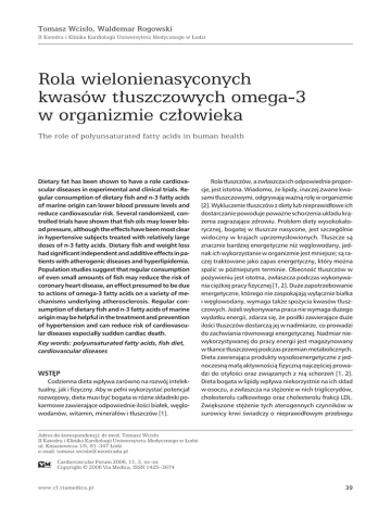 Tomasz Wcisło, Waldemar Rogowski II Katedra i Klinika Kardiologii Uniwersytetu Medycznego w Łodzi Rola wielonienasyconych kwasów tłuszczowych omega-3 w organizmie człowieka The role of polyunsaturated fatty acids in human health Dietary fat has been shown to have a role cardiovascular diseases in experimental and clinical trials. Regular consumption of dietary fish and n-3 fatty acids of marine origin can lower blood pressure levels and reduce cardiovascular risk. Several randomized, controlled trials have shown that fish oils may lower blood pressure, although the effects have been most clear in hypertensive subjects treated with relatively large doses of n-3 fatty acids. Dietary fish and weight loss had significant independent and additive effects in patients with atherogenic diseases and hyperlipidemia. Population studies suggest that regular consumption of even small amounts of fish may reduce the risk of coronary heart disease, an effect presumed to be due to actions of omega-3 fatty acids on a variety of mechanisms underlying atherosclerosis. Regular consumption of dietary fish and n-3 fatty acids of marine origin may be helpful in the treatment and prevention of hypertension and can reduce risk of cardiovascular diseases especially sudden cardiac death. Key words: polyunsaturated fatty acids, fish diet, cardiovascular diseases WSTĘP Codzienna dieta wpływa zarówno na rozwój intelektualny, jak i fizyczny. Aby w pełni wykorzystać potencjał rozwojowy, dieta musi być bogata w różne składniki pokarmowe zawierające odpowiednie ilości białek, węglowodanów, witamin, minerałów i tłuszczów [1]. Rola tłuszczów, a zwłaszcza ich odpowiednie proporcje, jest istotna. Wiadomo, że lipidy, inaczej zwane kwasami tłuszczowymi, odgrywają ważną rolę w organizmie [2]. Wykluczenie tłuszczów z diety lub nieprawidłowe ich dostarczanie powoduje poważne schorzenia układu krążenia zagrażające zdrowiu. Problem diety wysokokalorycznej, bogatej w tłuszcze nasycone, jest szczególnie widoczny w krajach uprzemysłowionych. Tłuszcze są znacznie bardziej energetyczne niż węglowodany, jednak ich wykorzystanie w organizmie jest mniejsze; są raczej traktowane jako zapas energetyczny, który można spalić w późniejszym terminie. Obecność tłuszczów w pożywieniu jest istotna, zwłaszcza podczas wykonywania ciężkiej pracy fizycznej [1, 2]. Duże zapotrzebowanie energetyczne, którego nie zaspokajają wyłącznie białka i węglowodany, wymaga także spożycia kwasów tłuszczowych. Jeżeli wykonywana praca nie wymaga dużego wydatku energii, zdarza się, że posiłki zawierające duże ilości tłuszczów dostarczą jej w nadmiarze, co prowadzi do zachwiania równowagi energetycznej. Nadmiar niewykorzystywanej do pracy energii jest magazynowany w tkance tłuszczowej podczas przemian metabolicznych. Dieta zawierająca produkty wysokoenergetyczne z jednoczesną małą aktywnością fizyczną najczęściej prowadzi do otyłości oraz związanych z nią schorzeń [1, 2]. Dieta bogata w lipidy wpływa niekorzystnie na ich skład w osoczu, a zwłaszcza na stężenie w nich triglicerydów, cholesterolu całkowitego oraz cholesterolu frakcji LDL. Zwiększone stężenie tych aterogennych czynników w surowicy krwi świadczy o nieprawidłowym przebiegu Adres do korespondencji: dr med. Tomasz Wcisło II Katedra i Klinika Kardiologii Uniwersytetu Medycznego w Łodzi ul. Kniaziewicza 1/5, 91–347 Łódź e-mail: [email protected] Cardiovascular Forum 2006, 11, 3, xx–xx Copyright © 2006 Via Medica, ISSN 1425–3674 www.cf.viamedica.pl 39 Cardiovascular Forum 2006, tom 11, nr 3 przemiany lipidów w organizmie i predysponuje do rozwoju zmian miażdżycowych [3]. Można temu zapobiegać, stosując zarówno w prewencji pierwotnej, jak i wtórnej wielonienasycone kwasy tłuszczowe z rodziny omega-3 oraz omega-6, czyli takie, które mają co najmniej 2 wiązania podwójne między atomami węgla (PUFA, polyunsaturated fatty acids) [2–4]. Głównymi przedstawicielami kwasów wielonienasyconych z rodziny omega-3 są: — kwas alfa-linolenowy (ALA, alpha linolenic acid) zawarty w siemieniu lnianym, oleju lnianym, orzechach włoskich oraz w oleju rzepakowym i sojowym, zapewniający korzystną modyfikację błon komórkowych [5, 6]; — kwas dokozaheksaenowy (DHA, docosahexaenoic acid) i kwas eikozapentanowy (EPA, eikosapentaenoic acid) występujące w tłustych rybach oceanicznych lub wodorostach [5]. Kwasy te są bardzo ważne dla organizmu ludzkiego; DHA jest szczególnie istotny w prawidłowym funkcjonowaniu mózgu (kora mózgowa zbudowana jest w około 60% z DHA) oraz do budowy tak zwanych neurotransmiterów, stanowiąc budulec do produkcji serotoniny i dopaminy [5]. Dodając DHA do codziennego jadłospisu, można korzystnie wpłynąć na samopoczucie i zdrowie. Równie ważnym kwasem obok DHA jest EPA, który warunkuje prawidłową syntezę eikozanoidów (prostaglandyny, prostacykliny, leukotrieny i tromboksany); są to aktywnie biologicznie cząsteczki, zwane hormonami tkankowymi, uwalniane z błon komórkowych, które z kolei są zbudowane z fosfolipidów [1, 5]. Eikozanoidy są odpowiedzialne za działanie przeciwzakrzepowe i przeciwzapalne, powstrzymują rozwój nowotworów oraz wpływają na kurczliwość naczyń krwionośnych [1, 2]. Są one konieczne w prawidłowym rozwoju organizmu oraz utrzymaniu przez całe życie dobrego stanu zdrowia. Wchodzą nie tylko w skład tkanek, lecz są potrzebne również do prawidłowego transportu lipidów w ustroju. Będąc prekursorami prostagladyn i ich pochodnych, wykazują zdolności do zapobiegania powstawaniu zakrzepów oraz poprawy parametrów lipidowych surowicy krwi i profilaktyki miażdżycy [3–5]. Spożywanie kwasów wielonienasyconych z rodziny omega-3 (DHA i EPA) korzystnie wpływa na wiele schorzeń, takich jak: choroba niedokrwienna serca, nadciśnienie tętnicze, zakrzepica, miażdżyca oraz nowotwory. Dodatkowo może mo