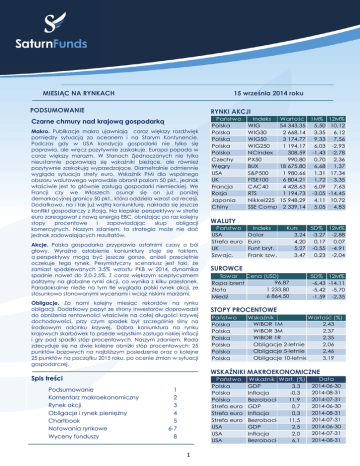 MIESIĄC NA RYNKACH 15 września 2014 roku PODSUMOWANIE RYNKI AKCJI Czarne chmury nad krajową gospodarką Państw o Polska Polska Polska Polska Polska Czechy Węgry USA UK Francja Rosja Japonia Chiny Makro. Publikacje makro ujawniają coraz większy rozdźwięk pomiędzy sytuacją za oceanem i na Starym Kontynencie. Podczas gdy w USA kondycja gospodarki nie tylko się poprawia, ale wręcz pozytywnie zaskakuje, Europa popada w coraz większy marazm. W Stanach Zjednoczonych nie tylko nieustannie poprawiają się wskaźniki bieżące, ale również pozytywnie zaskakują wyprzedzające. Diametralnie odmiennie wygląda sytuacja strefy euro. Wskaźnik PMI dla wspólnego obszaru walutowego wprawdzie obronił poziom 50 pkt., jednak właściwie jest to głównie zasługą gospodarki niemieckiej. We Francji czy we Włoszech osunął się on już poniżej demarkacyjnej granicy 50 pkt., która oddziela wzrost od recesji. Dodatkowo, na i tak już wątłą koniunkturę, nakłada się jeszcze konflikt gospodarczy z Rosją. Na kiepskie perspektywy w strefie euro zareagował z nową energią EBC, obniżając po raz kolejny stopy procentowe i zapowiadając skup obligacji komercyjnych. Naszym zdaniem, ta strategia może nie dać jednak zadowalających rezultatów. Akcje. Polska gospodarka przyprawia ostatnimi czasy o ból głowy. Wyraźne osłabienie koniunktury staje się faktem, a perspektywy mogą być jeszcze gorsze, aniżeli przeciętnie oczekuje tego rynek. Pesymistyczny scenariusz jest taki, że zamiast spodziewanych 3,5% wzrostu PKB w 2014, dynamika spadnie nawet do 2,0-2,5%. Z coraz większym sceptycyzmem patrzymy na globalne rynki akcji, co wynika z kilku przesłanek. Paradoksalnie nieźle na tym tle wygląda polski rynek akcji, ze stosunkowo stonowanymi wycenami i wciąż niskimi marżami. Obligacje. Za nami kolejny miesiąc rekordów na rynku obligacji. Dodatkowy popyt ze strony inwestorów doprowadził do obniżenia rentowności właściwie na całej długości krzywej dochodowości, przy czym spadek był szczególnie silny na środkowym odcinku krzywej. Dobra koniunktura na rynku krajowych skarbówek to przede wszystkim zasługa niskiej inflacji i gry pod spadki stóp procentowych. Naszym zdaniem, Rada zdecyduje się na dwie kolejne obniżki stóp procentowych: 25 punktów bazowych na najbliższym posiedzenie oraz o kolejne 25 punktów na początku 2015 roku, po ocenie zmian w sytuacji gospodarczej. 12M% 10,12 6,12 7,56 -2,93 -2,78 2,36 1,37 17,34 3,35 7,63 -14,45 10,72 4,83 WALUTY Państw o USA Strefa euro UK Szw ajc. Indeks Dolar Euro Funt bryt. Frank szw . Kurs 5D% 12M% 3,24 -3,27 -2,88 4,20 0,17 0,07 5,27 -0,55 -4,91 3,47 0,23 -2,04 SUROWCE Tow ar Cena (USD) 96,87 Ropa brent 1 233,80 Złoto 6 864,50 Miedź 5D% 12M% -6,43 -14,11 -5,42 -5,70 -1,59 -2,35 STOPY PROCENTOWE Państw o Polska Polska Polska Polska Polska Polska Wskaźnik Wartość (%) WIBOR 1M 2,43 WIBOR 3M 2,37 WIBOR 1R 2,35 Obligacje 2-letnie 2,06 Obligacje 5-letnie 2,46 Obligacje 10-letnie 3,19 WSKAŹNIKI MAKROEKONOMICZNE Spis treści Podsumowanie Komentarz makroekonomiczny Rynek akcji Obligacje i rynek pieniężny Chartbook Notowania rynkowe Wyceny funduszy Indeks Wartość 1M% WIG 54 343,35 5,50 WIG30 2 668,14 3,35 WIG50 3 174,77 9,33 WIG250 1 194,17 6,03 NCIndex 308,59 -1,43 PX50 990,80 0,70 BUX 18 675,80 6,68 S&P500 1 980,66 1,31 FTSE100 6 804,21 1,72 CAC40 4 428,63 6,09 RTS 1 194,73 -3,05 Nikkei225 15 948,29 4,11 SSE Comp. 2 339,14 5,05 Państw o Polska Polska Polska Strefa euro Strefa euro Strefa euro USA USA USA 1 2 3 4 5 6-7 8 1 Wskaźnik Wart. (%) GDP 3,3 Inflacja -0,3 Bezrobocie 11,9 GDP 0,7 Inflacja 0,3 Bezrobocie 11,5 GDP 2,5 Inflacja 2,0 Bezrobocie 6,1 Data 2014-06-30 2014-08-31 2014-07-31 2014-06-30 2014-08-31 2014-07-31 2014-06-30 2014-07-31 2014-08-31 KOMENTARZ MAKROEKONOMICZNY KOMENTARZ ŚREDNIA PROGNOZ DLA POLSKIEGO PKB Nożyce między USA a Europą coraz szersze Publikacje makro ujawniają coraz większy rozdźwięk pomiędzy sytuacją za oceanem i na Starym Kontynencie. Podczas gdy w USA kondycja gospodarki nie tylko się poprawia, ale wręcz pozytywnie zaskakuje, Europa popada w coraz większy marazm. W Stanach Zjednoczonych nie tylko nieustannie poprawiają się wskaźniki bieżące, ale również pozytywnie zaskakują wyprzedzające. Wskaźnik ISM wzrósł ostatnio do poziomu 59 punktów, czyli najwyżej od 2011 roku. Dodatkowo, subindeksy wskazują na bardzo dobre odczyty tych wskaźników, które najlepiej obrazują nadchodzącą przyszłość. Na przykład, wskaźnik nowych zamówień poszybował aż do 66,7 pkt. Wbrew powszechnym sądom, nie najgorzej ma się również rynek pracy. Jeżeli utrzyma się poziomu przyrostu nowych miejsc pracy, to na koniec roku amerykańska gospodarka będzie wytwarzać najwięcej płatnych etatów od 15 lat. Diametralnie odmiennie wygląda sytuacja strefy euro. Wskaźnik PMI dla wspólnego obszaru walutowego wprawdzie obronił poziom 50 pkt., jednak właściwie jest to głównie zasługą gospodarki niemieckiej. We Francji czy we Włoszech osunął się on już poniżej demarkacyjnej granicy 50 pkt., która oddziela wzrost od recesji. Dodatkowo, na i tak już wątłą koniunkturę, nakłada się jeszcze konflikt gospodarczy z Rosją. Po raz kolejny warto podkreślić, że sprawa jest o tyle niebezpieczna, że właściwie cały plan wyjścia Europy z kryzysu zadłużeniowego opiera się na założeniu, że wyciągnie ją z niego wzrost gospodarczy. Tymczasem wzrostu nie ma, a poziom zadłużenia we wszystkich krajach PIIGS wciąż rośnie. Olbrzymi rozdźwięk pomiędzy USA i strefą Euro najlepiej chyba oddaje indeks zaskoczeń Citibanku. Podczas gdy w strefie euro spadł on poniżej -45 pkt, w USA przekroczył +35 pkt. Na kiepskie perspektywy w strefie euro zareagował z nową energią EBC, obniżając po raz kolejny stopy procentowe i zapowiadając skup obligacji komercyjnych. Naszym zdaniem, ta strategia może nie dać jednak zadowalających rezultatów, podobnie ja