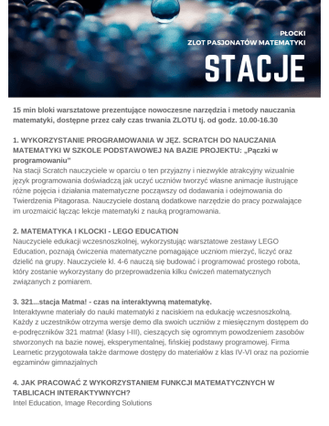 PŁOCKI ZLOT PASJONATÓW MATEMATYKI PŁOCKI ZLOT PASJONATÓW MATEMATYKI STACJE PROGRAM 15 min bloki warsztatowe prezentujące nowoczesne narzędzia i metody nauczania matematyki, dostępne przez cały czas trwania ZLOTU tj. od godz. 10.0016.30 1. WYKORZYSTANIE PROGRAMOWANIA W JĘZ. SCRATCH DO NAUCZANIA MATEMATYKI W SZKOLE PODSTAWOWEJ NA BAZIE PROJEKTU: „Pączki w programowaniu” Na stacji Scratch nauczyciele w oparciu o ten przyjazny i niezwykle atrakcyjny wizualnie język programowania doświadczą jak uczyć uczniów tworzyć własne animacje ilustrujące różne pojęcia i działania matematyczne począwszy od dodawania i odejmowania do Twierdzenia Pitagorasa. Nauczyciele dostaną dodatkowe narzędzie do pracy pozwalające im urozmaicić łącząc lekcje matematyki z nauką programowania. 2. MATEMATYKA I KLOCKI LEGO EDUCATION Nauczyciele edukacji wczesnoszkolnej, wykorzystując warsztatowe zestawy LEGO Education, poznają ćwiczenia matematyczne pomagające uczniom mierzyć, liczyć oraz dzielić na grupy. Nauczyciele kl. 46 nauczą się budować i programować prostego robota, który zostanie wykorzystany do przeprowadzenia kilku ćwiczeń matematycznych związanych z pomiarem. 3. 321...stacja Matma! czas na interaktywną matematykę. Interaktywne materiały do nauki matematyki z naciskiem na edukację wczesnoszkolną. Każdy z uczestników otrzyma wersje demo dla swoich uczniów z miesięcznym dostępem do epodręczników 321 matma! (klasy IIII), cieszących się ogromnym powodzeniem zasobów stworzonych na bazie nowej, eksperymentalnej, fińskiej podstawy programowej. Firma Learnetic przygotowała także darmowe dostępy do materiałów z klas IVVI oraz na poziomie egzaminów gimnazjalnych 4. JAK PRACOWAĆ Z WYKORZYSTANIEM FUNKCJI MATEMATYCZNYCH W TABLICACH INTERAKTYWNYCH? Intel Education, Image Recording Solutions PŁOCKI ZLOT PASJONATÓW MATEMATYKI 5. KHAN ACADEMY TWÓJ ASYSTENT W NAUCZANIU MATEMATYKI Portal z ogromnymi zasobami edukacyjnymi pozwalający poznać jak uczniowie w oparciu o filmy objaśniające poszczególne zagadnienia matematyczne mogą się uczyć samodzielnie, we własnym tempie z dowolną ilością powtórzeń aż do pełnego zrozumienia i opanowania materiału. Nauczyciele dowiedzą się jak przygotować uczniów do zawiadywania własnym procesem uczenia się i odpowiedzialności za oraz rozwijania pracy zespołowej i współpracy rówieśniczej. PROGRAM 6. GRAMY W PIKTOGRAMY W oparciu o pakiet edukacyjny „Gramy w piktogramy” nauczyciele osiągną wyższy poziom satysfakcji z nauczania matematyki i dowiedzą się jak rozwijać u uczniów myślenie oraz jak przez wyjaśnianie i opowiadanie, pytanie i argumentowanie uczniowie mogą dochodzić samodzielnie do rozumienia pojęć matematycznych korzystając z wizualizacji i obrazowego i graficznego przedstawiania problemów matematycznych. 7. POLUBISZ MATEMATYKĘ Z EPODRĘCZNIKIEM Dzięki epodręcznikom przygotowanym przez Politechnikę Łódzką nawet humanista zrozumie matematykę. Większość podręczników papierowych opiera się na modelach abstrakcyjnych, tu przyjęto inne rozwiązanie, które polega na przejściu od modeli praktycznych, rzeczywistych do modelu abstrakcyjnego. Pozwala to na kształtowanie kompetencji matematycznych i sprawia, że nauka matematyki staje się odkrywaniem tajemnic, a nie tylko wkuwaniem do egzaminu. 8. UCZNIOWIE TEŻ MOGĄ UCZYĆ Stanowisko prowadzone przez uczniów poświęcone będzie doświadczeniom, badaniom matematycznym pokazującym użyteczność i atrakcyjność twierdzenia Talesa. Uczniowie stawiają pytanie: Jak duża jest Twoja głowa, którą widzisz w lustrze? Pokazują przyrząd zaprojektowany przez Leonarda Da Vinci. Proszą o zbadanie co robi ten przyrząd i wytłumaczenie dlaczego tak działa. Badają proporcje: złote i inne spotykane w życiu codziennym. 9. Matematyka bez reszty Czy matematyka występuje w zwykłych przedmiotach i znanych Ci miejscach? Na ulicy, lotnisku czy w sklepie? Na stacji „Matematyka bez reszty” znajdziesz odpowiedzi na te i inne pytania. Dzięki nowym produktom multimedialnym „Matematyka bez reszty”, z których można skorzystać na komputerze, tablecie czy tablicy interaktywnej, odkryjemy fascynujący świat liczb, figur oraz miar i wag. 10. Aritmeticus – stoisko poradni psychologicznej