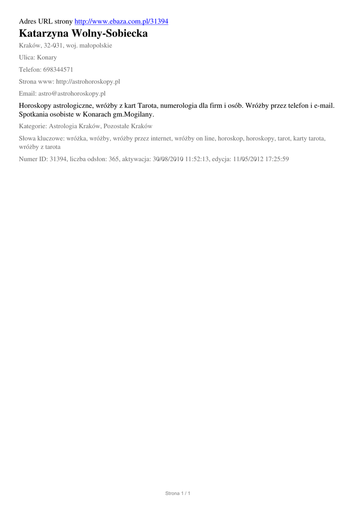 Adres URL strony http://www.ebaza.com.pl/31394 Katarzyna Wolny-Sobiecka Kraków, 32-031, woj. małopolskie Ulica: Konary Telefon: 698344571 Strona www: http://astrohoroskopy.pl Email: [email protected] Horoskopy astrologiczne, wróżby z kart Tarota, numerologia dla firm i osób. Wróżby przez telefon i e-mail. Spotkania osobiste w Konarach gm.Mogilany. Kategorie: Astrologia Kraków, Pozostałe Kraków Słowa kluczowe: wróżka, wróżby, wróżby przez internet, wróżby on line, horoskop, horoskopy, tarot, karty tarota, wróżby z tarota Numer ID: 31394, liczba odsłon: 365, aktywacja: 30/08/2010 11:52:13, edycja: 11/05/2012 17:25:59 Strona 1 / 1