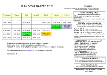 PLAN SESJI MARZEC 2011 CENNIK Aby zapisać się na sesje jogi wg cennika, najpierw weź udział w jednej Sesji Przygotowawczej. Koszt 40 zł. (Wię cej info poniżej). Stałe terminy sesji Poniedziałek Wtorek Środa Czwartek Piątek Sobota Niedziela Wybrane stałe (niezmienne) dni i godziny. 150 zł – dwa razy w tygodniu przez miesiąc kalendarzowy. Opłata za kalendarzową połowę miesiąca wynosi 60% ceny miesięcznej. 10:30 – 12:00 10:30 – 12:00 10:30 – 12:00 10:30 – 12:00 12:00 – 14:00 10:30 – 12:00 Karnety wolnego wstępu 12:00 – 13:00 Wstęp na dowolnie wybrane sesje 1 raz dziennie. Karnety są ważne przez miesiąc kalendarzowy. Sesja Przygotowawcza 17:00 – 18:30 17:00 – 18:30 18:30 – 20:00 18:30 – 20:00 20:00 – 21:30 20:00 – 21:30 16:30 – 18:00 17:00 – 18:30 17:00 – 18:30 Sesja Przygotowawcza 18:30 – 20:00 18:30 – 20:00 20:00 – 21:30 20:00 – 21:30 18:00 – 20:00 Pranajama Sesja kobieca tylko 20marca SŁAWEK Karnet 250 zł – wstęp na wszystkie sesje Karnet 200 zł – wstęp od rana do 17:00 włącznie Karnet 150 zł – uczniowie i studenci - wstęp na wszystkie sesje (studenci do 26 lat na studiach dziennych) Opłata za kalendarzową połowę miesiąca wynosi 60% ceny miesięcznej. Abonamenty „dla zapracowanych” Pranajama - sztuka oddychania w jodze. Marzec – stopień I. Piątki godz. 18:30 - 20:00. Prowadzący: Arek Zdzienicki. Początek 04 marca – bezwzględnie wymagana jest obecność na tej pierwszej sesji. Szczegóły na naszej stronie www.ahj.pl lub na tablicach ogłoszeń. Zapraszamy !!! 120 zł - Abonament „4 wejścia” Wstęp na 4 dowolnie wybrane sesje. Ważny 1 miesiąc od daty wykupienia. 170 zł – Abonament „8 wejść” Wstęp na 8 dowolnie wybranych sesji. Ważny 1 kalendarzowy miesiąc. 200 zł – Abonament „8 wejść” Wstęp na 8 dowolnie wybranych sesji. Ważny 2 miesiące od daty wykupienia. Pojedyncze wejścia 25 zł – przy wykupieniu regularnego wstępu na sesje. 35 zł – przy niewykupieniu regularnego wstępu na sesje. Sesja Przygotowawcza dla rozpoczynających praktykę – 40 zł Honorujemy karty: Multisport i Fitprofit (bez dopłat) Oprócz inspirujących półtoragodzinnych sesji, będących podstawową formą pracy w Akademii, polecamy: Bezpłatne Sesje kobiece, na które zapraszamy panie nie uczestniczące w zwykłych sesjach z powodu okresu . (tylko 23 stycznia). Sesje tematyczne sesje o ciekawych tematach, za każdym razem inna. (po 1 mies.praktyki). Sesje dwugodzinne z pełnym, harmonijnym zestawem asan, które są wykonywane precyzyjnie i w optymalnym tempie (po 3 mies.praktyki). Sesje pranajamy (sztuki oddychania w jodze) są organizowane okresowo. Przeznaczone są dla osób po co najmniej 3 miesiącach praktyki asan w AHJ. Jak rozpocząć praktykę w Akademii? Praktykę jogi w naszej Akademii możesz rozpocząć w dowolnym momencie od udziału w Sesji Przygotowawczej (dwie godziny). Termin sesji: każda środa o godz. 18:00-20:00 lub sobota o godz. 12:00-14:00 (oprócz 1.01). Koszt 40 zł. Nasi doświadczeni nauczyciele w ciekawy i inspirujący sposób przekażą Ci połączoną wiedzę teoretyczną i praktyczną, niezbędną w dalszej praktyce jogi. Przygotują do płynnego wejścia w tok zajęć Akademii. Na tej sesji już będą ćwiczenia, a zatem: - załóż strój nie krępujący ruchów; ćwicz boso (nie zakładaj skarpet) - przyjdź z pustym żołądkiem, duży posiłek zjedz 3-4 godziny wcześniej, przed sesją możesz wypić filiżankę napoju - nie musisz przynosić pomocy do ćwiczeń, na sali jest niezbędny sprzęt (oprócz maty do jogi, która nie jest niezbędna). Na tę pierwszą sesję zapraszamy 30 minut wcześniej w celu zapoznania się z Regulaminem i dopełnienia formalności. Prosimy także o przyniesienie zdjęcia legitymacyjnego do Karty Uczestnika. Po zaliczeniu tej sesji możesz od razu, nawet w środku miesiąca, zapisać się na zwykłe sesje. Wówczas miesięczna opłata będzie obliczona proporcjonalnie do liczby dni pozostałych do końca miesiąca. Natomiast w kolejnych okresach będzie już zawsze obowiązywała opłata za cały miesiąc kalendarzowy. Możesz ćwiczyć dwa razy w tygodniu lub częściej. Opłata miesięczna zależy od wybranej przez Ciebie liczby terminów i wynosi od 120 do 250 zł. ul. Wałowa 3, 00-211 Warszawa tel: 635 68 69 oraz 0601 33 19 39 internet: www.ahj.pl, e-mail: [email protected] Konto: iPKO nr 80 1020 1013 0000 0102 0102 3894