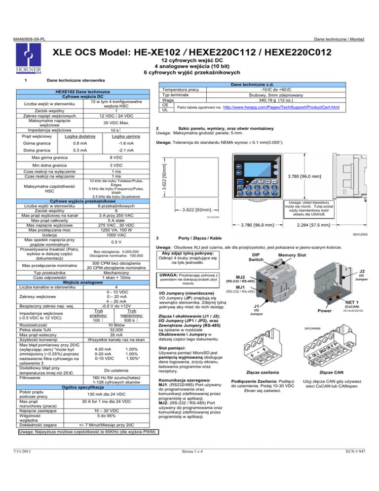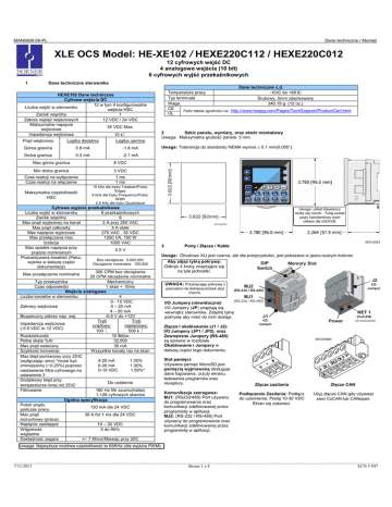 MAN0808-09-PL Dane techniczne / MontaŜ XLE OCS Model: HE-XE102 / HEXE220C112 / HEXE220C012 12 cyfrowych wejść DC 4 analogowe wejścia (10 bit) 6 cyfrowych wyjść przekaźnikowych Dane techniczne sterownika HEXE102 Dane techniczne Cyfrowe wejścia DC 12 w tym 4 konfigurowalne Liczba wejść w sterowniku wejścia HSC Zacisk wspólny 1 Zakres napięć wejściowych 12 VDC / 24 VDC Maksymalne napięcie 35 VDC Max. wejściowe Impedancja wejściowa 10 kΩ Prąd wejściowy Logika dodatnia Logika ujemna Górna granica 0.8 mA -1.6 mA Dolna granica 0.3 mA Dane techniczne c.d. Temperatura pracy -10°C do +60°C Typ terminala Śrubowy, 5mm zdejmowany Waga 340.19 g (12 oz.) CE Patrz tabela zgodności na: http://www.heapg.com/Pages/TechSupport/ProductCert.html UL 2 Szkic panelu, wymiary, oraz otwór montaŜowy Uwaga: Maksymalna grubość panela: 5 mm. Uwaga: Tolerancja do standardu NEMA wynosi ± 0.1 mm(0.005”). -2.1 mA Max górna granica 8 VDC Min dolna granica 3 VDC Czas reakcji na wyłączenie Czas reakcji na włączenie 1 ms 1 ms Maksymalna częstotliwość HSC 10 kHz dla trybu Totalizer/Pulse, Edges 5 kHz dla trybu Frequency/Pulse, Width 2.5 kHz dla trybu Quadrature Cyfrowe wyjścia przekaźnikowe Liczba wyjść w sterowniku 6 przekaźnikowych Zacisk wspólny 6 Max prąd wyjściowy na kanał 3 A przy 250 VAC Max prąd całkowity 5 A stałe Max napięcie wyjściowe 275 VAC , 30 VDC Max przełączana moc 1250 VA, 150 W Izolacja 1000 VAC Max spadek napięcia przy 0.5 V prądzie nominalnym Przewidywana trwałość (Patrz, Bez obciąŜenia: 5,000,000 wykres w dalszej części ObciąŜenie nominalne: 100,000 dokumentacji) 300 CPM bez obciąŜenia Max przełączenie nominalne 20 CPM obciąŜenie nominalne Typ przekaźnika Mechaniczny Czas odpowiedzi 1 skan + 10ms Wejścia analogowe Liczba kanałów w sterowniku 4 0 - 10 VDC Zakresy wejściowe 0 – 20 mA 4 – 20 mA Bezpieczny zakres nap. wej. -0.5 V do +12V Tryb Tryb Impedancja wejściowa prądowy: napięciowy: (-0.5 VDC to 12 VDC) 100 Ω 500 k Ω Rozdzielczość 10 Bitów Pełna skala %AI 32,000 Max prąd wsteczny 35 mA Szybkość konwersji Wszystkie kanały raz na skan Max błąd pomiarowy przy 25°C 4-20 mA 1.00% (wyłączając zero) *moŜe być 0-20 mA 1.00% zmniejszony (~0.25%) poprzez 0-10 VDC 1.50%* nastawienie filtra cyfrowego na ustawienie 3 Dodatkowy błąd przy Do ustalenia temperaturze innej niŜ 25°C Filtrowanie 160 Hz filtr szumu(hałas) 1-128 cyfrowych skanów Ogólna specyfikacja Pobór prądu 130 mA dla 24 VDC podczas pracy Max prąd 30 A for 1 ms dla 24 VDC rozruchowy (praca) Napięcie zasilające 10 – 30 VDC Wilgotność 5 do 95% względna Dokładność zegara +/- 7 Minut/Miesiąc przy 20C 3.622 [92mm] 1 Uwaga: układ klawiatury moŜe się róznić. Tutaj został uŜyty standardowy wzór układu dla USA/UE 3.622 [92mm] 001XLE002 3 Porty / Złącza / Kable Uwaga: Obudowa XLt jest czarna, ale dla przejrzystości, jest pokazana w jasno-szarym kolorze. Aby zdjąć tylną pokrywę: DIP Memory Slot Odkręć 4 śruby znajdujące się Switch na tyle jednostki. J2 UWAGA: Przykręcając pokrywę z powrotem nie dokręcaj śrubek zbyt mocno. I/O Jumper MJ2 (RS-232 / RS-485) MJ1 (RS-232 / RS-485) I/O Jumpery (niewidoczne) I/O Jumpery (JP) znajdują się wewnątrz sterownika. Zdejmij tylną J1 pokrywę aby mieć do nich dostęp. Złącza I okablowanie (J1 / J2): I/O Jumpery (JP1 / JP2), oraz Zewnętrzne Jumpery (RS-485) są opisane w rozdziale Okablowanie i Jumpery w dalszej części tego dokumentu. Slot pamięci: UŜywana pamięć MicroSD jest pamięcią wyjmowaną obsługuje dane logowania, zrzuty ekranu, ładowania programów oraz receptury. Komunikacja szeregowa: MJ1: (RS232/485) Port uŜywany do programowania oraz komunikacji zdefiniowanej przez programistę w aplikacji. MJ2: (RS-232 / RS-485) Port uŜywany do programowania oraz komunikacji zdefiniowanej przez programistę w aplikacji. I/O Jumper NET 1 (CsCAN) Power 001XLE029-R2 Złącze zasilania Złącze CAN Podłączenie Zasilania: Podłącz do uziemienia. Podaj 10-30 VDC Ekran się zaświeci. UŜyj złącza CAN gdy uŜywasz sieci CsCAN lub CANopen. Uwaga: NajwyŜsza moŜliwa częstotliwość to 65KHz (dla wyjścia PWM) __________________________________________________________________________________________________________________________________________________________________ 7/11/2011 Strona 1 z 4 ECN # 947 MAN0808-09-PL 4 Dane techniczne / MontaŜ Opis pinów na portach komunikacyjnych sterownika 5.2 Pin 8 MJ1 Piny Sygnał 1 Sygnał Kierunek 8 TXD OUT TXD OUT 7 6 RXD IN RXD IN 5* 0V +5 60mA Ground OUT 0V +5 60mA Ground OUT 4 RTS OUT TX- OUT 3 CTS IN TX+ OUT IN / OUT RX- IN 2 1 RX- / TXRX+ / TX+ Terminal J2 czarny C6 R6 C5 R5 C4 R4 C3 R3 C2 R2 C1 R1 H4 H3 H2 MJ2 Piny Kierunek IN / OUT RX+ Przykłady okablowania (c.d.) IN Terminal J2 - sposób podłączania sygnałów dyskretnych i analogowych w logice dodatniej Opis sygnału XE102 Przekaźnik 6 COM Przekaźnik 6 NO Przekaźnik 5 COM Przekaźnik 5 NO Przekaźnik 4 COM Przekaźnik 4 NO Przekaźnik 3 COM Przekaźnik 3 NO Przekaźnik 2 COM Przekaźnik 2 NO Przekaźnik 1 COM Przekaźnik 1 NO HSC4 / IN12 HSC3 / IN11 HSC2 / IN10 230VAC OR 25VDC 230VAC OR 25VDC 230VAC OR 25VDC 230VAC OR 25VDC 230VAC OR 25VDC 230VAC OR 25VDC * +5 on XLe Rev E and later 5 C6 N L LOAD L LOAD LOAD LOAD LOAD LOAD H3 12-24VDC Przewody w zaleŜności od uŜytych typów We / Wy oraz wybór odpowiednich opcji Jumperów. Logika dodatnia i Logika ujemna - Okablowanie Sposób podłączenia kabli sygnałowych do sterownika XLe zaleŜy od logiki pracy sterownika. I1 Opis sygnału XE102 IN1 IN2 IN3 IN4 IN5 IN6 IN7 IN8 HSC1 /IN9 Ground Analog IN1 Analog IN2 Analog IN3 Analog IN4 Ground Jumper JP1 konfiguracja logiki pracy Jumper JP2 Konfiguracja trybu pracy wejść analogowych A1 A2 A3 A4 Domyślnie 001XLE026 Domyślnie Uwaga: UŜywając JP2 (A1-A4), kaŜdy kanał moŜe być konfigurowany niezaleŜnie od pozostałych 001XLE027 Uwaga: Ustawienie konfiguracji Modułu C