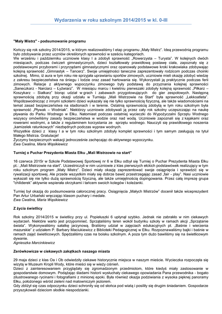 Wydarzenia w roku szkolnym 2014/2015 w kl. 0-III "Mały Mistrz" - podsumowanie programu Kończy się rok szkolny 2014/2015, w którym realizowaliśmy I etap programu „Mały Mistrz”. Ideą przewodnią programu było zdobywanie przez uczniów określonych sprawności w sześciu kategoriach. We wrześniu i październiku uczniowie klasy I a zdobyli sprawność „Rowerzysta – Turysta”. W kolejnych dwóch miesiącach, podczas ćwiczeń gimnastycznych, dzieci kształtowały prawidłową postawę ciała, zapoznały się z podstawowymi przyborami i przyrządami gimnastycznymi oraz opanowały podstawowe kroki krakowiaka zdobywając kolejną sprawność „Gimnastyk – Tancerz”. Swoje umiejętności taneczne zaprezentowały rodzicom podczas choinki szkolnej. Mimo, iż aura w tym roku nie sprzyjała uprawianiu sportów zimowych, uczniowie mieli okazję zdobyć wiedzę z zakresu bezpieczeństwa na śniegu i lodzie oraz zasad hartowania się. Wykorzystali ją praktycznie podczas ferii zimowych. Relacje z aktywnego wypoczynku zimowego były podstawą do przyznania kolejnej sprawności „Saneczkarz - Narciarz – Łyżwiarz”. W miesiącu marcu i kwietniu pierwszaki zdobyły kolejną sprawność „Piłkarz – Koszykarz – Siatkarz” biorąc udział w grach i zabawach przygotowujących do gier zespołowych. Następną sprawnością zdobytą przy okazji udziału w Turnieju „Mali Mistrzowie na Start” była sprawność „Lekkoatleta”. Współzawodnicząc z innymi szkołami dzieci wykazały się nie tylko sprawnością fizyczną, ale także wiadomościami na temat zasad bezpieczeństwa na stadionach i w terenie. Ostatnią sprawnością zdobytą w tym roku szkolnym była sprawność „Pływak – Wodniak”. Niektórzy uczniowie zdobywali ją przez cały rok szkolny uczęszczając na naukę pływania do Parku Wodnego w Ełku. Natomiast podczas ostatniej wycieczki do Wypożyczalni Sprzętu Wodnego wszyscy omówiliśmy zasady bezpieczeństwa w wodzie oraz nad wodą. Uczniowie zapoznali się z kajakami oraz rowerami wodnymi, a także z regulaminem korzystania ze sprzętu wodnego. Nauczyli się prawidłowego noszenia „kamizelek ratunkowych” niezbędnych podczas wypraw wodnych. Wszystkie dzieci z klasy I a w tym roku szkolnym zdobyły komplet sprawności i tym samym zasługują na tytuł Małego Mistrza. Gratulacje! Życzymy bezpiecznych wakacji jednocześnie zachęcając do aktywnego wypoczynku. Ewa Cwalina, Maria Wąsikiewicz Turniej o Puchar Prezydenta Miasta Ełku „Mali Mistrzowie na start” 16 czerwca 2015r w Szkole Podstawowej Sportowej nr 6 w Ełku odbył się Turniej o Puchar Prezydenta Miasta Ełku pt.: „Mali Mistrzowie na start”. Uczestniczyli w nim uczniowie z klas pierwszych ełckich podstawówek realizujący w tym roku szkolnym program „Mały Mistrz”. Dzieci miały okazję zaprezentować swoje osiągnięcia i sprawdzić się w rywalizacji sportowej. Ale przede wszystkim miały się dobrze bawić przestrzegając zasad „fair - play”. Nasi uczniowie wykazali się nie tylko dużą sprawnością fizyczną, ale także umiejętnością dopingowania. Przez całą imprezę grupa "chiliderek” aktywnie wspierała okrzykami i tańcem swoich kolegów i koleżanki. Turniej był okazją do podsumowania całorocznej pracy. Osiągnięcia „Małych Mistrzów” docenił także wiceprezydent Pan Artur Urbański wręczając klasom puchary i medale. Ewa Cwalina, Maria Wąsikiewicz Z życia świetlicy Rok szkolny 2014/2015 w świetlicy przy ul. Popiełuszki 6 upłynął szybko. Jednak nie zabrakło w nim ciekawych wydarzeń. Niektóre warto jest przypomnieć. Sprzątaliśmy teren wokół budynku szkoły w ramach akcji „Sprzątanie świata”. Wykonywaliśmy sałatkę jarzynową. Braliśmy udział w zajęciach edukacyjnych pt. „Baśnie i wierzenia mazurskie” z udziałem P. Barbary Maciukiewicz z Biblioteki Pedagogicznej w Ełku. Rozpoznawaliśmy bajki i baśnie w ramach zajęć świetlicowych. Spędzaliśmy czas na boisku szkolnym. A poza tym dużo bawiliśmy się na świetlicowym dywanie. Agnieszka Marcinkiewicz Zerówkowicze w ciekawych zakątkach naszego miasta 29 maja dzieci z klas Oa i Ob odwiedziły ciekawe historycznie miejsca w naszym mieście. Wycieczka rozpoczęła się wizytą w Muzeum Kropli Wody, które mieści się w wieży ciśnień. Dzieci z zainteresowaniem przyglądały się zgromadzonym przedmiotom, które kiedyś miały zastosowanie w gospodarstwie domowym. Podążając śladami historii wysłuchały ciekawego opowiadania Pana przewodnika - bogato zilustrowanego rycinami i fotografiami z minionej epoki. Była również okazja podziwiania z wysoka pięknej panoramy Ełku, położonego wśród zieleni nad malowniczym jeziorem. Gdy zbliżył się czas odpoczynku dzieci schroniły się od słońca pod wiatą i posiliły się drugim śniadaniem. Gospodarze przyszykowali dzieciom słodkie niespodzianki. Kolejnym etapem naszej wycieczki było Muzeum Kolei Wąskotorowej, skansen pszczelarski i pracownia rzeźby Stowarzyszenia „ESTIAN”. Spotkanie było niezwykle ciekawe. W pracowni artystycznej pan Stanisław Rudnik wyjaśnił dzieciom jak należy przygotować drewno do obróbki i które gatunki najlepiej nadają się do rzeźbienia. Dzieci obejrzały gotowe rzeźby, płaskorzeźby i reliefy. Następnie spotkały się z panem Lucjanem Różyckim, który oprowadził dzieci po skansenie i pokazał stare zabytkowe figuralne ule, w tym najstarszy - ze słomianym daszkiem, który dał początek skansenowi. Pan Lucjan ciekawie opowiadał o pracy pszczelarza, o gatunkach miodów, a także o przyczynach wymierania pszczół. Dzieci miały również okazję poznać smak i zapach różnych roślin zielarskich, takich jak mięta, lubczyk, tymianek, rozmaryn, bazylia, majeranek i szałwia. Pod koniec wycieczki pan Lucjan pokazał dzieciom zwierzęta, które hoduje. Były tam króliki, bażanty i różne rasy kur. Zadowoleni, pełni wrażeń, bogatsi o nowe doświadcze
