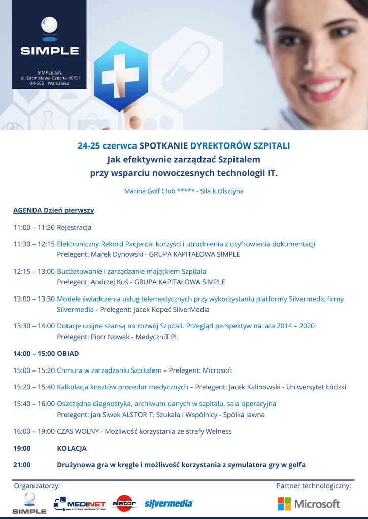 24-25 czerwca SPOTKANIE DYREKTORÓW SZPITALI Jak efektywnie zarządzać Szpitalem przy wsparciu nowoczesnych technologii IT. Marina Golf Club ***** - Siła k.Olsztyna AGENDA Dzień pierwszy 11:00 – 11:30 Rejestracja 11:30 – 12:15 Elektroniczny Rekord Pacjenta: korzyści i utrudnienia z ucyfrowienia dokumentacji Prelegent: Marek Dynowski - GRUPA KAPITAŁOWA SIMPLE 12:15 – 13:00 Budżetowanie i zarządzanie majątkiem Szpitala Prelegent: Andrzej Kuś - GRUPA KAPITAŁOWA SIMPLE 13:00 – 13:30 Modele świadczenia usług telemedycznych przy wykorzystaniu platformy Silvermedic firmy Silvermedia - Prelegent: Jacek Kopeć SilverMedia 13:30 – 14:00 Dotacje unijne szansą na rozwój Szpitali. Przegląd perspektyw na lata 2014 – 2020 Prelegent: Piotr Nowak - MedyczniT.PL 14:00 – 15:00 OBIAD 15:00 – 15:20 Chmura w zarządzaniu Szpitalem – Prelegent: Microsoft 15:20 – 15:40 Kalkulacja kosztów procedur medycznych – Prelegent: Jacek Kalinowski - Uniwersytet Łódzki 15:40 – 16:00 Oszczędna diagnostyka, archiwum danych w szpitalu, sala operacyjna Prelegent: Jan Siwek ALSTOR T. Szukała i Wspólnicy - Spółka Jawna 16:00 – 19:00 CZAS WOLNY - Możliwość korzystania ze strefy Welness 19:00 KOLACJA 21:00 Drużynowa gra w kręgle i możliwość korzystania z symulatora gry w golfa Organizatorzy: Partner technologiczny: AGENDA Dzień drugi: 8:00 – 10:00 Śniadanie 10:00 – 10:30 Rola personelu medycznego w zintegrowanym systemie informatycznym Prelegent: GRUPA KAPITAŁOWA SIMPLE 10:30 – 11:00 Udział Gościa specjalnego Organizatorzy: Partner technologiczny: