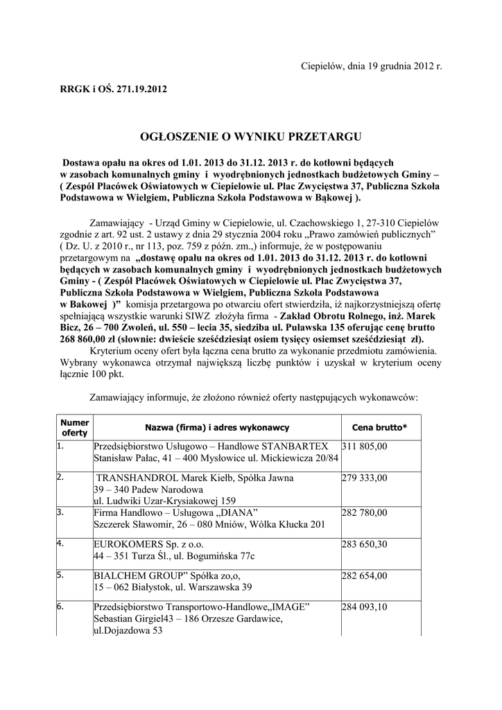 Ciepielów, dnia 19 grudnia 2012 r. RRGK i OŚ. 271.19.2012 OGŁOSZENIE O WYNIKU PRZETARGU Dostawa opału na okres od 1.01. 2013 do 31.12. 2013 r. do kotłowni będących w zasobach komunalnych gminy i wyodrębnionych jednostkach budżetowych Gminy – ( Zespół Placówek Oświatowych w Ciepielowie ul. Plac Zwycięstwa 37, Publiczna Szkoła Podstawowa w Wielgiem, Publiczna Szkoła Podstawowa w Bąkowej ). Zamawiający - Urząd Gminy w Ciepielowie, ul. Czachowskiego 1, 27-310 Ciepielów zgodnie z art. 92 ust. 2 ustawy z dnia 29 stycznia 2004 roku „Prawo zamówień publicznych” ( Dz. U. z 2010 r., nr 113, poz. 759 z późn. zm.,) informuje, że w postępowaniu przetargowym na „dostawę opału na okres od 1.01. 2013 do 31.12. 2013 r. do kotłowni będących w zasobach komunalnych gminy i wyodrębnionych jednostkach budżetowych Gminy - ( Zespół Placówek Oświatowych w Ciepielowie ul. Plac Zwycięstwa 37, Publiczna Szkoła Podstawowa w Wielgiem, Publiczna Szkoła Podstawowa w Bakowej )” komisja przetargowa po otwarciu ofert stwierdziła, iż najkorzystniejszą ofertę spełniającą wszystkie warunki SIWZ złożyła firma - Zakład Obrotu Rolnego, inż. Marek Bicz, 26 – 700 Zwoleń, ul. 550 – lecia 35, siedziba ul. Puławska 135 oferując cenę brutto 268 860,00 zł (słownie: dwieście sześćdziesiąt osiem tysięcy osiemset sześćdziesiąt zł). Kryterium oceny ofert była łączna cena brutto za wykonanie przedmiotu zamówienia. Wybrany wykonawca otrzymał największą liczbę punktów i uzyskał w kryterium oceny łącznie 100 pkt. Zamawiający informuje, że złożono również oferty następujących wykonawców: Numer oferty Nazwa (firma) i adres wykonawcy Cena brutto* 1. Przedsiębiorstwo Usługowo – Handlowe STANBARTEX 311 805,00 Stanisław Pałac, 41 – 400 Mysłowice ul. Mickiewicza 20/84 2. TRANSHANDROL Marek Kiełb, Spółka Jawna 39 – 340 Padew Narodowa ul. Ludwiki Uzar-Krysiakowej 159 Firma Handlowo – Usługowa „DIANA” Szczerek Sławomir, 26 – 080 Mniów, Wólka Kłucka 201 279 333,00 4. EUROKOMERS Sp. z o.o. 44 – 351 Turza Śl., ul. Bogumińska 77c 283 650,30 5. BIALCHEM GROUP” Spółka zo,o, 15 – 062 Białystok, ul. Warszawska 39 282 654,00 6. Przedsiębiorstwo Transportowo-Handlowe„IMAGE” Sebastian Girgiel43 – 186 Orzesze Gardawice, ul.Dojazdowa 53 284 093,10 3. 282 780,00 7. Zakład Obrotu Rolnego, inż. Marian Bicz, 26 – 700 Zwoleń 268 860,00 ul. 550 – lecia 35, siedziba ul. Puławska 135 8. P.H.U. „SUKCES” Bożena Krzosek ul. Mickiewicza 9, 26 – 811 Wyśmierzyce 273 150,04 9. Handel Hurtowy Surowcami Wtórnymi Mirosław Biegański, 27 – 300 Lipsko ul. Słoneczna 6, Baza Ciepielów ul. Witosa 11 282 137,40 Załącznik: 1. Streszczenie oceny i porównania złożonych ofert.