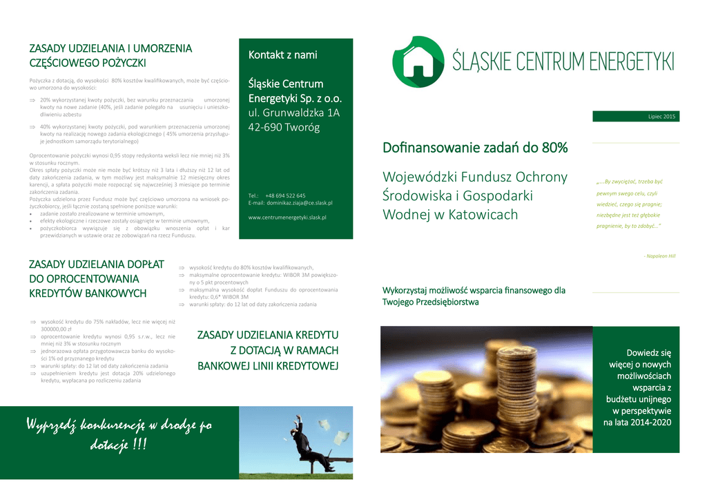 ZASADY UDZIELANIA I UMORZENIA CZĘŚCIOWEGO POŻYCZKI Kontakt z nami Pożyczka z dotacją, do wysokości 80% kosztów kwalifikowanych, może być częściowo umorzona do wysokości: 20% wykorzystanej kwoty pożyczki, bez warunku przeznaczania umorzonej kwoty na nowe zadanie (40%, jeśli zadanie polegało na usunięciu i unieszkodliwieniu azbestu 40% wykorzystanej kwoty pożyczki, pod warunkiem przeznaczenia umorzonej kwoty na realizację nowego zadania ekologicznego ( 45% umorzenia przysługuje jednostkom samorządu terytorialnego) Oprocentowanie pożyczki wynosi 0,95 stopy redyskonta weksli lecz nie mniej niż 3% w stosunku rocznym. Okres spłaty pożyczki może nie może być krótszy niż 3 lata i dłuższy niż 12 lat od daty zakończenia zadania, w tym możliwy jest maksymalnie 12 miesięczny okres karencji, a spłata pożyczki może rozpocząć się najwcześniej 3 miesiące po terminie zakończenia zadania. Pożyczka udzielona przez Fundusz może być częściowo umorzona na wniosek pożyczkobiorcy, jeśli łącznie zostaną spełnione poniższe warunki: zadanie zostało zrealizowane w terminie umownym, efekty ekologiczne i rzeczowe zostały osiągnięte w terminie umownym, pożyczkobiorca wywiązuje się z obowiązku wnoszenia opłat i kar przewidzianych w ustawie oraz ze zobowiązań na rzecz Funduszu. ZASADY UDZIELANIA DOPŁAT DO OPROCENTOWANIA KREDYTÓW BANKOWYCH wysokość kredytu do 75% nakładów, lecz nie więcej niż 300000,00 zł oprocentowanie kredytu wynosi 0,95 s.r.w., lecz nie mniej niż 3% w stosunku rocznym jednorazowa opłata przygotowawcza banku do wysokości 1% od przyznanego kredytu warunki spłaty: do 12 lat od daty zakończenia zadania uzupełnieniem kredytu jest dotacja 20% udzielonego kredytu, wypłacana po rozliczeniu zadania Śląskie Centrum Energetyki Sp. z o.o. ul. Grunwaldzka 1A 42-690 Tworóg WIADOMOŚCI HANDLOWE Lipiec 2015 Dofinansowanie zadań do 80% Tel.: +48 694 522 645 E-mail: [email protected] www.centrumenergetyki.slask.pl Wojewódzki Fundusz Ochrony Środowiska i Gospodarki Wodnej w Katowicach „...By zwyciężać, trzeba być pewnym swego celu, czyli wiedzieć, czego się pragnie; niezbędne jest też głębokie pragnienie, by to zdobyć…” - Napoleon Hill wysokość kredytu do 80% kosztów kwalifikowanych, maksymalne oprocentowanie kredytu: WIBOR 3M powiększony o 5 pkt procentowych maksymalna wysokość dopłat Funduszu do oprocentowania kredytu: 0,6* WIBOR 3M warunki spłaty: do 12 lat od daty zakończenia zadania ZASADY UDZIELANIA KREDYTU Z DOTACJĄ W RAMACH BANKOWEJ LINII KREDYTOWEJ Wyprzedź konkurencję w drodze po dotacje !!! Wykorzystaj możliwość wsparcia finansowego dla Twojego Przedsiębiorstwa Dowiedz się więcej o nowych możliwościach wsparcia z budżetu unijnego w perspektywie na lata 2014-2020 Typowe zadania objęte wsparciem BENEFICJENCI Samorządy Przedsiębiorcy budowa lub modernizacja źródeł ciepła, likwidacja lokalnych źródeł ciepła i podłączenie obiektów do sieci cieplnej, budowa źródeł energii odnawialnej, budowa źródeł energii odnawialnej, wdrażanie POE, termoizolacja budynków, modernizacja systemów odbioru energii. Zadania z zakresu ochrony atmosfery Zmniejszanie emisji pyłowo – gazowej, w tym tzw. „niskiej emisji”, zwiększenie efektywności energetycznej wytwarzania, przesyłu lub użytkowania energii: Wdrażanie projektów nowoczesnych, efektywnych i przyjaznych środowisku układów technologicznych oraz systemów wytwarzania Budowa lub zmiana systemu ogrzewania na bardziej efektywny ekologicznie i energetycznie Zastosowanie odnawialnych lub alternatywnych źródeł energii Wdrażanie programów lub projektów zwiększających efektywność energetyczną, w tym z zastosowaniem odnawialnych lub alternatywnych źródeł energii Budowa i modernizacja systemów redukcji zanieczyszczeń pyłowo – gazowych Wdrażanie obszarowych programów ograniczenia emisji pyłowo –gazowej Termoizolacja budynków w zakresie wynikającym z audytu energetycznego (zadania mogą obejmować również demontaż, transport i unieszkodliwienie odpadów zawierających azbest) Wykorzystanie metanu z kopalń węgla kamiennego Instalacje do produkcji paliw niskoemisyjnych i biopaliw Wymiana autobusów komunikacji miejskiej z wprowadzeniem do eksploatacji pojazdów z napędem hybrydowym Inwestycje z zakresu ochrony atmosfery, dofinansowane ze środków zagranicznych FORMY WSPARCIA Dotacja Częściowo umarzalne pożyczki Dopłata do oprocentowania kredytu Wspieranie budownictwa niskoenergetycznego Inwestycje polegające na budowie obiektów użyteczności publicznej o niemal zerowym zużyciu energii ( w rozumieniu Dyrektywy Parlamentu Europejskiego i Rady 2010/31/UE), realizowane przez jednostki sektora finansów publicznych produkcja energii cieplnej, produkcja energii elektrycznej, oszczędność energii cieplnej dzięki realizacji zadań związanych z termomodernizacją budynków. 80% Fundusz nie finansuje źródeł ciepła, instalacji i termoizolacji w nowobudowanych obiektach, za wyjątkiem odnawialnych źródeł energii. Kredyt z dotacją 20% Okres trwałości projektu: Rozliczenia finansowe: KOSZTY KWALIFIKOWANE ZASADY UDZIELANIA DOTACJI Koszty kwalifikowane to suma kosztów niezbędnych dla osiągnięcia efektu ekologicznego. Do kosztów kwalifikowanych zalicza się koszty ponoszone bezpośrednio na: Dodatkowe efekty ekologiczne: - Instytucje WYSOKOŚĆ DOFINANSOWANIA (POŻYCZKA + DOTACJA) MOŻE WYNOSIĆ DO KOSZTÓW KWALIFIKOWANYCH nabycie maszyn, urządzeń, linii technologicznych oraz materiałów niezbędnych do realizacji inwestycji, roboty budowlano-montażowe i demontażowe, obiekty i infrastrukturę związaną z inwestycją, rozruch technologiczny. Nie są kosztami kwalifikowanymi: koszty prac przygotowawczych (wykupienie gruntu, wykonanie prac projektowych, analiz, ekspertyz i audytów), podatki (z wyjątkiem podatku VAT płaconego przez jednostki, dla których stanowi on element kosztów),