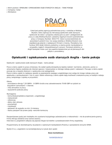 ● ● ● Work position: OPIEKUNKI I OPIEKUNOWIE OSóB STARSZYCH ANGLIA – TANIE POKOJE Company: Cekal Workplace: Cekal jest polską agencją pośrednictwa pracy z siedzibą w Wielkiej Brytanii, która zajmuję się rekrutacją opiekunek osób starszych, opiekunek do dzieci ( programy edukacyjne au pair) i pielęgniarek do pracy w całej Wielkiej Brytanii. Jesteśmy legalnym biurem pośrednictwa pracy o Company Number: 8321774. Cekal w przeciwieństwie do pozostałych polskich biur ma swoją siedzibę w Wielkiej Brytanii oraz współpracuję jedynie z najlepszymi firmami z branży. Posiadamy tzw. fundusz SOS dzięki któremu jesteśmy w stanie pomóc kandydatowi w przypadku nagłych niespodziewanych sytuacji. Ponieważ jesteśmy w Anglii kandydat może czuć się zupełnie bezpiecznie już od pierwszych dni pobytu u pracodawcy. Opiekunki i opiekunowie osób starszych Anglia – tanie pokoje Opiekunki i opiekunowie osób starszych Anglia – tanie pokoje Praca w domu opieki to praca zmianowa. Do zadań opiekunki/opiekuna będzię należeć: karmienie, ubieranie, pomoc w utrzymaniu higieny osobistej ale również spacery i towarzystwo w różnego rodzaju grach i zabawach. Pracując w domu opieki pracuję się w zespole złożonym z opiekunów oraz pielęgniarek. Praca w domu opieki to najlepszy sposób na poprawienie swojego j.angielskiego oraz wstęp do innego rodzaju pracy jak opiekunka z zamieszkaniem ( live in care). Dobre referencję z domu opieki dają możliwość znalezienia pracy w każdym rodzaju pracy związanego z opieką w przyszłości. Oferta: - pracodawca oferuję 7,20 GBP/h – 8 GBP/h brutto oraz zakwaterowanie 70-80 GBP na tydzień ze wszystkimi rachunkami + internet. - miła atmosfera w pracy - wyżywienie podczas pracy Wymagania: - komunikatywna/dobra znajomość j. angielskiego - niekaralność - referencję - dobry stan zdrowia - pracowitość - cierpliwość - gotowość do wyjazdu na min. 6 miesięcy - ważny paszport lub prawo jazdy- warunek konieczny Paszport/prawo jazdy jest niezbędny do uzyskania brytyjskiego zaświadczenia o niekaralności - nie do przekroczenia granicy Firma oferuję szkolenia oraz szanse awansu. Interview w j.angielskim odbywa się poprzez Skype lub telefon z przedstawicielem firmy angielskiej. Przypominamy że skontaktujemy się jedynie z wybranymi kandydatami.Prosimy o sprawdzenie skrzynki SPAM. Wyślij CV w j. angielskim na [email protected] w tytule dom opieki Dane kontaktowe: [email protected] www.cekal.pl tel. 00447925965874 Send Save Print Tweet