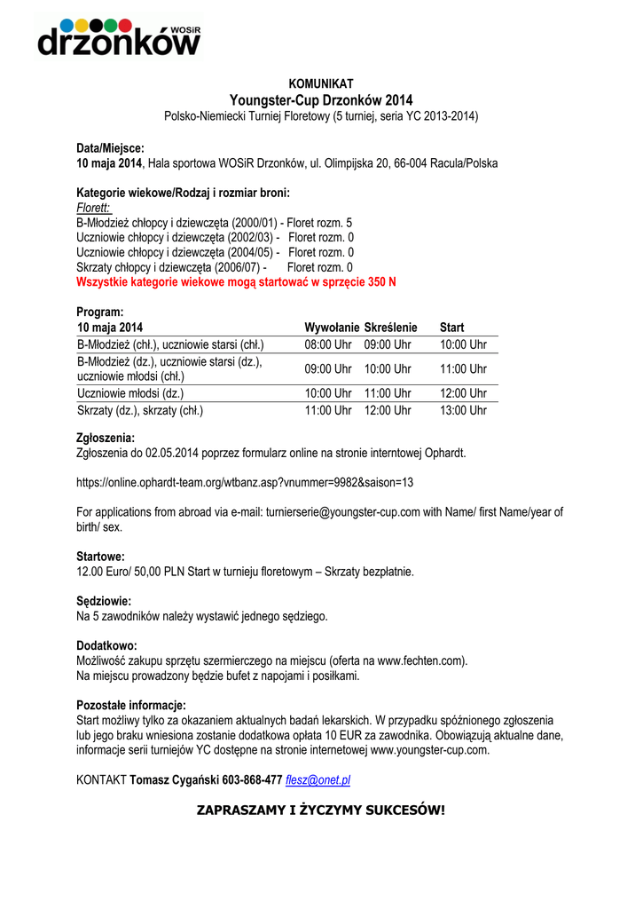 KOMUNIKAT Youngster-Cup Drzonków 2014 Polsko-Niemiecki Turniej Floretowy (5 turniej, seria YC 2013-2014) Data/Miejsce: 10 maja 2014, Hala sportowa WOSiR Drzonków, ul. Olimpijska 20, 66-004 Racula/Polska Kategorie wiekowe/Rodzaj i rozmiar broni: Florett: B-Młodzież chłopcy i dziewczęta (2000/01) - Floret rozm. 5 Uczniowie chłopcy i dziewczęta (2002/03) - Floret rozm. 0 Uczniowie chłopcy i dziewczęta (2004/05) - Floret rozm. 0 Skrzaty chłopcy i dziewczęta (2006/07) Floret rozm. 0 Wszystkie kategorie wiekowe mogą startować w sprzęcie 350 N Program: 10 maja 2014 B-Młodzież (chł.), uczniowie starsi (chł.) B-Młodzież (dz.), uczniowie starsi (dz.), uczniowie młodsi (chł.) Uczniowie młodsi (dz.) Skrzaty (dz.), skrzaty (chł.) Wywołanie Skreślenie 08:00 Uhr 09:00 Uhr Start 10:00 Uhr 09:00 Uhr 10:00 Uhr 11:00 Uhr 10:00 Uhr 11:00 Uhr 11:00 Uhr 12:00 Uhr 12:00 Uhr 13:00 Uhr Zgłoszenia: Zgłoszenia do 02.05.2014 poprzez formularz online na stronie interntowej Ophardt. https://online.ophardt-team.org/wtbanz.asp?vnummer=9982&saison=13 For applications from abroad via e-mail: [email protected] with Name/ first Name/year of birth/ sex. Startowe: 12.00 Euro/ 50,00 PLN Start w turnieju floretowym – Skrzaty bezpłatnie. Sędziowie: Na 5 zawodników należy wystawić jednego sędziego. Dodatkowo: Możliwość zakupu sprzętu szermierczego na miejscu (oferta na www.fechten.com). Na miejscu prowadzony będzie bufet z napojami i posiłkami. Pozostałe informacje: Start możliwy tylko za okazaniem aktualnych badań lekarskich. W przypadku spóźnionego zgłoszenia lub jego braku wniesiona zostanie dodatkowa opłata 10 EUR za zawodnika. Obowiązują aktualne dane, informacje serii turniejów YC dostępne na stronie internetowej www.youngster-cup.com. KONTAKT Tomasz Cygański 603-868-477 [email protected] ZAPRASZAMY I ŻYCZYMY SUKCESÓW!