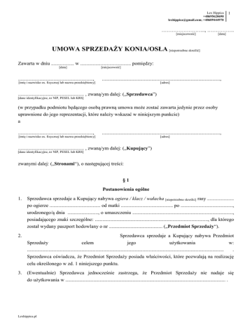Lex Hippica +48695620690 [email protected]; +48609444970 1 …………………….., ……………. [miejscowość] [data] UMOWA SPRZEDAŻY KONIA/OSŁA [niepotrzebne skreślić] Zawarta w dniu .................. w ........................................ pomiędzy: [data] ..........................................................., [imię i nazwisko os. fizycznej lub nazwa przedsiębiorcy] [miejscowość] ............................................................................................., [adres] .................................................... , zwaną/ym dalej: („Sprzedawca”) [dane identyfikacyjne, nr NIP, PESEL lub KRS] (w przypadku podmiotu będącego osobą prawną umowa może zostać zawarta jedynie przez osoby uprawnione do jego reprezentacji, które należy wskazać w niniejszym punkcie) a ..........................................................., [imię i nazwisko os. fizycznej lub nazwa przedsiębiorcy] ............................................................................................., [adres] .................................................... , zwaną/ym dalej: („Kupujący”) [dane identyfikacyjne, nr NIP, PESEL lub KRS] zwanymi dalej: („Stronami“), o następującej treści: §1 Postanowienia ogólne 1. Sprzedawca sprzedaje a Kupujący nabywa ogiera / klacz / wałacha [niepotrzebne skreślić] rasy ..................... po ogierze ........................................ od matki ......................................... po ........................................., urodzonego/ą dnia ........................, o umaszczeniu ..............................................................................., posiadającego znaki szczególne: ........................................................................................., dla którego został wydany paszport hodowlany o nr .......................................... („Przedmiot Sprzedaży“). 2. Sprzedawca sprzedaje a Kupujący nabywa Przedmiot Sprzedaży celem jego użytkowania w: ........................................................................................................................................................... . Sprzedawca oświadcza, że Przedmiot Sprzedaży posiada właściwości, które pozwalają na realizację celu określonego w zd. 1 niniejszego punktu. 3. (Ewentualnie) Sprzedawca jednocześnie zastrzega, że Przedmiot Sprzedaży nie nadaje się do użytkowania w .............................................................................................................................. . Lexhippica.pl Lex Hippica +48695620690 [email protected]; +48609444970 2 4. Strony zgodnie ustalają, że wydanie Przedmiotu Sprzedaży nastąpi z chwilą przekazania Przedmiotu Sprzedaży Kupującemu przez Sprzedawcę / przekazania Przedmiotu Sprzedaży przewoźnikowi wyznaczonemu przez Kupującego1 [niepotrzebne skreślić]. 5. Strony zgodnie ustalają, że miejscem wydania Przedmiotu Sprzedaży będzie miejsce wydania Przedmiotu Sprzedaży Kupującemu przez Sprzedawcę / Przewoźnikowi [niepotrzebne skreślić]. 6. Koszty transportu Przedmiotu Sprzedaży ponosi Kupujący / Sprzedawca [niepotrzebne skreślić]. 7. Sprzedawca wyda Kupującemu wraz z Przedmiotem Sprzedaży paszport hodowlany, o którym mowa w ust. 1, a także metrykę, książeczkę zdrowia i inne niezbędne dokumenty. §2 Wynagrodzenie 1. Strony ustalają cenę Przedmiotu Sprzedaży na kwotę ...................... zł, (słownie: ..................................................................................), dalej: („Cena Przedmiotu Sprzedaży“). (W przypadku sprzedaży dokonywanej przez przedsiebiorcę konieczne jest dookreślenie, czy podana kwota jest kwotą netto, czy brutto). 2. W dniu zawarcia niniejszej Umowy Sprzedawca wystawi fakturę VAT (w przypadku przedsiębiorcy) na rzecz Kupującego, który zobowiązany jest uiścić Sprzedawcy Cenę Przedmiotu Sprzedaży w terminie 7 dni od dnia doręczenia faktury VAT, na rachunek bankowy o nr ................................................................. . 3. Zapłata Ceny Przedmiotu Sprzedaży następuje w dniu obciążenia rachunku bankowego Kupującego. §3 Odpowiedzialność 1. Strony oświadczają, że Przedmiot Sprzedaży został poddany przed jego wydaniem badaniom weterynaryjnym. Koszt badań wterynaryjnych poniósł Kupujący / Sprzedawca [niepotrzebne skreślić]. 2. Sprzedawca oświadcza, że Przedmiot Sprzedaży jest jego własnością i jest wolny od jakichkolwiek wad prawnych, wobec Przedmiotu Sprzedaży nie toczy się żadne postępowanie sądowe, ani nie jest on przedmiotem zabezpieczenia. 3. Sprzedawca oświadcza, że Przedmiot Sprzedaży posiada następujące wady fizyczne: ………………………………………………….…... / nie posiada żadnych wad fizycznych [niepotrzebne skreślić]. 4. Kupujący oświadcza, że jest świadom istnienia wad fizycznych wskazanych przez Sprzedawcę w pkt. 3 § 3 Umowy oraz nie będzie dochodził z ich tytułu wobec Sprzedawcy żadnych roszczeń. 1 W przypadku konsumentów za wydanie rzeczy uważa się jej powierzenie przez sprzedawcę przewoźnikowi, jeżeli sprzedawca nie miał wpływu na wybór przewoźnika przez kupującego. Lexhippica.pl Lex Hippica +48695620690 [email protected]; +48609444970 3 5. Sprzedawca oświadcza, że Przedmiot Sprzedaży nie posiada żadnych ukrytych wad fizycznych, w szczególności wad zdrowotnych, które nie zostały ujawnione w badaniu weterynaryjnym, ani narowów o których Sprzedawca nie poinformował Kupującego. 6. Sprzedawca odpowiada na zasadach rękojmi za wady Przedmiotu Sprzedaży, o których Sprzedawca nie poinformował Kupującego i których Kupujący nie był świadom, a które tkwiły w Przedmiocie Sprzedaży w chwili zawarcia Umowy i ujawniły się po jego wydaniu, w szczególności dotyczy to wad takich jak: COPD, chipy, odpryski kostne, ochwat, mięśniochwat, artrozy, choroby układu oddechowo-krążeniowego, przew