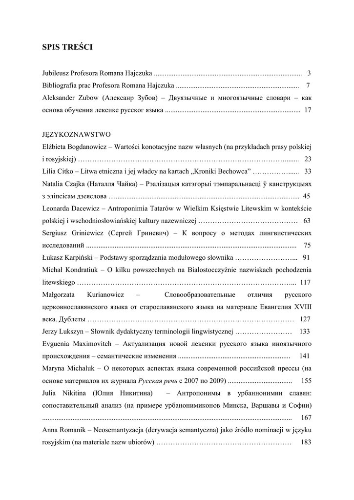 SPIS TREŚCI Jubileusz Profesora Romana Hajczuka ................................................................................... 3 Bibliografia prac Profesora Romana Hajczuka ..................................................................... 7 Aleksander Zubow (Алексанр Зубов) – Двуязычные и многоязычные словари – как основа обучения лексике русског языка ............................................................................ 17 JĘZYKOZNAWSTWO Elżbieta Bogdanowicz – Wartości konotacyjne nazw własnych (na przykładach prasy polskiej i rosyjskiej) ……………………………………………………………………………........ 23 Lilia Citko – Litwa etniczna i jej władcy na kartach „Kroniki Bechowca” ……………...... 33 Natalia Czajka (Наталля Чайка) – Рэалізацыя катэгорыі тэмпаральнасці ў канструкцыях з эліпсісам дзеяслова ........................................................................................................... 45 Leonarda Dacewicz – Antroponimia Tatarów w Wielkim Księstwie Litewskim w kontekście polskiej i wschodniosłowiańskiej kultury nazewniczej …………………………………… 63 Sergiusz Griniewicz (Сергей Гриневич) – К вопросу о методах лингвистических исследований ...................................................................................................................... 75 Łukasz Karpiński – Podstawy sporządzania modułowego słownika ……………………... 91 Michał Kondratiuk – O kilku powszechnych na Bialostocczyźnie nazwiskach pochodzenia litewskiego ………………………………………………………………………………... 117 Małgorzata Kurianowicz – Словообразовательные отличия русского церковнославянского языка от старославянского языка на материале Евангелия XVIII века. Дублеты …………………………………………………………………………… 127 Jerzy Lukszyn – Słownik dydaktyczny terminologii lingwistycznej …………………… 133 Evguenia Maximovitch – Актуализация новой лексики русского языка иноязычного происхождения – семантические изменения ............................................................... 141 Maryna Michaluk – О некоторых аспектах языка современной российской прессы (на основе материалов их журнала Русская речь с 2007 по 2009) .................................... Julia Nikitina (Юлия Никитина) 155 – Антропонимы в урбаннонимии славян: сопоставительный анализ (на примере урбанонимиконов Минска, Варшавы и Софии) ............................................................................................................................................ 167 Anna Romanik – Neosemantyzacja (derywacja semantyczna) jako źródło nominacji w języku rosyjskim (na materiale nazw ubiorów) ………………………………………………… 183 Stanisław Szadyko – Роль и место аббревиатур в русском специальном языке информатики .................................................................................................................. 191 Dorota Szymaniak – O interpretacji zjawisk prozodycznych i rosyjskiej intonacji …… 209 Robert Szymula – Социально обусловленная оценочная коннотативная вариантность терминов (на примере русской общественно-политической терминологии) .......... 221 Jan Zaniewski – Antropolingwistyka dzisiaj ………………………………………….... 229 Wanda Zmarzer – Przysłowia jako obiekt opisu leksykograficznego ………………….. 235 GLOTTODYDAKTYKA Andrzej Bogusławski – Совоизменение в преподавании русского языка полякам. Несколько указаний по вопросу о глоттодидактическом приоритете ...................... Dorota Dziewanowska – Czynniki determinujące kształtowanie 243 kompetencji międzykulturowej w procesie nauczania języka obcego ………………………………... 255 Marzanna Karolczuk – O nauczaniu drugiego języka obcego (analiza programów nauczania jezyka angielskiego, niemieckiego i rosyjskiego) ………………………………………. 265 Krzysztof Rutkowski – Историко-лингвистический экскурс на занятиях русского языка ............................................................................................................................................ 277 Ludmiła Szypielewicz (Людмила Шипелевич) – Особенности текстов из Интернета и их использование в обучении русскому языку как иностранному ................................. 285 DEBIUTY NAUKOWE Michał Mordań – Współczesne typy nazw ulic Bielska Podlaskiego ………………….. 293 Iwona Ostaszewska – Literatura rosyjska wobec problemów ekologii. Rekonesans ....... 305 RECENZJE Jolanta Chomko, Joanna Dziedzic: Polsko-białoruskie zwiazki językowe, literackie,historyczne i kulturowe. Materiały XVI Międzynarodowej Konferencji Naukowej „Droga ku wzajemności”, Białystok 25-26 września 2009 r., pod red. M. Kond
