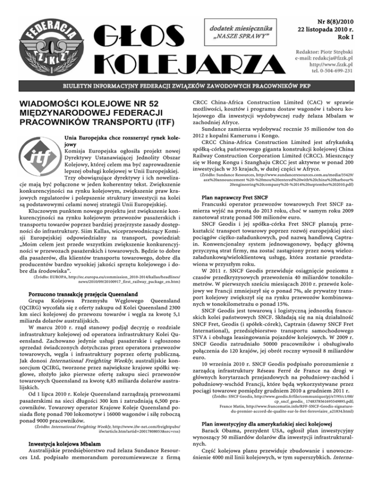 Nr 8(8)/2010 22 listopada 2010 r. Rok I WIADOMOŚCI KOLEJOWE NR 52 MIĘDZYNARODOWEJ FEDERACJI PRACOWNIKÓW TRANSPORTU (ITF) Unia Europejska chce rozszerzyć rynek kolejowy Komisja Europejska ogłosiła projekt nowej Dyrektywy Ustanawiającej Jednolity Obszar Kolejowy, której celem ma być zaprowadzenie lepszej obsługi kolejowej w Unii Europejskiej. Trzy obowiązujące dyrektywy i ich nowelizacje mają być połączone w jeden koherentny tekst. Zwiększenie konkurencyjności na rynku kolejowym, zwiększenie praw krajowych regulatorów i polepszenie struktury inwestycji na kolei są podstawowymi celami nowej strategii Unii Europejskiej. Kluczowym punktem nowego projektu jest zwiększenie konkurencyjności na rynku kolejowym przewozów pasażerskich i transportu towarów poprzez bardziej przejrzyste zasady dostępności do infrastruktury. Siim Kallas, wiceprzewodniczący Komisji Europejskiej odpowiedzialny za transport, powiedział: „Moim celem jest przede wszystkim zwiększenie konkurencyjności w przewozach pasażerskich i towarowych. Będzie to dobre dla pasażerów, dla klientów transportu towarowego, dobre dla producentów bardzo wysokiej jakości sprzętu kolejowego i dobre dla środowiska”. (Źródło: EUROPA, http://ec.europa.eu/commission_2010-2014/kallas/headlines/ news/2010/09/20100917_first_railway_package_en.htm) Porzucono transakcję przejęcia Queensland Grupa Kolejowa Przemysłu Węglowego Queensland (QCIRG) wycofała się z oferty zakupu od Kolei Queensland 2300 km sieci kolejowej do przewozu towarów i węgla za kwotę 5,1 miliarda dolarów australijskich. W marcu 2010 r. rząd stanowy podjął decyzję o rozdziale infrastruktury kolejowej od operatora infrastruktury Kolei Queensland. Zachowano jedynie usługi pasażerskie i ogłoszono sprzedaż świadczonych dotychczas przez operatora przewozów towarowych, węgla i infrastruktury poprzez ofertę publiczną. Jak donosi International Freighting Weekly, australijskie konsorcjum QCIRG, tworzone przez największe krajowe spółki węglowe, złożyło jako pierwsze ofertę zakupu sieci przewozów towarowych Queensland za kwotę 4,85 miliarda dolarów australijskich. Od 1 lipca 2010 r. Koleje Queensland zarządzają przewozami pasażerskimi na sieci długości 300 km i zatrudniają 6,500 pracowników. Towarowy operator Krajowe Koleje Queensland posiada flotę ponad 700 lokomotyw i 16000 wagonów i siłę roboczą ponad 9000 pracowników. (Źródło: International Freighting Weekly, http://www.ifw-net.com/freightpubs/ ifw/article.htm?artid=20017808053&src=rss) Inwestycja kolejowa Mbalam Australijskie przedsiębiorstwo rud żelaza Sundance Resources Ltd. podpisało memorandum porozumiewawcze z firmą CRCC China-Africa Construction Limited (CAC) w sprawie możliwości, kosztów i programu dostaw wagonów i taboru kolejowego dla inwestycji wydobywczej rudy żelaza Mbalam w zachodniej Afryce. Sundance zamierza wydobywać rocznie 35 milionów ton do 2012 z kopalni Kamerunu i Kongo. CRCC China-Africa Construction Limited jest afrykańską spółką-córką państwowego giganta konstrukcji kolejowej China Railway Construction Corporation Limited (CRCC). Mieszczący się w Hong Kongu i Szanghaju CRCC jest aktywne w ponad 200 inwestycjach w 35 krajach, w dużej części w Afryce. (Źródło: Sundance Resources, http://www.sundanceresources.com.au/media/35429/ asx%20announcement %20-%20mou%20entered%20with%20china%20harbour% 20engineering%20company%20-%2014%20september%202010.pdf) Plan naprawczy Fret SNCF Francuski operator przewozów towarowych Fret SNCF zamierza wyjść na prostą do 2013 roku, choć w samym roku 2009 zanotował stratę ponad 500 milionów euro. SNCF Geodis i jej spółka-córka Fret SNCF planują przekształcić transport towarowy poprzez rozwój europejskiej sieci pociągów ciężko-załadunkowych, pod nazwą handlową Captrain. Konwencjonalny system jednowagonowy, będący główną przyczyną strat firmy, ma zostać zastąpiony przez nową wielozzaładunkową/wieloklientową usługę, która zostanie przedstawiona w przyszłym roku. W 2011 r. SNCF Geodis przewiduje osiągnięcie poziomu z czasów przedkryzysowych przewożenia 40 miliardów tonokilometrów. W pierwszych sześciu miesiącach 2010 r. przewóz kolejowy we Francji zmniejszył się o ponad 7%, ale prywatny transport kolejowy zwiększył się na rynku przewozów kombinowanych w tonokilometrażu o ponad 15%. SNCF Geodis jest towarową i logistyczną jednostką francuskich kolei państwowych SNCF. Składają się na nią działalność SNCF Fret, Geodis (i spółek-córek), Captrain (dawny SNCF Fret International), przedsiębiorstwo transportu samochodowego STVA i obsługa leasingowania pojazdów kolejowych. W 2009 r. SNCF Geodis zatrudniało 50000 pracowników i obsługiwało połączenia do 120 krajów, jej obrót roczny wynosił 8 miliardów euro. 10 września 2010 r. SNCF Geodis podpisało porozumienie z zarządcą infrastruktury Réseau Ferré de France na drogi w głównych korytarzach przejazdowych na południowy-zachód i południowy-wschód Francji, które będą wykorzystywane przez pociągi towarowe pomiędzy grudniem 2010 a grudniem 2011 r. (Źródło: SNCF Geodis, http://www.geodis.fr/file/communique/pj/e7/95/c1/00/ cp_sncf_geodis_ 1748378561695549895.pdf; France Matin, http://www.francematin.info/RFF-SNCF-Geodis-signaturedu-premier-accord-de-qualite-sur-le-fret-ferroviaire_a21834.html) Plan inwestycyjny dla amerykańskiej sieci kolejowej Barack Obama, prezydent USA, ogłosił plan inwestycyjny wynoszący 50 miliardów dolarów dla inwestycji infrastrukturalnych. Część kolejowa planu przewiduje zbudowanie i unowocześnienie 4000 mil linii kolejowych, w tym superszybkich. Interna- Głos Kolejarza – 8(8)/2010 – strona 2 tional Railway Journal informuje, że nowa pula inwestycyjna ma być przeznaczona w celu wspomożenia inwestycji w ramach systemu partnerstwa publiczno-prywatnego. Według Transport Weekly przewiduje się, że jednym
