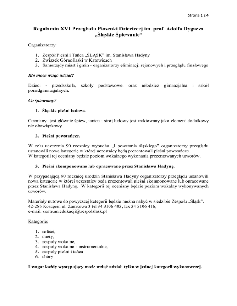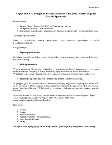 Strona 1 z 4 Regulamin XVI Przeglądu Piosenki Dziecięcej im. prof. Adolfa Dygacza „Śląskie Śpiewanie” Organizatorzy: 1. Zespół Pieśni i Tańca „ŚLĄSK” im. Stanisława Hadyny 2. Związek Górnośląski w Katowicach 3. Samorządy miast i gmin - organizatorzy eliminacji rejonowych i przeglądu finałowego Kto może wziąć udział? Dzieci - przedszkola, ponadgimnazjalnych. szkoły podstawowe, oraz młodzież gimnazjalna i szkół Co śpiewamy? 1. Śląskie pieśni ludowe. Oceniany jest głównie śpiew, taniec i strój ludowy jest traktowany jako element dodatkowy nie obowiązkowy. 2. Pieśni powstańcze. W celu uczczenia 90 rocznicy wybuchu „I powstania śląskiego” organizatorzy przeglądu ustanowili nową kategorię w której uczestnicy będą prezentowali pieśni powstańcze. W kategorii tej oceniany będzie poziom wokalnego wykonania prezentowanych utworów. 3. Pieśni skomponowane lub opracowane przez Stanisława Hadynę. W przypadającą 90 rocznicę urodzin Stanisława Hadyny organizatorzy przeglądu ustanowili nową kategorię w której uczestnicy będą prezentowali pieśni skomponowane lub opracowane przez Stanisława Hadynę. W kategorii tej oceniany będzie poziom wokalny wykonywanych utworów. Materiały nutowe do powyższej kategorii będzie można nabyć w siedzibie Zespołu „Śląsk”. 42-286 Koszęcin ul. Zamkowa 3 tel 34 3106 403, fax 34 3106 416, e-mail: [email protected] Kategorie: 1. 2. 3. 4. 5. 6. soliści, duety, zespoły wokalne, zespoły wokalno - instrumentalne, zespoły pieśni i tańca chóry Uwaga: każdy występujący może wziąć udział tylko w jednej kategorii wykonawczej. Strona 2 z 4 Co będziemy oceniać? – kryteria oceny dobór repertuaru dialekt walory wokalne akompaniament ogólny wyraz artystyczny strój ludowy jako dodatkowy element wyrazu artystycznego ( nie jest obowiązkowy ) Co jest zabronione? – kryteria dyskwalifikacji 1. Akompaniament keyboardu 2. Śpiewanie do pół-playbecku. 3. Przekroczenie wyznaczonego czasu: dla solistów są to 2 pieśni – bez ograniczeń czasowych dla pozostałych kategorii - do 10 minut 4. Uczestnicy nie mogą występować w różnych kategoriach wykonawczych z wyjątkiem kapel i akompaniatorów. 5. Repertuar wykonywany na scenie nie może się powtarzać w przeciągu trzech ostatnich lat. Co można wyśpiewać? – nagrody Ogłoszenie wyników Przeglądu oraz wręczenie nagród nastąpi tylko i wyłącznie w trakcie Koncertu Galowego „Śląskiego Śpiewania” w dniu 30 maja 2009 w Koszęcinie. 1. Nagrodę „Grand Prix” Marszałka Województwa Śląskiego, statuetkę „Szczyglika” Śląskiego Śpiewania oraz nagrodę pieniężną 2. W kategoriach wykonawczych: 1. 2. 3. 4. 5. 6. soliści, duety, zespoły wokalne, zespoły wokalno - instrumentalne, zespoły pieśni i tańca chóry Nagrody pieniężne za I , II i III miejsce. 3. Nagrody specjalne: Udział w koncercie galowym odbywającym się w Koszęcinie podczas podsumowania Przeglądu w dniu 30 maja 2009. Do koncertu zostaną zaproszone najciekawsze Zespoły i wykonawcy wytypowane przez kierownictwa artystyczne zespołu „Śląsk” na każdym z etapów Przeglądu. Strona 3 z 4 Nagroda pieniężna ufundowana przez Towarzystwo Przyjaciół Śląska w Warszawie w kategorii „Pieśni Powstańcze” Nagroda pieniężna ufundowana przez Zespół Pieśni i Tańca Śląsk im Stanisława Hadyny w kategorii „Pieśni skomponowane lub opracowane przez Stanisława Hadynę” Udział w koncercie specjalnym organizowanym przez Zespół Pieśni i Tańca Śląsk im Stanisława Hadyny: zdobywca nagrody „Grand Prix” oraz zespoły zaproszone przez Zespół „Śląsk”. Całoroczna opieka merytoryczna nad zespołem bądź wykonawcą sprawowana przez Zespół Pieśni i Tańca „Śląsk” im. Stanisława Hadyny. Jury może zadecydować o innym podziale nagród. Ostateczna interpretacja regulaminu należy do Jury. Strona 4 z 4 Etapy XVI Przeglądu Piosenki Dziecięcej „ Śląskie Śpiewanie” im. prof. Adolfa Dygacza I etap – eliminacje rejonowe Miejsca przebiegu eliminacji: 1. 2. 3. 4. Czerwionka- Leszczyny Ruda Śląska Suszec Cieszyn 5. Katowice Szopienice 6. Koszęcin ZPiT „Śląsk” 7. Łaziska Górne 8. Łubniany 9. Lędziny 10. Rybnik 11. Częstochowa 12. Zawiercie 13. Zabrze – 17 kwietnia 2009 – 20 kwietnia 2009 – 21 kwietnia 2009 – 15 kwietnia 2009 - 16 kwietnia 2009 - 23 kwietnia 2009 - 15 kwietnia 2009 – 15 kwietnia 2009 – 24 kwietnia 2009 eliminacje odbyły się w grudniu 2008 – „Karlik” II etap – Przegląd finałowy Termin: 12 i 13 maja 2009 Miejsce: Piekary Śląskie III etap - Koncert Galowy Koncert Galowy w wykonaniu uczestników Przeglądu, ogłoszenie wyników, wręczenie nagród oraz wyróżnień, Koncert Zespołu Pieśni i Tańca „ Śląsk” im. Stanisława Hadyny oraz spotkanie integracyjne uczestników wszystkich etapów eliminacji w formie wielkiego pikniku rodzinnego. Termin: 30 maja 2008 Miejsce: siedziba Zespołu Pieśni i Tańca „ Śląsk” im. Stanisława Hadyny, Koszęcin ul. Zamkowa 3 IV etap – Koncert Specjalny Koncert zdobywcy Grand Prix wraz z Zespołem „ Śląsk” podczas specjalnego koncertu okolicznościowego: Termin: 3 października 2009 Miejsce: Dom Muzyki i Tańca w Zabrzu