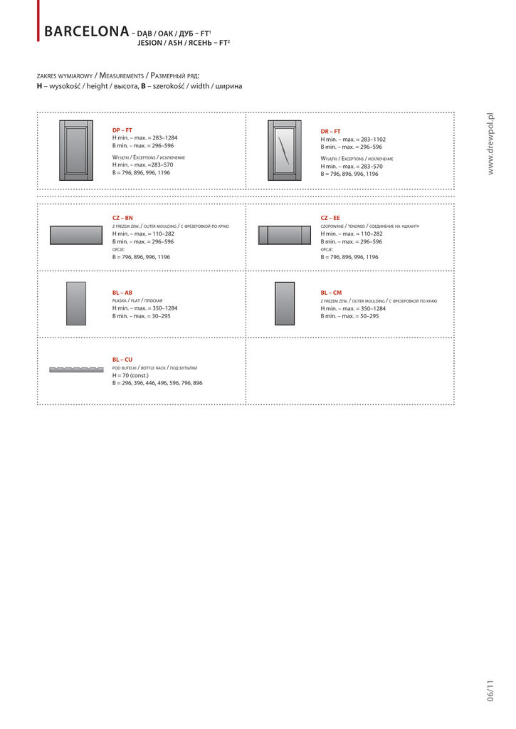 Barcelona – Dąb / Oak / Дуб – FT zakres wymiarowy 1 jesion / ash / Ясень – FT2 / Measurements / Pазмерный ряд: DP – FT H min. – max. = 283–1284 B min. – max. = 296–596 DR – FT H min. – max. = 283–1102 B min. – max. = 296–596 Wyjątki / Exceptions / исключение H min. – max. =283–570 B = 796, 896, 996, 1196 Wyjątki / Exceptions / исключение H min. – max. = 283–570 B = 796, 896, 996, 1196 CZ – BN CZ – EE z frezem zew. / outer moulding / с фрезеровкой по краю czopowane / tenoned / соединение на «шкант» H min. – max. = 110–282 B min. – max. = 296–596 opcje: B = 796, 896, 996, 1196 H min. – max. = 110–282 B min. – max. = 296–596 opcje: B = 796, 896, 996, 1196 BL – AB / flat / плоская H min. – max. = 350–1284 B min. – max. = 30–295 BL – CM płaska www.drewpol.pl H – wysokość / height / высота, B – szerokość / width / ширина z frezem zew. / outer moulding / с фрезеровкой по краю H min. – max. = 350–1284 B min. – max. = 50–295 BL – CU / bottle rack / под бутылки H = 70 (const.) B = 296, 396, 446, 496, 596, 796, 896 06/11 pod butelki