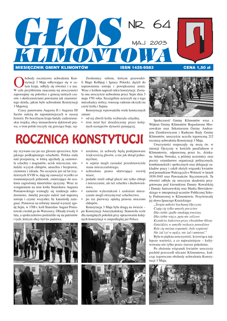 GŁOS KLIMONTOWA NR 64 maj 2003 MIESIĘCZNIK GMINY KLIMONTÓW O bchody rocznicowe uchwalenia Konstytucji 3 Maja odbywające się w całym kraju, odbyły się również i u nas. W celu przybliżenia znaczenia tej uroczystości zapoznajmy się pokrótce z genezą tamtych czasów i okolicznościami powstania tak znamienitego dzieła, jakim było uchwalenie Konstytucji 3 Majowej. Czasy panowania Augusta II i Augusta III Sasów należą do najsmutniejszych w naszej historii. Po bezsilnym kraju hulały cudzoziemskie wojska, obcy monarchowie dyktowali prawa, o tron polski toczyły się gorszące boje, sej- ISSN 1425-9583 Zwolennicy reform, którym przewodzili Hugo Kołłątaj i Ignacy Potocki, dążyli do usprawnienia ustroju i powiększenia armii. Wraz z królem napisali tekst konstytucji. Została ona uroczyście uchwalona przez Sejm dnia 3 maja 1791 roku. Szczególnie ucieszyli się z tego mieszkańcy stolicy, wnosząc radosne okrzyki na cześć króla i Sejmu. Konstytucja wprowadziła wiele koniecznych zmian: • od tej chwili króla wybierała szlachta, • tron miał być dziedziczony przez kolejnych następców dynastii panującej, ROCZNICA KONSTYTUCJI my zrywano raz po raz głosem sprzeciwu, byle jakiego podkupionego szlachetki. Polska stała nad przepaścią, w którą spychały ją samowola szlachty i magnatów, ucisk mieszczan, nieludzki wyzysk chłopów, anarchia i bezprawie, ciemnota i zdrada. Na szczęście już od lat trzydziestych XVIII w. dają się zauważyć wysiłki co rozumniejszych jednostek, zmierzające do ocalenia zagrożonej śmiertelnie ojczyzny. Wraz ze wstąpieniem na tron króla Stanisława Augusta Poniatowskiego wzmogły się tendencje odrodzeniowe, śmielej poczęto radzić nad naprawą ustroju i czynić wszystko, by katastrofę zażegnać. Ponieważ na reformy musiał wyrazić zgodę Sejm, w 1788 r. król Stanisław August Poniatowski zwołał go do Warszawy. Obrady trwały 4 lata, a społeczeństwo podzieliło się na patriotów i tych, którym obcy był los państwa. • ustalono, że uchwały będą podejmowane większością głosów, a nie jak dotąd jednomyślnie, • w sejmie mogli zasiadać przedstawiciele stanu mieszczańskiego, • uchwalono prawo ułatwiające rozwój miast, • podatki mieli odtąd płacić nie tylko chłopi i mieszczanie, ale też szlachta i duchowieństwo, • zamożni wykształceni i zasłużeni mieszczanie mogli otrzymywać szlachectwo, • po raz pierwszy opieką prawna otoczono chłopów. Konstytucja 3 Maja była drugą na świecie – po Konstytucji Amerykańskiej. Stanowiła wzór dla następnych pokoleń przy opracowaniu kolejnych konstytucji w niepodległej już Polsce. CENA 1,50 zł Społeczność Gminy Klimontów wraz z Wójtem Gminy Klimontów Bogusławem Mrozowskim oraz Sekretarzem Gminy Andrzejem Zientkiewiczem i Radnymi Rady Gminy Klimontów, uroczyście uczciła tegoroczną 212 rocznicę uchwalenia Konstytucji 3 Maja. Uroczystości rozpoczęły się mszą św. w intencji Ojczyzny w kościele parafialnym w Klimontowie, odprawioną przez ks. dziekana Adama Nowaka, a później uczestnicy oraz poczty sztandarowe organizacji politycznych, kombatanckich i społecznych oraz delegacje zakładów pracy i szkół złożyli wiązanki kwiatów pod pomnikiem Walczących o Wolność w latach 1939-1945 oraz Powstańców Styczniowych. Tu również odbyła się uroczysta akademia przygotowana pod kierunkiem Danuty Kowalskiej i Danuty Janiszewskiej oraz Marka Słowiakowskiego w interpretacji uczniów Publicznej Szkoły Podstawowej w Klimontowie. Przyświecały jej słowa Ignacego Krasickiego: „Święta miłości kochanej Ojczyzny Czują cię tylko umysły poczciwe Dla ciebie zjadłe smakują trucizny, Dla ciebie więzy, pęta nie zelżywe Kształcisz kalectwo przez chwalebne blizny Gnieździsz w umyśle rozkosze prawdziwe Byle cię można wspomóc, byle wspierać Nie żal żyć w nędzy, nie żal i umierać.” Była to piękna uroczystość, krzewiąca najlepsze wartości, a co najważniejsze – kultywowana nie tylko przez starsze pokolenie. Po złożeniu wiązanek kwiatów uroczysty pochód przeszedł ulicami Klimontowa, kończąc tegoroczne obchody uchwalenia Konstytucji 3 Maja. GŁOS KLIMONTOWA 2 POMÓWMY O UNII Kościół katolicki od zarania swych dziejów, a szczególnie od średniowiecza był gorliwym propagatorem jedności narodów i państw powstających na kontynencie europejskim, wyznających tę samą wiarę i tworzących tę samą kulturę chrześcijańską. Stąd właśnie rodziła się idea zwana „Europa Christiana”. I dziś tenże Kościół Powszechny, jak i nasz polski, lokalny, nie jest w zasadzie przeciwny idei jednoczenia się Europy, byleby uwzględniono te wartości, które wypracował i którymi żyje od dwu tysiącleci, a na gruncie polskim od lat tysiąca. Tę koncepcję zespolenia naszego kraju z Europą Zachodnią, a przede wszystkim Unią Europejską wyraźnie poparł obecny Papież Jan Paweł II w kilku swoich wypowiedziach, mówiąc w jednej z nich: „Dziś stwierdzam z zadowoleniem, że wiele krajów Europy Środkowej i Wschodniej stara się o przyjęcie do Unii Europejskiej, by odegrać w niej twórczą rolę. Mam nadzieję, że polityczni przywódcy Unii pozytywnie odpowiedzą na to pragnienie i okażą w początkowej fazie wyrozumiałość w sprawach związanych z realizacją przewidzianych warunków ekonomicznych z pewnością niełatwych do spełnienia dla wciąż słabych gospodarczo krajów Europy Wschodniej, w których do niedawna jeszcze panował inny system ekonomiczny... Myśląc o Europie troszczę się przede wszystkim o to, aby zachowała ona swoje chrześcijańskie dziedzictwo i pozwoliła mu owocować. Nie można bowiem zaprzeczyć, że tradycja kulturowa kontynentu zakorzeniona jest nie tylko w dziedzictwie grecko-rzymskim lecz także w spuściźnie judeochrześcijańskiej, która przez wieki stanowiła jej najgłębszą istotę... Mam nadzieję, że Unia Europejska będzie mog