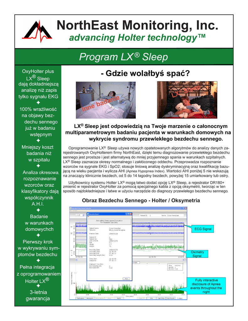 NorthEast Monitoring, Inc. advancing Holter technology™ 3URJUDP/X ® Sleep OxyHolter plus ® LX Sleep GDMąGRNáDGQLHMV]ą DQDOL]ĊQLĪ]DSLV W\ONRV\JQDáX(.* 100% wraĪOLZRĞü na obMawy be] GHFKXVHQQHJR MXĪZEDGDQLX ZVWĊSQ\P *G]LHZRODáE\ĞVSDü? LH DQ G D E ,QQH p lee S LX ® L;® Sleep MHVWRGSRZLHG]Lą QD7ZRMHPDU]HQLHRFDáRQRFQ\P PXOWLSDUDPHWURZ\PEDGDQLXSDFMHQWDZZDUXQNDFKGRPRZ\FKQD Z\NU\FLHV\QGURPXSU]HZOHNáHJREH]GHFKXVHQQHJR MnieMV]\NRV]W EDGDQLDQLĪ ZV]SLWDOX 2SURJUDPRZDQLHLX® Sleep XĪ\ZDQRZ\FKRSDWHWRZDQ\FKDlgor\tmyZ Go aQaOL]\GDQ\FK ]D UHMHVWURZDQ\FK2[\+ROWHUHPILUP\1RUWK(DVWG]LĊNLWHPXGLDJQR]RZDQLHSU]HZOHNáHJREH]GHFKX VHQQHJR MHVWSURVWV]HLMHVWDOWHUQDW\ZąGRPQLHMSU]\MHPQHJRVSDQLDZZDUXQNDFKV]SLWDOQ\FK /;6OHHS]D]QDF]DRNUHV\QRUPDOQHJRL]DNáyFRQHJRRGGHFKX3U]HSURZDG]DUR]SR]QDQLH w]RUFyZQDV\JQDOH(.*L6S2VWRVXMHOLQLRZąDQali]ĊG\VNU\PLQDF\MQąRUD]NZDOLILNDFMĊED]X $QDOL]DRNUHVRZD MąFą na wieku pacMHQWDLZ\OLF]D$+,$SQHD+\SRSQHD,QGH[:DUWRĞFL$+,SRQLĪHMQLHZVND]XMą na ]QDF]ąF\NOLQLF]QLHEH]GHFKRGGRáDJRGQ\EH]GHFKSRZ\ĪHMXPLDUNRZDQ\OXERVWU\ UR]SR]QDZDQLH Z]RUFyZ RUD] klasyfikatory daMą współczynnik A.H.I. %DGDQLH ZZDUXQNDFK GRPRZ\FKFK Pierws]y krok ZZ\NU\ZDQLXV\P SWRPyZEH]GHFKX Peána integracMD ]RSURJUDPRZDQLHP +ROWHULX® 3-letnia gwarancMD 8Ī\WNRZQLF\V\VWHPXHolter LX®PRJąáDWZRGRGDü RSFMĊLX® Sleep DUHMHVWUDWRU'5 ]PLHQLü w reMHVWUDWRU OxyHolter ]DSRPRFąVSHFMDOQHJRNDEOD]RSFMąRNV\PHWULL, twor]ąFZWHQ VSRVyEQDMGRNáDGQLHMV]HL áDWZHZXĪ\FLXQDU]ĊG]LHGRGLDJQR]\SU]HZOHáHJREH]GHFKXVHQQHJR. 2EUD]%H]GHFKX6HQQHJR Holter/ONV\metrLD LX ® Sleep Software OxyHolter plus LX® Sleep GDMąGRNáDGQLHMV]ąDQDOL]ĊQLĪ]DSLV KoU]\ĞFL W\ONRV\JQDáX(.* -HGHQUHMHVWUDWRU GRSpO2 L ECG :F]HĞQLHMV]HV\VWHP\DQDOL]RZDá\W\ONRV\JQDá(.*GRGLDJQR]\ EH]GHFKXVHQQHJR6NRUHORZDQLHUyZQROHJOH]DUHMHVWURZDQ\FKGDQ\FK WspyáF]\QQLN$HI daMHGRNáDGQH (.*L6S2]DSHZQLDZLĊNV]ąGRNáDGQRĞüEDGDQLDEH]GHFKX RV]DFRZDQLHU\]\NDEH]GHFKX 100% wraĪOLZRĞüQDREMDZ\EH]GHFKXsennego MXĪZEDGDQLX ZVWĊSQ\P Już badanie wstępne przeprowadzone za pomocą OxyHoltera jest w 100% wrażliwe na objawy bezdechu sennego, porównywalnie z badaniem przeprowadzonym w warunkach szpitalnych. Mniejszy koszt badania niż w szpitalu Diagnozowanie przewlekłego bezdechu sennego w warunkach szpitalnych wymaga odpowiedniego wyposażenia, obsługi technika czasu i generuje koszty, które można wyeliminować przeprowadzając badanie 2[\+ROWHUHPw warunkach domowych DokáDGQ\Z\QLNEDGDQLDSU]HG ]DELHJLHP FKLUXUJLLNRUHNF\MQHM 1LHF]HNDV]QDPLHMVFHZV]SLWDOX %DGDQLHZZDUXQNDFKGRPRZ\FK WRZLĊNV]\NRPIRUWGODSDFMHQWD 1LĪV]\NRV]WEDGDQLDQLĪZV]SLWDOX 0RĪQDVWRVRZDüXSUDZLHZV]\VW NLFKpaFMenWyZ]EH]GHFKHP $QDOL]DRNUHVRZD, ro]SR]QDZDQLHZ]RUFyZ ora]NODV\ILNDWRU\ Główne funkcje daMą wynik w postaci współczynnika AHI (Apnea Hypopnea Index) ,nterwaá\GDQ\FK]RVWDMąSRG]LHORQHQDW]ZRNUHV\ Pr]HSURZDG]DQH Unikalny algorytm áąF]\GDQH ECG VąEH]SRĞUHGQLHSRPLDU\V\JQDáXE.G EDR L SpO2 dla dokáDGQHJR wylic]HQLD (.*SRFKRGQ\]DSLVRGGHFKX. 5R]SR]QDZDQLH w]RUFyZ i ]HVWDZ ZVSyáF]\QQLND$+, NODV\ILNDWRUyZRSDUW\FKQDZLHNXSR]ZDODMąRNUHĞOLüwspółczynnk$+,. Wygodne wieloparametrowe badanie w warunkach domowych %DGDQLHSDFMHQWDZZDUXQNDFKGRPRZ\FK 6SDQLHZZDUXQNDFKV]SLWDOQ\FKMHVWPDáRSU]\MHPQH OxyHolter /;6OHHSVWZDU]DMąLGHDOQąRND]MĊGRZ\NU\FLDV\QGURPyZSU]HZOH Náego be]dechu sennego podc]DVVQXpacjenta ZHZáDVQ\PGRPX, JG]LHZ\QLNEDGDQLDnie MHVW]DNáyFRQ\V]WXF]QymRWRF]HQLem. Pierwszy krok w wykrywaniu symptomów bezdechu Wykrycie to pierwszy krok. Po postawieniu diagnozy lekarz może zalecić jeden z wielu sposobów leczena – podczas snu do chirurgii korekcyjnej. Pełna integracja z oprogramowaniem Holter LX® LX®Sleep o Holter'a LX®Analysis najlepszy przegląd danych w formie graficznej i generowane raportów uwzględniających parametry EKG, SpO2, współczynnik AHI. Gwarancja do 3 lat Obejmuje bezpłatne wsparcie techniczne poprzez telefoniczną linię serwisową oraz aktualizacje oprogramowania (tzw. updates). (Opcja wydłużenia gwarancji o kolejne 2 lata w ramach programu eMSA) Wyłączny dystrybutor: MARGOT MEDICAL SP. Z O.O. 02-796 Warszawa, ul. Wawozowa 18 / 154-155 Tel.:(0-22) 446-78-80 do 82 ; www.margotmedical.pl January, 2008 Mniejsza liczba elektrod ułatwia i przyśpiesza podłączenie Nie-ulotne przechowywanie danych wyklucza powtarzanie badania Przedstawiene w formie graficznej równolegle danych SpO2 i ECG Raporty zawierają prosty wynik w postaci współczynnika AHI Dostępność àDWZHGRGDQLHGR RSURJUDPRZDQLD +ROWHU/;MDNRRSFMD Współpraca z OxyHolter (kabel do oksymetrii zintegrowany z DR180+) Darmowe update'y w ramach gwarancji, dodatkowo program eMSA NorthEast Monitoring, Inc. Two Clock Tower Place, Suite 555 Maynard, MA 01754 U.S.A. www.nemon.com phone: 978-461-3992 fax: 978-461-5991 toll free: 866-346-5837 0413