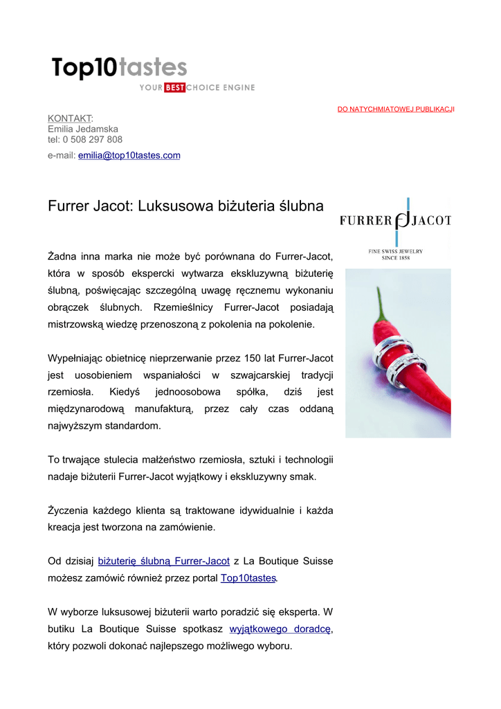 DO NATYCHMIATOWEJ PUBLIKACJI KONTAKT: Emilia Jedamska tel: 0 508 297 808 e-mail: [email protected] Furrer Jacot: Luksusowa biżuteria ślubna Żadna inna marka nie może być porównana do Furrer-Jacot, która w sposób ekspercki wytwarza ekskluzywną biżuterię ślubną, poświęcając szczególną uwagę ręcznemu wykonaniu obrączek ślubnych. Rzemieślnicy Furrer-Jacot posiadają mistrzowską wiedzę przenoszoną z pokolenia na pokolenie. Wypełniając obietnicę nieprzerwanie przez 150 lat Furrer-Jacot jest uosobieniem rzemiosła. wspaniałości Kiedyś międzynarodową w jednoosobowa manufakturą, przez szwajcarskiej spółka, cały tradycji dziś czas jest oddaną najwyższym standardom. To trwające stulecia małżeństwo rzemiosła, sztuki i technologii nadaje biżuterii Furrer-Jacot wyjątkowy i ekskluzywny smak. Życzenia każdego klienta są traktowane idywidualnie i każda kreacja jest tworzona na zamówienie. Od dzisiaj biżuterię ślubną Furrer-Jacot z La Boutique Suisse możesz zamówić również przez portal Top10tastes. W wyborze luksusowej biżuterii warto poradzić się eksperta. W butiku La Boutique Suisse spotkasz wyjątkowego doradcę, który pozwoli dokonać najlepszego możliwego wyboru.