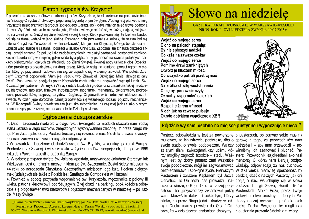 Patron tygodnia św. Krzysztof Z powodu braku szczegółowych informacji o św. Krzysztofie, średniowiecze na podstawie imienia "niosący Chrystusa" stworzyło popularną legendę o tym świętym. Według niej pierwotne imię Krzysztofa miało brzmieć Reprobus (z greckiego Odrażający), gdyż miał on mieć głowę podobną do psa. Wyróżniał się za to niezwykłą siłą. Postanowił więc oddać się w służbę najpotężniejszemu na ziemi panu. Służył najpierw królowi swojej krainy. Kiedy przekonał się, że król ten bardzo boi się szatana, wstąpił w jego służbę. Pewnego dnia przekonał się jednak, że szatan boi się imienia Chrystusa. To wzbudziło w nim ciekawość, kim jest ten Chrystus, którego boi się szatan. Opuścił więc służbę u szatana i poszedł w służbę Chrystusa. Zapoznał się z nauką chrześcijańską i przyjął chrzest. Za pokutę i dla zadośćuczynienia, że służył szatanowi, postanowił zamieszkać nad Jordanem, w miejscu, gdzie woda była płytsza, by przenosić na swoich potężnych barkach pielgrzymów, idących ze Wschodu do Ziemi Świętej. Pewnej nocy usłyszał głos Dziecka, które prosiło go o przeniesienie na drugi brzeg. Kiedy je wziął na ramiona, poczuł ogromny ciężar, który go przytłaczał - zdawało mu się, że zapadnie się w ziemię. Zawołał: "Kto jesteś, Dziecię?" Otrzymał odpowiedź: "Jam jest Jezus, twój Zbawiciel. Dźwigając Mnie, dźwigasz cały świat". Pan Jezus po przyjęciu przez Krzysztofa chrztu miał mu przywrócić wygląd ludzki. Św. Krzysztof jest patronem Ameryki i Wilna; siedzib ludzkich i grodów oraz chrześcijańskiej młodzieży, kierowców, farbiarzy, flisaków, introligatorów, modniarek, marynarzy, pielgrzymów, podróżnych, przewoźników, tragarzy, turystów i żeglarzy. Orędownik w śmiertelnych niebezpieczeństwach. W dzień jego dorocznej pamiątki poświęca się wszelkiego rodzaju pojazdy mechaniczne. W ikonografii Święty przedstawiany jest jako młodzieniec, najczęściej jednak jako olbrzym przechodzący przez rzekę, na barkach niesie Dzieciątko Jezus. . Ogłoszenia duszpasterskie 1. Dziś – szesnasta niedziela w ciągu roku. Ewangelia tej niedzieli ukazała nam troskę Pana Jezusa o Jego uczniów, zmęczonych wykonywaniem zleconej im przez Niego misji. Pan Jezus jako dobry Pasterz troszczy się również o nas. Niech ta prawda towarzyszy nam zarówno w czasie pracy jak i odpoczynku. 2.W czwartek – będziemy obchodzić święto św. Brygidy, zakonnicy, patronki Europy. Pochodziła ze Szwecji i wiele wniosła w życie narodów europejskich, dlatego w 1999 roku Jan Paweł II ogłosił ją patronką Europy 3. W sobotę przypada święto św. Jakuba Apostoła, nazywanego Jakubem Starszym lub Większym. Jest on drugim męczennikiem po św. Szczepanie. Został ścięty mieczem w 44 roku po narodzeniu Chrystusa. Szczególnym miejscem jego kultu i celem pielgrzymek (udających się także z Polski) jest Santiago de Compostela w Hiszpanii. 4. Również w sobotę przypada wspomnienie św. Krzysztofa, męczennika z połowy III wieku, patrona kierowców i podróżujących. Z tej okazji na parkingu obok kościoła odbędzie się błogosławieństwo kierowców i pojazdów mechanicznych w niedzielę – po każdej Mszy Świętej. „ Słowo na niedzielę” - gazetka Parafii Wojskowej pw. Św. Jana Pawła II w Warszawie -Wesołej. Redaguje ks. Proboszcz. Adres do korespondencji: Parafia Wojskowa pw. św. Jana Pawła II 05-075 Warszawa-Wesoła ul. Okuniewska 1 tel./fax (22) 681 20 77, e-mail: kapelan@wesoła.3.pl Słowo na niedzielę GAZETKA PARAFII WOJSKOWEJ W WARSZAWIE-WESOŁEJ NR 39, ROK I, XVI NIEDZIELA ZWYKŁA 19.07.2015 r. Wejdź do mojego serca Cicho na palcach stąpając By nie spłoszyć nadziei Co każe na zawsze czekać Wejdź do mojego serca Pomimo drzwi zamkniętych Otwórz je kluczem miłości Co wszystko potrafi przetrzymać Wejdź do mojego serca Na krótką chwilę westchnienia Chcę by ponownie ożyły Okruchy wspomnień dalekich Wejdź do mojego serca Rozpal je żarem ufności Niech już na zawsze pulsuje Okryte dotykiem współczucia XBR Pójdźcie wy sami osobno na miejsce pustynne i wypocznijcie nieco.” Pasterz, odpowiedzialny jest za powierzone mu owce, za ich zdrowie, pastwiska, dba o swoje stado, o swoje podopieczne. Walczy ze złymi siłami, zwierzętami, czy ludźmi, którzy mogliby zagrozić trzodzie – stadu. Ważnym jest by dobry pasterz znał wszystkie swoje podopieczne, mógł im zagwarantować bezpieczeństwo i spokojne życie. Pierwszym Pasterzem i zarazem Kapłanem był Jezus Chrystus. To On nadal nas prowadzi i naucza o wierze, o Bogu Ojcu, o naszej przyszłości, bo „przyszedłszy zwiastował pokój wam, którzyście daleko, i pokój tym, którzy blisko, bo przez Niego jedni i drudzy w jednym Duchu mamy przystęp do Ojca.” Dobrze, że w dzisiejszych czytaniach słyszymy . o pasterzach, bo zdawać sobie musimy sprawę z tego, że przewodników nam potrzeba i – aby nam przewodzili – powinniśmy ich szanować i słuchać. Pasterz i Przewodnik, są określani jako nasi mentorzy, Ci którzy nami kierują, podpowiadają, odpowiadają za nas duchowo. W XXI wieku, mamy tę sposobność by bardziej dbać o naszych Pasterzy, jak oni dbają o nas, wsłuchujmy się w słowa podczas Liturgii Słowa, Homilii, listów Pasterskich. Matko Boża, przez Twoje wstawiennictwo prosimy o dobrych Pasterzy naszej owczarni, uproś dla nich Łaskę Ducha Świętego, by mogli nas nieustannie prowadzić ścieżkami wiary. Liturgia Słowa na XVI Niedzielę Zwykłą I Czytanie Jr 23,1-6 II Czytanie Ef 2,13-18 Czytanie z Księgi proroka Jeremiasza Pan mówi: „Biada pasterzom, którzy prowadzą do zguby i rozpraszają owce mojego pastwiska”. Dlatego to mówi Bóg Izraela, o pasterzach, którzy mają paść mój naród: „Wy rozproszyliście moją trzodę, rozpędziliście i nie zatroszczyliście się o nią; oto Ja się zatroszczę o nieprawość waszych