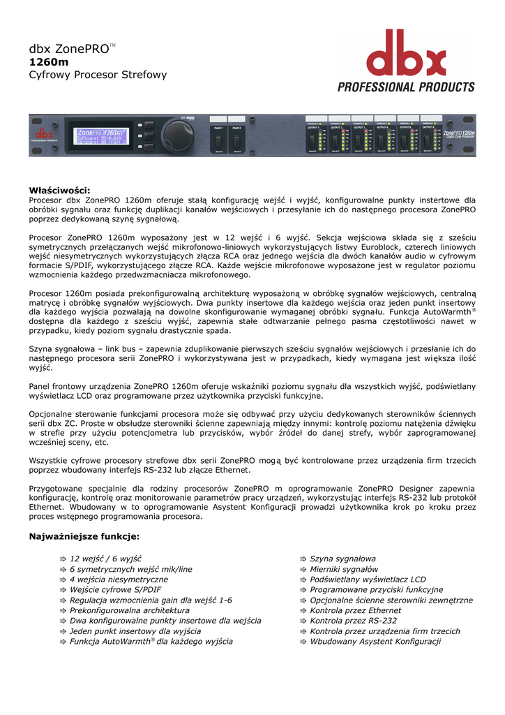 dbx ZonePRO™ 1260m Cyfrowy Procesor Strefowy Właściwości: Procesor dbx ZonePRO 1260m oferuje stałą konfigurację wejść i wyjść, konfigurowalne punkty instertowe dla obróbki sygnału oraz funkcję duplikacji kanałów wejściowych i przesyłanie ich do następnego procesora ZonePRO poprzez dedykowaną szynę sygnałową. Procesor ZonePRO 1260m wyposażony jest w 12 wejść i 6 wyjść. Sekcja wejściowa składa się z sześciu symetrycznych przełączanych wejść mikrofonowo-liniowych wykorzystujących listwy Euroblock, czterech liniowych wejść niesymetrycznych wykorzystujących złącza RCA oraz jednego wejścia dla dwóch kanałów audio w cyfrowym formacie S/PDIF, wykorzystującego złącze RCA. Każde wejście mikrofonowe wyposażone jest w regulator poziomu wzmocnienia każdego przedwzmacniacza mikrofonowego. Procesor 1260m posiada prekonfigurowalną architekturę wyposażoną w obróbkę sygnałów wejściowych, centralną matrycę i obróbkę sygnałów wyjściowych. Dwa punkty insertowe dla każdego wejścia oraz jeden punkt insertowy dla każdego wyjścia pozwalają na dowolne skonfigurowanie wymaganej obróbki sygnału. Funkcja AutoWarmth ® dostępna dla każdego z sześciu wyjść, zapewnia stałe odtwarzanie pełnego pasma częstotliwości nawet w przypadku, kiedy poziom sygnału drastycznie spada. Szyna sygnałowa – link bus – zapewnia zduplikowanie pierwszych sześciu sygnałów wejściowych i przesłanie ich do następnego procesora serii ZonePRO i wykorzystywana jest w przypadkach, kiedy wymagana jest wi ększa ilość wyjść. Panel frontowy urządzenia ZonePRO 1260m oferuje wskaźniki poziomu sygnału dla wszystkich wyjść, podświetlany wyświetlacz LCD oraz programowane przez użytkownika przyciski funkcyjne. Opcjonalne sterowanie funkcjami procesora może się odbywać przy użyciu dedykowanych sterowników ściennych serii dbx ZC. Proste w obsłudze sterowniki ścienne zapewniają między innymi: kontrolę poziomu natężenia dźwięku w strefie przy użyciu potencjometra lub przycisków, wybór źródeł do danej strefy, wybór zaprogramowanej wcześniej sceny, etc. Wszystkie cyfrowe procesory strefowe dbx serii ZonePRO mogą być kontrolowane przez urządzenia firm trzecich poprzez wbudowany interfejs RS-232 lub złącze Ethernet. Przygotowane specjalnie dla rodziny procesorów ZonePRO m oprogramowanie ZonePRO Designer zapewnia konfigurację, kontrolę oraz monitorowanie parametrów pracy urządzeń, wykorzystując interfejs RS-232 lub protokół Ethernet. Wbudowany w to oprogramowanie Asystent Konfiguracji prowadzi użytkownika krok po kroku przez proces wstępnego programowania procesora. Najważniejsze funkcje: ⇛ ⇛ ⇛ ⇛ ⇛ ⇛ ⇛ ⇛ ⇛ 12 wejść / 6 wyjść 6 symetrycznych wejść mik/line 4 wejścia niesymetryczne Wejście cyfrowe S/PDIF Regulacja wzmocnienia gain dla wejść 1-6 Prekonfigurowalna architektura Dwa konfigurowalne punkty insertowe dla wejścia Jeden punkt insertowy dla wyjścia Funkcja AutoWarmth® dla każdego wyjścia ⇛ ⇛ ⇛ ⇛ ⇛ ⇛ ⇛ ⇛ ⇛ Szyna sygnałowa Mierniki sygnałów Podświetlany wyświetlacz LCD Programowane przyciski funkcyjne Opcjonalne ścienne sterowniki zewnętrzne Kontrola przez Ethernet Kontrola przez RS-232 Kontrola przez urządzenia firm trzecich Wbudowany Asystent Konfiguracji dbx ZonePRO™ 1260m Cyfrowy Procesor Strefowy Specyfikacja: Wskaźniki na panelu frontowym: Dla każdego wyjścia: Inne: Wejścia analogowe: Typ: Impedancja (Euroblock): Impedancja (RCA): Max. poziom wejścia liniowego: CMRR: Zakres regulacji gain: Szumy dla wejścia mic: Zasilanie Phantom: Wyjścia analogowe: Typ: Impedancja: Max. poziom wyjścia: 6 niezależnych mierników sześciosegmentowych, zakres od -30 do +30 dBu, wskaźnik przekroczenia zadanego progu limitera podświetlany wyświetlacz LCD z informacjami o wyborze źródła, poziomie w strefie, wyciszeniu, funkcjach przycisków funkcyjnych 12 – w tym 6 symetrycznych mikrofonowo-liniowych, 4 niesymetryczne zsumowane, cyfrowe S/PDIF Euroblock dla wejść mikrofonowo-liniowych, RCA dla wejść niesymetrycznych >50kΩ symetrycznie, >25kΩ niesymetrycznie, odfiltrowana RF >25kΩ niesymetrycznie, odfiltrowana RF +20dBu Mic/Line, +12dBu RCA >40dB, typowo >55dB przy 1kHz 30 do 60dB <-118dBu, 22Hz-22kHz, impedancja źródła 150Ω +15VDC 6 Euroblock, elektronicznie symetryzowane, odfiltrowane RF 120Ω symetrycznie, 60Ω niesymetrycznie +20dBu Przetworniki A/D: Typ: Dynamika sygnału liniowego: Dynamika konwersji Type IV™: Częstotliwość próbkowania: system konwersji dbx Type IV™ >113dB A-ważone, >110dB nieważone >119dB A-ważone, 22kHz BW: >117dB, nieważone, 22kHz BW 48kHz Przetworniki D/A: Dynamika: System: Dynamika: Zniekształcenia THD+N: Pasmo przenoszenia: Przesłuchy międzykanałowe: Przesłuchy (wejście-wyjście): Zasilanie: Pobór mocy : Wymiary: Waga: 112dB A-ważone, 109dB nieważone, 22kHz BW >110dB A-ważone, >107dB nieważone, 22kHz BW 0.003% typowo przy +4dBu, 1kHz, 0dB gain 20Hz – 20kHz, +/- 0.5dB >80dB typowo >80dB 100-240 VAC, 50/60Hz 27 W wysokość: 45mm (1.75”, 1U), szerokość: 483mm (19”), głębokość: 197mm (7.75”) 2.81kg, w opakowaniu transportowym: 3.78kg