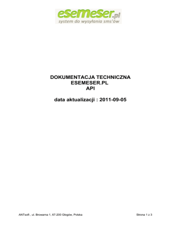 DOKUMENTACJA TECHNICZNA ESEMESER.PL API data aktualizacji : 2011-09-05 ANTsoft , ul. Browarna 1, 67-200 Głogów, Polska Strona 1 z 3 Dokument zawiera szczegółowe informacje odnośnie sposobu przesyłania zapytań poprzez API umożliwiający wysyłanie SMS'ów. Skrypt umożliwiający wysyłkę smsa znajduje się pod adresem : www.esemeser.pl/0api/wyslij.php Można używać zarówno POST jak i GET. Parametry wejściowe : – konto - nazwa konta w systemie esemeser.pl – login - login użytkownika w systemie esemeser.pl – haslo - hasło użytkownika w systemie esemeser.pl – rodzaj - rodzaj smsa – możliwe 4 wartości : a) eco – najtańszy sms z losowym polem nadawcy, bez potwierdzenia dostarczenia b) standard – sms z losowym polem nadawcy, z potwierdzeniem dostarczenia c) plus – sms z edytowalnym polem nadawcy – pole pobierane z ustawień w systemie esemeser.pl d) plus2 – sms z edytowalnym polem nadawcy – pole pobierane z ustawień w systemie esemeser.pl w przypadku braku tej zmiennej zostanie wysłany sms według danych określonych w parametrach systemu esemeser.pl – nazwa - nazwa klienta do którego wysyłana jest wiadomość – maksymalna długość ciągu 80 znaków – telefon - numer komórki w formacie XXXXXXXXX – 9 cyfr – możliwa wysyłka do polskich operatorów. – tresc - treść smsa – maksymalnie 160 znaków, wszystkie litery polskie zostaną zamienione na ich odpowiedniki bezogonkowe. Niedozwolone znaki ' '' oraz / Skrypt zwraca następujące wartości : – – – – – -1 -2 -3 OK NIE - nie istnieje konto o podanej nazwie konto istnieje ale login i/lub hasło są błędne podany numer nie jest numerem na telefon komórkowy wiadomość została przyjęta do wysyłki. wiadomość nie została wysłana Przy każdej wysyłce SMSa system sprawdza, czy w bazie znajduje się podany numer telefonu komórkowego. Jeżeli nie ma – dopisuje do bazy klienta o podanej nazwie i numerze. ANTsoft , ul. Browarna 1, 67-200 Głogów, Polska Strona 2 z 3 Skrypt umożliwiający sprawdzenie ilości możliwych do wysłania smsów znajduje się pod adresem : www.esemeser.pl/0api/sprawdz.php Można używać zarówno POST jak i GET. Parametry wejściowe : – konto - nazwa konta w systemie esemeser.pl – login - login użytkownika w systemie esemeser.pl – haslo - hasło użytkownika w systemie esemeser.pl – rodzaj - rodzaj smsa – możliwe 3 wartości : a) eco – najtańszy sms z losowym polem nadawcy, bez potwierdzenia dostarczenia b) standard – sms z losowym polem nadawcy, z potwierdzeniem dostarczenia c) plus – sms z edytowalnym polem nadawcy – pole pobierane z ustawień w systemie esemeser.pl c) plus2 – sms z edytowalnym polem nadawcy – pole pobierane z ustawień w systemie esemeser.pl w przypadku braku tej zmiennej zostanie wysłany sms według danych określonych w parametrach systemu esemeser.pl Skrypt zwraca następujące wartości : – – – -1 -2 x - nie istnieje konto o podanej nazwie konto istnieje ale login i/lub hasło są błędne gdzie x to liczba możliwych do wysłania sms'ów – jeżeli podaliśmy zmienną rodzaj to skrypt zwróci liczbę możliwych do wysłania smsów danego rodzaju. Jeżeli nie zdefiniowana zmienna rodzaj, skrypt zwróci ilość możliwych do wysłania smsów według rodzaju zdefiniowanego w systemie. ANTsoft , ul. Browarna 1, 67-200 Głogów, Polska Strona 3 z 3