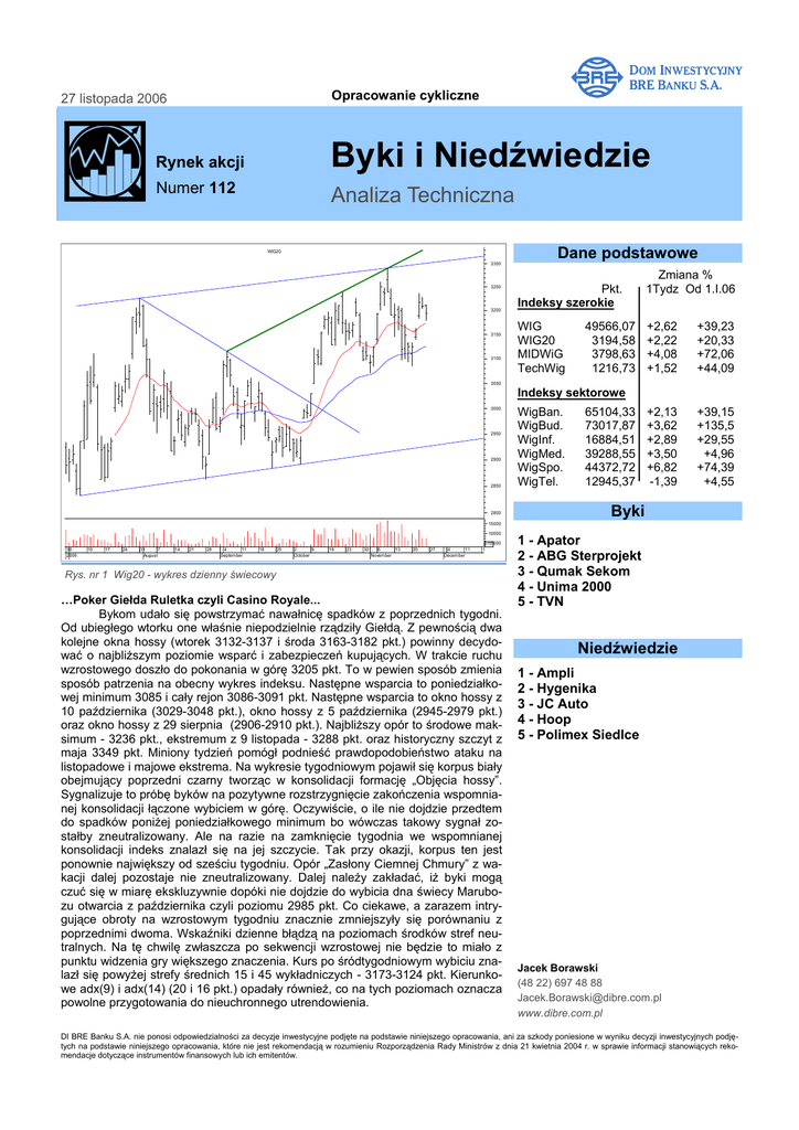 Byki i Niedźwiedzie BRE Bank BRE Bank Securities Opracowanie cykliczne 27 listopada 2006 Rynek akcji Byki i Niedźwiedzie Numer 112 Analiza Techniczna WIG20 3300 3250 3200 3150 3100 3050 3000 2950 2900 2850 2800 Dane podstawowe Pkt. Indeksy szerokie WIG WIG20 MIDWiG TechWig 49566,07 3194,58 3798,63 1216,73 Zmiana % 1Tydz Od 1.I.06 +2,62 +2,22 +4,08 +1,52 +39,23 +20,33 +72,06 +44,09 +2,13 +3,62 +2,89 +3,50 +6,82 -1,39 +39,15 +135,5 +29,55 +4,96 +74,39 +4,55 Indeksy sektorowe WigBan. WigBud. WigInf. WigMed. WigSpo. WigTel. 65104,33 73017,87 16884,51 39288,55 44372,72 12945,37 Byki 15000 10000 5000 x100 30 2006 10 17 24 31 7 August 14 21 28 4 11 September 18 25 2 9 October 16 23 30 6 13 November 20 27 4 11 December 1 Rys. nr 1 Wig20 - wykres dzienny świecowy …Poker Giełda Ruletka czyli Casino Royale... Bykom udało się powstrzymać nawałnicę spadków z poprzednich tygodni. Od ubiegłego wtorku one właśnie niepodzielnie rządziły Giełdą. Z pewnością dwa kolejne okna hossy (wtorek 3132-3137 i środa 3163-3182 pkt.) powinny decydować o najbliższym poziomie wsparć i zabezpieczeń kupujących. W trakcie ruchu wzrostowego doszło do pokonania w górę 3205 pkt. To w pewien sposób zmienia sposób patrzenia na obecny wykres indeksu. Następne wsparcia to poniedziałkowej minimum 3085 i cały rejon 3086-3091 pkt. Następne wsparcia to okno hossy z 10 października (3029-3048 pkt.), okno hossy z 5 października (2945-2979 pkt.) oraz okno hossy z 29 sierpnia (2906-2910 pkt.). Najbliższy opór to środowe maksimum - 3236 pkt., ekstremum z 9 listopada - 3288 pkt. oraz historyczny szczyt z maja 3349 pkt. Miniony tydzień pomógł podnieść prawdopodobieństwo ataku na listopadowe i majowe ekstrema. Na wykresie tygodniowym pojawił się korpus biały obejmujący poprzedni czarny tworząc w konsolidacji formację „Objęcia hossy”. Sygnalizuje to próbę byków na pozytywne rozstrzygnięcie zakończenia wspomnianej konsolidacji łączone wybiciem w górę. Oczywiście, o ile nie dojdzie przedtem do spadków poniżej poniedziałkowego minimum bo wówczas takowy sygnał zostałby zneutralizowany. Ale na razie na zamknięcie tygodnia we wspomnianej konsolidacji indeks znalazł się na jej szczycie. Tak przy okazji, korpus ten jest ponownie największy od sześciu tygodniu. Opór „Zasłony Ciemnej Chmury” z wakacji dalej pozostaje nie zneutralizowany. Dalej należy zakładać, iż byki mogą czuć się w miarę ekskluzywnie dopóki nie dojdzie do wybicia dna świecy Marubozu otwarcia z października czyli poziomu 2985 pkt. Co ciekawe, a zarazem intrygujące obroty na wzrostowym tygodniu znacznie zmniejszyły się porównaniu z poprzednimi dwoma. Wskaźniki dzienne błądzą na poziomach środków stref neutralnych. Na tę chwilę zwłaszcza po sekwencji wzrostowej nie będzie to miało z punktu widzenia gry większego znaczenia. Kurs po śródtygodniowym wybiciu znalazł się powyżej strefy średnich 15 i 45 wykładniczych - 3173-3124 pkt. Kierunkowe adx(9) i adx(14) (20 i 16 pkt.) opadały również, co na tych poziomach oznacza powolne przygotowania do nieuchronnego utrendowienia. 1 - Apator 2 - ABG Sterprojekt 3 - Qumak Sekom 4 - Unima 2000 5 - TVN Niedźwiedzie 1 - Ampli 2 - Hygenika 3 - JC Auto 4 - Hoop 5 - Polimex Siedlce Jacek Borawski (48 22) 697 48 88 [email protected] www.dibre.com.pl DI BRE Banku S.A. nie ponosi odpowiedzialności za decyzje inwestycyjne podjęte na podstawie niniejszego opracowania, ani za szkody poniesione w wyniku decyzji inwestycyjnych podjętych na podstawie niniejszego opracowania, które nie jest rekomendacją w rozumieniu Rozporządzenia Rady Ministrów z dnia 21 kwietnia 2004 r. w sprawie informacji stanowiących rekomendacje dotyczące instrumentów finansowych lub ich emitentów. Byki i Niedźwiedzie BRE Bank Byki Directnl Movem ent ADX (20.0000) 35 30 25 20 15 Apator (25.9600, 25.9700, 25.5100, 25.8400, -0.09000) Apator Kurs - 25,84 zł. 28.0 27.5 27.0 Oczekiwany zasięg - 26.5 26.0 25.5 25.0 24.5 24.0 23.5 23.0 Wygląda na to że korekta zakończyła się o czym informuje poniedziałkowa biała świeca. Obrót ostatnio niezbyt wysoki co zwiększa ryzyko wyjścia z pozycji. Po naruszeniu 24,12 zł. zamknie byka. 22.5 22.0 21.5 21.0 20.5 20.0 15000 10000 5000 x10 14 21 28 4 Septem ber 11 18 25 2 October 9 16 23 30 6 November 13 20 27 4 December 1 ABG Ster - Proje (7.14000, 7.14000, 7.00000, 7.10000, +0.0000) 8.30 8.25 8.20 ABG Sterprojekt Kurs - 7,10 zł. 8.15 8.10 8.05 8.00 Oczekiwany zasięg - 7.95 7.90 7.85 7.80 7.75 7.70 7.65 7.60 7.55 7.50 Środowa świeca robi wrażenie i może być sygnałem że byki śmielej zaatakują wyższe poziomy. Oczywiście spadek poniżej 6,75 zł. Potraktujemy jako sygnał do zamykania byka. 7.45 7.40 7.35 7.30 7.25 7.20 7.15 7.10 7.05 7.00 6.95 6.90 6.85 6.80 6.75 6.70 6.65 6.60 6.55 20000 x10 28 4 September 11 18 25 2 October 9 16 23 30 6 November 13 20 27 4 December 1 QSM (9.70000, 9.73000, 9.55000, 9.63000, -0.07000) 10.0 Qumak Sekom Kurs - 9,63 zł. Oczekiwany zasięg 9.5 9.0 8.5 8.0 7.5 10000 5000 x100 3 2006 14 21 28 4 11 September 18 25 2 9 October 16 23 30 6 13 November 20 27 4 1 Decembe Tu także środowa sesja decyduje o możliwości powrotu do rynku byka. Sam układ jednakże wydaje się dość trudny. Bez względu na to po naruszeniu 9,17 zł. zamkniemy byka. Byki i Niedźwiedzie BRE Bank 15.4 U2K (14.6000, 14.8900, 14.4000, 14.8900, +0.34000) 15.3 0.0% 15.2 Unima Kurs - 14,89 zł. 15.1 15.0 14.9 Oczekiwany zasięg - 14.8 14.7 23.6% 14.6 14.5 14.4 38.2% 14.3 14.2 14.1 50.0% 14.0 13.9 Wydaje się że rynek skorygował poprzednią falę wzrostową próbując powrócić do trendu. Piątkowy ruch w górę premiuje byki do dalszej akcji. Spadek poniżej 14,12 zł. zamknie byka 13.8 61.8% 13.7 13.6 13.5 13.4 13.3 13.2 13.1 13.0 12.9 100.0% 12.8 12.7 12.6 50000 6 2006 16 23 30 6 November 13 20 27 4 December 11 Directnl Movement ADX (21.0000) 40 30 20 10 TVN (119.000, 121.400, 118.700, 121.000, +1.60000) 