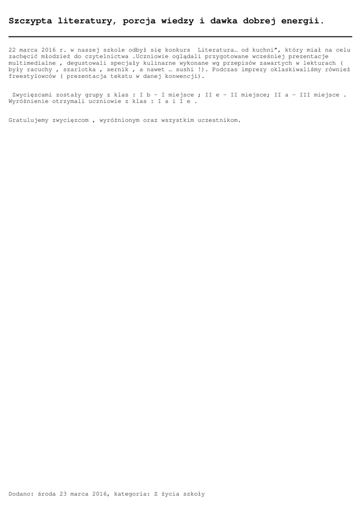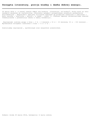Szczypta literatury, porcja wiedzy i dawka dobrej energii. 22 marca 2016 r. w naszej szkole odbył się konkurs „Literatura… od kuchni”, który miał na celu zachęcić młodzież do czytelnictwa .Uczniowie oglądali przygotowane wcześniej prezentacje multimedialne , degustowali specjały kulinarne wykonane wg przepisów zawartych w lekturach ( były racuchy , szarlotka , sernik , a nawet … sushi !). Podczas imprezy oklaskiwaliśmy również freestylowców ( prezentacja tekstu w danej konwencji). Zwycięzcami zostały grupy z klas : I b – I miejsce ; II e – II miejsce; II a – III miejsce . Wyróżnienie otrzymali uczniowie z klas : I a i I e . Gratulujemy zwycięzcom , wyróżnionym oraz wszystkim uczestnikom. Dodano: środa 23 marca 2016, kategoria: Z życia szkoły