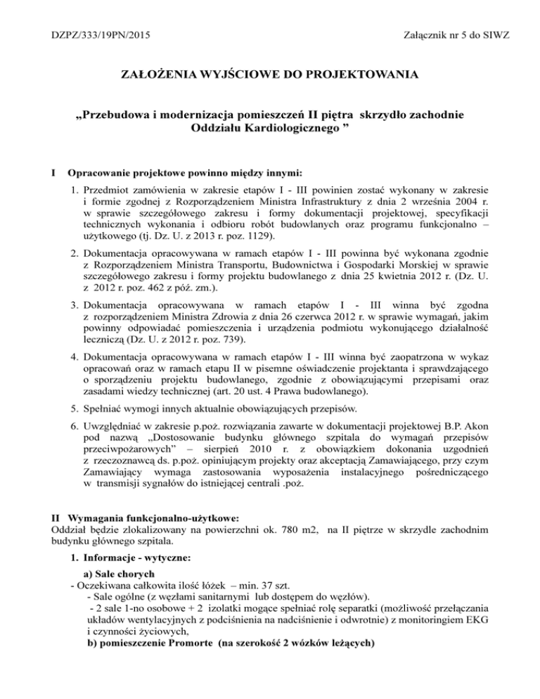 DZPZ/333/19PN/2015 Załącznik nr 5 do SIWZ ZAŁOŻENIA WYJŚCIOWE DO PROJEKTOWANIA „Przebudowa i modernizacja pomieszczeń II piętra skrzydło zachodnie Oddziału Kardiologicznego ” I Opracowanie projektowe powinno między innymi: 1. Przedmiot zamówienia w zakresie etapów I - III powinien zostać wykonany w zakresie i formie zgodnej z Rozporządzeniem Ministra Infrastruktury z dnia 2 września 2004 r. w sprawie szczegółowego zakresu i formy dokumentacji projektowej, specyfikacji technicznych wykonania i odbioru robót budowlanych oraz programu funkcjonalno – użytkowego (tj. Dz. U. z 2013 r. poz. 1129). 2. Dokumentacja opracowywana w ramach etapów I - III powinna być wykonana zgodnie z Rozporządzeniem Ministra Transportu, Budownictwa i Gospodarki Morskiej w sprawie szczegółowego zakresu i formy projektu budowlanego z dnia 25 kwietnia 2012 r. (Dz. U. z 2012 r. poz. 462 z póź. zm.). 3. Dokumentacja opracowywana w ramach etapów I - III winna być zgodna z rozporządzeniem Ministra Zdrowia z dnia 26 czerwca 2012 r. w sprawie wymagań, jakim powinny odpowiadać pomieszczenia i urządzenia podmiotu wykonującego działalność leczniczą (Dz. U. z 2012 r. poz. 739). 4. Dokumentacja opracowywana w ramach etapów I - III winna być zaopatrzona w wykaz opracowań oraz w ramach etapu II w pisemne oświadczenie projektanta i sprawdzającego o sporządzeniu projektu budowlanego, zgodnie z obowiązującymi przepisami oraz zasadami wiedzy technicznej (art. 20 ust. 4 Prawa budowlanego). 5. Spełniać wymogi innych aktualnie obowiązujących przepisów. 6. Uwzględniać w zakresie p.poż. rozwiązania zawarte w dokumentacji projektowej B.P. Akon pod nazwą „Dostosowanie budynku głównego szpitala do wymagań przepisów przeciwpożarowych” – sierpień 2010 r. z obowiązkiem dokonania uzgodnień z rzeczoznawcą ds. p.poż. opiniującym projekty oraz akceptacją Zamawiającego, przy czym Zamawiający wymaga zastosowania wyposażenia instalacyjnego pośredniczącego w transmisji sygnałów do istniejącej centrali .poż. II Wymagania funkcjonalno-użytkowe: Oddział będzie zlokalizowany na powierzchni ok. 780 m2, na II piętrze w skrzydle zachodnim budynku głównego szpitala. 1. Informacje - wytyczne: a) Sale chorych - Oczekiwana całkowita ilość łóżek – min. 37 szt. - Sale ogólne (z węzłami sanitarnymi lub dostępem do węzłów). - 2 sale 1-no osobowe + 2 izolatki mogące spełniać rolę separatki (możliwość przełączania układów wentylacyjnych z podciśnienia na nadciśnienie i odwrotnie) z monitoringiem EKG i czynności życiowych, b) pomieszczenie Promorte (na szerokość 2 wózków leżących) DZPZ/333/19PN/2015 Załącznik nr 5 do SIWZ c) gabinet zabiegowy (ze stanowiskiem komputerowym) d) wygospodarowanie wnęk w ścianach korytarza na szafy wnękowe 2. Przygotowanie pomieszczeń dla pracowników zatrudnionych na najliczniejszej zmianie oddziału , dla personelu o strukturze i ilości jak niżej: Stanowisko Łącznie Kobiety Mężczyźni Ordynator 1(1) Lekarze kontraktowi 6(7) 3(4) 3(3) Lekarze rezydenci 5(9) 3(5) 2(4) Pielęgniarka oddziałowa 1(1) 1(1) Pielęgniarki 5(30) 5(30) Sekretarki medyczne 3(3) 3(3) Razem 21(51) 15(43) 1(1) Adiunkci 6(8) UWAGA: w nawiasach podano całkowitą ilość zatrudnionego personelu w tym m.in. : - gabinet ordynatora - gabinet p. oddziałowej - gabinet lekarski 3. Pozostałe funkcje stosownie do wymogów określonych w pkt. 2 i 3 oraz wynikające z innych potrzeb Zamawiającego powstałych w trakcie projektowania, w tym m.in. brudownik, pom. porządkowe, magazynki, kuchenka oddz., pomieszczenie lub miejsce pobytu dziennego, pkt pielęgniarski (3 stanowiska komputerowe) z pom. przygot. (1 stanowisko komputerowe) i pom. socjalnym, pom. wc dla odwiedzających i niepełnosprawnych, węzeł sanitarny dla personelu, pom. na wózki. III Zakres opracowania projektowego powinien obejmować: 1. Kompletne projekty – budowlany wraz z częścią technologiczną i projekt wykonawczy wraz z wszelkimi opracowaniami branżowymi w ilości 6 kpl. w wersji papierowej i 2 kpl. w wersji elektronicznej edytowalnej w formatach obsługiwanych przez program autocad oraz norma, a także wersja do odczytu pdf na płycie DVD, CD lub masowej pamięci przenośnej (pendrive). 2. Projekty aranżacji wnętrz wraz z kolorystyką i wyceną wyposażenia objętego projektem technologii – w tym zabudowy meblowej montowanej na stałe. Łącznie z rysunkami wykonawczymi mebli (zabudowywanych na stałe i ruchomych) uzgodnionymi z Zamawiającym. Inwentaryzację stanu istniejącego. 3. DZPZ/333/19PN/2015 Załącznik nr 5 do SIWZ 4. Kosztorys inwestorski sporządzony zgodnie z Rozporządzeniem Ministra Infrastruktury z dnia 18 maja 2004 r. (Dz. U. 2004 nr 130 poz. 1389) w sprawie metod i podstaw sporządzania kosztorysu inwestorskiego, obliczania planowanych kosztów prac projektowych oraz planowanych kosztów robót budowlanych określonych w programie funkcjonalno-użytkowym w wersji szczegółowej z przedmiarem robót. 5. Specyfikację techniczną odnoszące się do pozycji kosztorysowych. 6. Zbiorcze Zestawienie Kosztów. 7. Kartę Informacyjną Przedsięwzięcia z uzyskaniem Decyzji Środowiskowej. 8. Projekt technologii wymaga uzgodnienia z Zamawiającym Powiatowym Inspektorem Sanitarnym w Olsztynie. 9. Architektura i projekty branżowe wymagają uzgodnienia z Zamawiającym i winny uwzględniać wszystkie potrzeby Zamawiającego zlokalizowane na przedmiotowej powierzchni i poza nią. oraz Państwowym 10. Wykonawca zobowiązany jest uzyskać wszystkie niezbędne pozwolenia, uzgodnienia i opinie oraz uzyskać decyzję o pozwoleniu na budowę. 11. Przedmiot zamówienia obejmuje również wykonywanie nadzoru autorskiego w ramach ceny. 12. Przedmiot zamówienia obejmuje także wystąpienie elementów nieprzewidzianych, które mogą wyniknąć w trakcie projektowania i okażą się niezbędne do uzyskania stosownych pozwoleń i uzgodnień, w tym akceptacji Zama