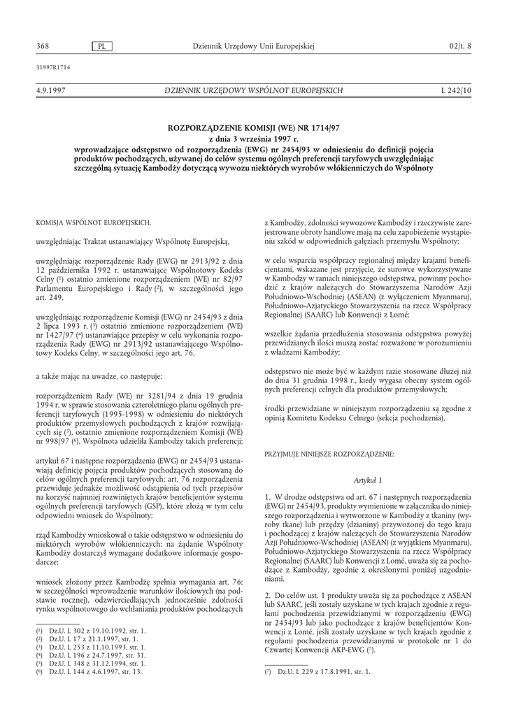 (WE) NR 1714/97 z dnia 3 września 1997 r. w