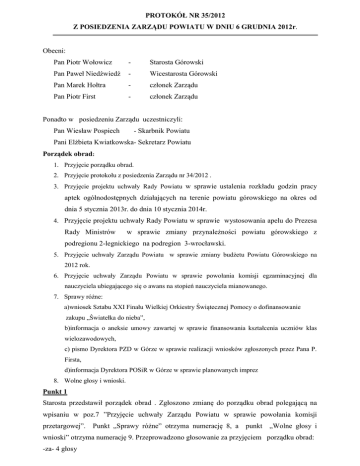 PROTOKÓŁ NR 35/2012 Z POSIEDZENIA ZARZĄDU POWIATU W DNIU 6 GRUDNIA 2012r. Obecni: Pan Piotr Wołowicz - Starosta Górowski Pan Paweł Niedźwiedź - Wicestarosta Górowski Pan Marek Hołtra - członek Zarządu Pan Piotr First - członek Zarządu Ponadto w posiedzeniu Zarządu uczestniczyli: Pan Wiesław Pospiech - Skarbnik Powiatu Pani Elżbieta Kwiatkowska- Sekretarz Powiatu Porządek obrad: 1. Przyjęcie porządku obrad. 2. Przyjęcie protokołu z posiedzenia Zarządu nr 34/2012 . 3. Przyjęcie projektu uchwały Rady Powiatu w sprawie ustalenia rozkładu godzin pracy aptek ogólnodostępnych działających na terenie powiatu górowskiego na okres od dnia 5 stycznia 2013r. do dnia 10 stycznia 2014r. 4. Przyjęcie projektu uchwały Rady Powiatu w sprawie wystosowania apelu do Prezesa Rady Ministrów w sprawie zmiany przynależności powiatu górowskiego z podregionu 2-legnickiego na podregion 3-wrocławski. 5. Przyjęcie uchwały Zarządu Powiatu w sprawie zmiany budżetu Powiatu Górowskiego na 2012 rok. 6. Przyjęcie uchwały Zarządu Powiatu w sprawie powołania komisji egzaminacyjnej dla nauczyciela ubiegającego się o awans na stopień nauczyciela mianowanego. 7. Sprawy różne: a)wniosek Sztabu XXI Finału Wielkiej Orkiestry Świątecznej Pomocy o dofinansowanie zakupu „Światełka do nieba”, b)informacja o aneksie umowy zawartej w sprawie finansowania kształcenia uczniów klas wielozawodowych, c) pismo Dyrektora PZD w Górze w sprawie realizacji wniosków zgłoszonych przez Pana P. Firsta, d)informacja Dyrektora POSiR w Górze w sprawie planowanych imprez 8. Wolne głosy i wnioski. Punkt 1 Starosta przedstawił porządek obrad . Zgłoszono zmianę do porządku obrad polegającą na wpisaniu w poz.7 ”Przyjęcie uchwały Zarządu Powiatu w sprawie powołania komisji przetargowej”. Punkt „Sprawy różne” otrzyma numerację 8, a punkt „Wolne głosy i wnioski” otrzyma numerację 9. Przeprowadzono głosowanie za przyjęciem porządku obrad: -za- 4 głosy -przeciw-0 głosów -wstrzymał się – 0 głosów Porządek obrad został przyjęty. Punkt 2 Starosta zwrócił się z pytaniem :czy są uwagi do protokołu Zarządu nr 34/2012 który członkowie Zarządu Powiatu otrzymali wcześniej do zapoznania. Uwag nie zgłoszono. Przeprowadzono głosowanie za przyjęciem protokołu: -za -4 głosy -przeciw- 0 głosów -wstrzymał się – 0 głosów Protokół został przyjęty. Punkt 3 Przedstawiony został projekt uchwały Rady Powiatu Górowskiego w sprawie ustalenia rozkładu godzin pracy aptek ogólnodostępnych działających na terenie powiatu górowskiego na okres od dnia 5 stycznia 2013r. do dnia 10 stycznia 2014r. W projekcie uchwały uwzględniony jest nowootwarty Punkt Apteczny „SILOE” w Czerninie. Ustalony rozkład godzin pracy aptek dostosowano w miarę możliwości do bieżących potrzeb miejscowej ludności, biorąc pod uwagę liczbę mieszkańców, ilość placówek aptecznych i ich usytuowanie w terenie. Kryterium , które miało znaczący wpływ na określenie rozkładu godzin pracy aptek na terenie powiatu górowskiego był wskazany przez poszczególne apteki czas ich pracy. Można przyjąć, ze wyznaczone godziny pracy aptek odpowiadają w znacznej mierze rzeczywistemu zapotrzebowaniu na tego typu usługi na określonym terenie. W celu znalezienia optymalnego rozwiązania dotyczącego zapewnienia dostępności w porze nocnej, niedziele święta i inne dni wolne od pracy, w dniu 23 listopada 2012r. odbyło się spotkanie w którym uczestniczyła część członków Zarządu Powiatu Górowskiego , właściciele aptek oraz Prezes Dolnośląskiej Izby Aptekarskiej. Podczas spotkania właściciele aptek poinformowali o dokonywanych zakupach w porze nocnej. Zakupy te są bardzo sporadyczne, z reguły kupowane były tabletki przeciwbólowe, pampersy, prezerwatywy, mleko dla dzieci. Nie było realizowanych recept tzw. „cito” ratujących życie. W nagłym przypadku zachorowania pomoc chorym udzielana jest na izbie przyjęć PCOZ w Górze Spółka z o.o. i tam chory otrzymuje potrzebną dawkę leków. Właściciele aptek poinformowali o aspektach ekonomicznych związanych z dyżurowaniem w porze nocnej. W tym wypadku należy wypracować swoisty kompromis pomiędzy interesem pacjenta realizowanym w tym przez powiat , ,którego ustawowym zadaniem jest promocja i ochrona zdrowia, a z drugiej strony interes przedsiębiorców prowadzących apteki na obszarze powiatu, utożsamiany z osiągnięciem pozytywnego wyniku ekonomicznego prowadzonej działalności gospodarczej oraz unikaniem nadmiernych kosztów. Podczas spotkania wypracowano wspólne stanowisko, które zostało uwzględnione w przedmiotowym projekcie uchwały. Na terenie Góry dyżur nocny będzie trwać w godzinach od 22do 23, czyli maksymalnie w tych godzinach, w których mieszkańcy korzystają z usług aptek. Na terenie Wąsosza odstępuje się od pełnienia dyżurów nocnych z uwagi na brak placówki szpitalnej. Chory , w celu udzielenia porady musi udać się do tego typu placówki do Góry, bądź Rawicza, położonego niedaleko od Wąsosza . Apteka Lawendowa w Górze świadczy usługi codziennie w godzinach od 8 do 22 i jest to bardzo dogodny dostęp dla pacjentów. Ponadto Apteka VITA w Górze w roku 2013 będzie czynna od poniedziałku do soboty od godziny 7. Wyjątek stanowić będzie niedziela, bowiem w tym dniu Apteka „Lawendowa” jest czynna od godziny 8. Do projektu uchwały nie wniesiono uwag. Przeprowadzono głosowanie za przyjęciem projektu uchwały : -za- 4 głosy -przeciw-0 głosów -wstrzymał się – 0 głosów Projekt uchwały został przyjęty. Projekt uchwały należy skierować do Komisji Zdrowia i Opieki Społecznej, do Wójtów i Burmistrzów z terenu powiatu górowskiego ,oraz do Dolnośląskiej Izby Aptekarskiej celem zaopiniowania. Punkt 4 Wniosek w sprawie wystosowania apelu do Prezesa Rady Ministrów w sprawie zmiany przynależności powiatu górowskiego z podregion