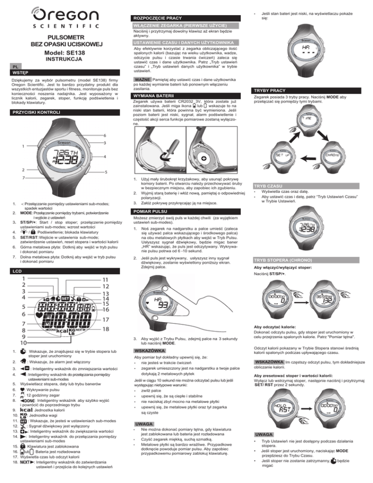 ROZPOCZĘCIE PRACY Jeśli stan bateri jest niski, na wyświetlaczu pokaże się: • WŁĄCZENIE ZEGARKA (PIERWSZE UŻYCIE) Naciśnij i przytrzymaj dowolny klawisz aż ekran będzie aktywny. PULSOMETR BEZ OPASKI UCISKOWEJ Model: SE138 USTAWIENIE CZASU I DANYCH UŻYTKOWNIKA INSTRUKCJA PLPL WSTĘP TM Strapless Dziękujemy za wybór pulsometru (model SE138) firmy Oregon Scientific. Jest to bardzo przydatny produkt dla wszystkich entuzjastów sportu i fitness, monitoruje puls bez konieczności noszenia nadajnika. Jest wyposażony w licznik kalorii, zegarek, stoper, funkcję podświetlenia i blokady klawiatury. PRZYCISKI KONTROLI Aby efektywnie korzystać z zegarka obliczającego ilość spalonych kalorii (bazując na wieku użytkownika, wadze, odczycie pulsu i czasie trwania ćwiczeń) zaleca się ustawić czas i dane użytkownika. Patrz „Tryb ustawień czasu” i „Tryb ustawień danych użytkownika” w trybie ustawień. WAŻNE Pamiętaj aby ustawić czas i dane użytkownika po każdej wymianie baterii lub ponownym włączeniu zasilania. WYMIANA BATERII Zegarek używa baterii CR2032 3V, która została już zainstalowana. Jeśli miga ikona lub wskazuje to na niski stan baterii, która powinna być wymieniona. Jeśli poziom baterii jest niski, sygnał, alarm podświetlenie i częstość akcji serca funkcje pomiarowe zostaną wyłączone. TRYBY PRACY Zegarek posiada 3 tryby pracy. Naciśnij MODE aby przełączać się pomiędzy tymi trybami. 6 3 1 4 2 5 7 1. 2. 1. 2. 3. 4. 5. 6. 7. -: Przełączanie pomiędzy ustawieniami sub-modes; spadek wartości MODE: Przełączenie pomiędzy trybami, potwierdzenie i wyjście z ustawień ST/SP/+: Start / stop stoper; przełączenie pomiędzy ustawieniami sub-modes; wzrost wartości / : Podświetlenie; blokada klawiatury SET/RST: Wejście w ustawienia sub-mode; zatwierdzenie ustawień, reset stopera i wartości kalorii Górna metalowa płyta: Dotknij aby wejść w tryb pulsu i dokonać pomiaru Dolna metalowa płyta: Dotknij aby wejść w tryb pulsu i dokonać pomiaru 3. 1. Noś zegarek na nadgarstku a palce umieść (zaleca się używać palca wskazującego i środkowego palca) na obu metalowych płytkach aby wejść w Tryb Pulsu. Usłyszysz sygnał dźwiękowy, będzie migac baner „HR” wskazując, że puls jest odczytywany. Wykrywanie pulsu potrwa od 6 -10 sekund. 2. Jeśli puls jest wykrywany, usłyszysz inny sygnał dźwiękowy, zostanie wyświetlony poniższy ekran. Zdejmij palce. 2. 3. 4. 5. 6. 7. 8. 9. 10. 11. 12. 13. 14. 15. 16. 17. 18. TRYB STOPERA (CHRONO) Aby włączyć/wyłączyć stoper: Naciśnij ST/SP/+. 17 7 8 9 10 1. Wyświetla czas oraz datę. Aby ustawić czas i datę, patrz “Tryb Ustawień Czasu” w Trybie Ustawień. • • Możesz zmierzyć swój puls w każdej chwili (za wyjątkiem ustawień sub-modes). 11 12 13 14 15 16 5 6 TRYB CZASU POMIAR PULSU LCD 1 2 3 4 Użyj mały śrubokręt krzyżakowy, aby usunąć pokrywę komory baterii. Po otwarciu należy przechowywać śruby w bezpiecznym miejscu, aby zapobiec ich zgubieniu. Wyjmij starą baterię i włóż nową, pamiętaj o odpowiedniej polaryzacji. Załóż pokrywę przykręcając ją na miejsce. 18 3. : Wskazuje, że znajdujesz się w trybie stopera lub stoper jest uruchomiony : Wskazuje, że alarm jest włączony : Inteligentny wskaźnik do zmniejszania wartości : Inteligentny wskaźnik do przełączania pomiędzy ustawieniami sub-modes Wyświetlacz stopera, daty lub trybu banerów : Wykrywanie pulsu : 12 godzinny zegar : Inteligentny wskaźnik aby szybko wyjść i powrócić do poprzedniego trybu : Jednostka kalorii : Jednostka wagi : Wskazuje, że jesteś w ustawieniach sub-modes : Sygnał dźwiękowy jest wyłączony : Inteligentny wskaźnik do zwiększania wartości : Inteligentny wskaźnik do przełączania pomiędzy ustawieniami sub-modes : Klawiatura jest zablokowana lub : Bateria jest rozładowana Wyświetla czas lub odczyt kalorii : Inteligentny wskaźnik do zatwierdzania ustawień i przejścia do kolejnych ustawień Aby wyjść z Trybu Pulsu, zdejmij palce na 3 sekundy lub naciśnij MODE. WSKAZÓWKA Aby pomiar był dokładny upewnij się, że: • nie jesteś w trakcie ćwiczeń • zegarek umieszczony jest na nadgarstku a twoje palce dotykają 2 metalowych płytek Jeśli w ciągu 10 sekund nie można odczytać pulsu lub jeśli występując nietypowe warunki: • zwilż palce • upewnij się, że są ciepłe i stabilne • nie naciskaj zbyt mocno na metalowe płytki • upewnij się, że metalowe płytki oraz tył zegarka są czyste Aby odczytać kalorie: Dokonać odczytu pulsu, gdy stoper jest uruchomiony w celu przejrzenia spalonych kalorie. Patrz "Pomiar tętna". Odczyt kalorii pokazany w Trybie Stopera stanowi średnią kalorii spalonych podczas upływającego czasu. WSKAZÓWKA Im częstszy odczyt pulsu, tym dokładniejsze obliczanie kalorii. Aby zresetować stoper i wartości kalorii: Wyłącz lub wstrzymaj stoper, następnie naciśnij i przytrzymaj SET/ RST przez 2 sekundy. UWAGA • • • Nie można dokonać pomiary tętna, gdy klawiatura jest zablokowana lub bateria jest rozładowana Czyść zegarek miękką, suchą szmatką. Metalowe płytki są bardzo wrażliwe. Przypadkowe dotknęcie powoduje pomiar pulsu. Aby zapobiec przypadkowemu pomiarowy zablokuj klawiaturę. UWAGA • • • Tryb Ustawień nie jest dostępny podczas działania stopera. Jeśli stoper jest uruchomiony, naciskając MODE przejdziesz do Trybu Czasu. będzie Jeśli stoper nie zostanie zatrzymanny, migać TRYB USTAWIEŃ Dostępne są 4 tryby ustawień sub-mode w Trybie Ustawień. PL • Naciśnij - lub ST/SP/+ aby przełączać się pomiędzy trybami. • Naciśnij MODE w dowolnym momencie aby powrócić do Trybu Czasu. UWAGA ikona będzie wyświetlana w ustawieniach sub-mode. TRYB USTAWIEŃ CZASU Aby ustawic czas i datę: 1. W Trybie Ustawień Czasu, naciśnij SET/RST aby wejść w ustawienia. 2. Naciśnij - lub ST/SP/+ aby ustawić wartości. Naciśnij i przytrzymaj - lub ST/S