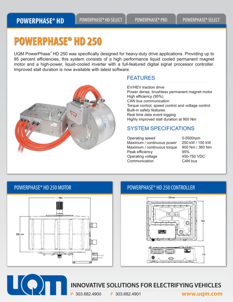 POWERPHASE® HD POWERPHASE® HD SELECT POWERPHASE® PRO POWERPHASE® SELECT POWERPHASE® HD 250 UQM PowerPhase HD 250 was specifically designed for heavy-duty drive applications. Providing up to 95 percent efficiencies, this system consists of a high performance liquid cooled permanent magnet motor and a high-power, liquid-cooled inverter with a full-featured digital signal processor controller. Improved stall duration is now available with latest software. ® FEATURES EV/HEV traction drive Power dense, brushless permanent magnet motor High efficiency (95%) CAN bus communication Torque control, speed control and voltage control Built-in safety features Real time data event logging Highly improved stall duration at 900 Nm SYSTEM SPECIFICATIONS Operating speed Maximum / continuous power Maximum / continuous torque Peak efficiency Operating voltage Communication POWERPHASE® HD 250 MOTOR 0-5500rpm 250 kW / 150 kW 900 Nm / 360 Nm 95% 450-750 VDC CAN bus POWERPHASE® HD 250 CONTROLLER INNOVATIVE SOLUTIONS FOR ELECTRIFYING VEHICLES P 303.682.4900 F 303.682.4901 www.uqm.com POWERPHASE® HD 250 POWERPHASE® HD 220 POWERPHASE® HD 950T MOTOR PERFORMANCE CONTROLLER PERFORMANCE SPECIFICATIONS OPERATING VOLTAGE Peak Power Continuous power Peak torque Continuous torque Maximum efficiency Power density 335 hp 201 hp 664 lbf ft 265 lbf ft 95% 1.8 hp/lb Operating voltage input range Minimum voltage Nominal input voltage Maximum voltage DC current limitation, motoring 250 kW 150 kW 900 Nm 360 Nm 3.0 kW/kg DIGITAL SIGNAL PROCESSOR DIMENSIONS Length Diameter Weight 8.9 in 15.4 in 187 lb Nominal input voltage Input supply voltage range Input supply current range 226 mm 390 mm 85 kg Minimum coolant flow Maximum inlet temperature 90 75 50 55 60 Motor Mode^ INVERTER TYPE Test Date: 08/07/2013 700 92 90 85 80 87.5 65 50 70 93 94 55 94 75 .5 87 92 60 0 70 50 55 65 50 70 100 150 75 85 80 70 200 93 92 87.5 80 250 Length Width Height Weight 94 90 85 DIMENSIONS Continuous 93 65 200 100 PWM & phase advance IGBT 3 to 12 kHz 14 W 95 300 0 Control type Power device Switching frequency Standby power 92 60 Torque (Nm) 600 400 10 l/min 50/50 water/glycol 140° F 60° C PowerPhase HD 250 87.5 85 70 80 65 900 800 12 VDC or 24 VDC 9 to 35 VDC 1 to 5 A LIQUID COOLING SYSTEM PERFORMANCE CURVE 500 450-750 VDC 450 VDC 600 VDC 750 VDC 500 A 65 300 90 87.5 75 350 80 70 400 450 Speed (rpm/10) 500 85 75 550 04/07/2015 Rev 5 20.9 in 16.6 in 6.9 in 88.0 lb 531 mm 422 mm 175 mm 40kg To view additional efficiency maps, please contact us. *All product photos are for illustrative purposes only. Photos displayed may contain items that are not included in the default configuration for that system. **All specifications are subject to change. ^Performance data based on testing at 600 VDC. Variation will exist. UQM Technologies is a developer and manufacturer of power-dense, high-efficiency electric motors, generators and power electronic controllers for the automotive, commercial truck, bus and military markets. A major emphasis for UQM is developing products for the alternative-energy technologies sector, including propulsion systems for electric, hybrid electric, plug-in hybrid electric and fuel cell electric vehicles. CONTACT US 4120 Specialty Place Longmont, CO 80504 P F 303.682.4900 303.682.4901 www.uqm.com Revised 04-07-2015