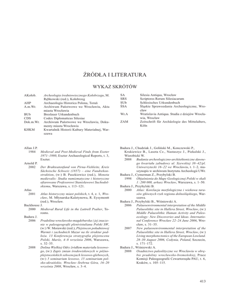 RÓD£A I LITERATURA WYKAZ SKRÓTÓW AKo³ob. AHP A.m.Wr. BUb CDS Dok.m.Wr. KHKM Archeologia redniowiecznego Ko³obrzegu, M. Rêbkowski (red.), Ko³obrzeg Archaeologia Historica Polona, Toruñ Archiwum Pañstwowe we Wroc³awiu, Akta miasta Wroc³awia Breslauer Urkundenbuch Codex Diplomaticus Silesiae Archiwum Pañstwowe we Wroc³awiu, Dokumenty miasta Wroc³awia Kwartalnik Historii Kultury Materialnej, Warszawa Allan J.P. 1984 Medieval and Post-Medieval Finds from Exeter 19711980, Exeter Archaeological Reports, t. 3, Exeter. Arnold P. 2002 Der Brakteatenfund von Pirna-Viehleite, Kreis Sächsische Schweiz (1857) eine Fundrekonstruktion, (w:) B. Paszkiewicz (red.), Moneta medievalis: Studia numizmatyczne i historyczne ofiarowane Profesorowi Stanis³awowi Suchodolskiemu, Warszawa, s. 113121. Atlas 2001 Atlas historyczny miast polskich, t. 4, z. 1, Wroc³aw, M. M³ynarska-Kaletynowa, R. Eysymontt (red.), Wroc³aw. Backhouse J. 2000 Medieval Rural Life in the Luttrell Psalter, Toronto. Badura J. 2006 Pradolina wroc³awsko-magdeburska i jej znaczenie w paleogeografii plenivistulianu Polski SW, (w:) W. Morawski (red.), Plejstocen po³udniowej Warmii i zachodnich Mazur na tle struktur pod³o¿a. 13 Konferencja stratygrafia plejstocenu Polski, Maróz, 48 wrzenia 2006, Warszawa, s. 3235. 2008 Dolina Wielkiej Odry ród³em materia³u lessowego, (w:) Zapis zmian rodowiskowych w pónoplejstoceñskich sekwencjach lessowo-glebowych, (w:) 5 seminarium lessowe, 15 seminarium polsko-ukraiñskie, Wroc³awSrebrna Góra, 1620 wrzenia 2008, Wroc³aw, s. 34. SA SRS SUb SA Wr.A ZAM Silesia Antiqua, Wroc³aw Scriptores Rerum Silesiacarum Schlesisches Urkundenbuch l¹skie Sprawozdania Archeologiczne, Wroc³aw Wratislavia Antiqua. Studia z dziejów Wroc³awia, Wroc³aw Zeitschrift für Archäologie des Mittelalters, Köln Badura J., Chudziak J., Goliñski M., Konczewski P., Krukiewicz B., Lasota Cz., Nastaszyc J., Piekalski J., Wierzbicki W. 2008 Badania archeologiczno-architektoniczne dawnego kwarta³u zabudowy ul. Szewskiej 3842/pl. Uniwersytecki 1622 we Wroc³awiu, t. 12, maszynopis w archiwum Instytutu Archeologii UWr. Badura J., Cymerman Z., Przybylski B. 1998 Objanienia do Mapy Geologicznej Polski w skali 1 : 200 000, arkusz Wroc³aw, Warszawa, s. 150. Badura J., Przybylski B. 2000 Atlas: Korelacja morfologiczna i wiekowa tarasów g³ównych rzek regionu dolnol¹skiego, Warszawa. Badura J., Przybylski B., Winiewski A. 2006 Palaeoenvironmental interpretation of the Middle Palaeolithic site in Hallera Street, Wroc³aw, (w:) Middle Palaeolithic Human Activity and Paleoecology: New Discoveries and Ideas. International Conference Wroc³aw 2224 June 2006, Wroc³aw, s. 3135. 2007 New palaeoenvironmental interpretation of the Palaeolithic site in Hallera Street, Wroc³aw, (w:) Living morphotectonics of the European Lowland. 2830 August 2006, Cedynia, Poland, Szczecin, s. 171172. Badura J., Winiewski A. 2008 Osadnictwo paleolityczne we Wroc³awiu w obrêbie pradoliny wroc³awsko-bremeñskiej, Prace Komisji Paleogeografii Czwartorzêdu PAU, t. 6, Kraków, s. 105115. 413 RÓD£A I LITERATURA Balasubramaniam R., Ramesh Kumar A.V. 2000 Characterization of Delhi iron pillar rust by X-ray diffraction, Fourier transform infrared spectroscopy and Mössbauer spectroscopy, Corrosion Science, t. 42, s. 20852101. 2003 Corrosion resistance of the Dhar iron pillar, Corrosion Science, t. 45, s. 24512465. Baran D. 2005 Naczynia drewniane z latryny nr 3 przy ul. Dominikañskiej 6 w Poznaniu, (w:) Z. Kurnatowska, T. Jurek (red.), Civitas Posnaniensis. Studia z dziejów redniowiecznego Poznania, Poznañ, s. 433438. Baran E. 1998 Katalog monet polskich w zbiorach Zak³adu Narodowego imienia Ossoliñskich, t. 1: redniowieczne monety polskie, l¹skie i pomorskie, Wroc³aw. Barciak A. 1982 Ideologia polityczna monarchii Przemys³a Otokara II: Studium z dziejów czeskiej polityki zagranicznej w drugiej po³owie XIII wieku, Katowice. Barnycz-Gupieniec R. 1959 Naczynia drewniane z Gdañska z XXIII w., Acta Archaeologica Universitatis Lodziensis, nr 8, £ód. 1961 Tokarstwo i bednarstwo z XIIIXIV w. w osadzie miejskiej w Gdañsku, Materia³y Zachodniopomorskie, t. 7, s. 391434. Bartlett R. 2003 Tworzenie Europy. Podbój, kolonizacja i przemiany kulturowe 9501350, Poznañ. Benevolo L. 2000 Die Geschichte der Stadt, FrankfurtNew York (= Storia della cittá, RomaBari 1975). Berdu³a L. 1994 Wyniki badañ archeologiczno-architektonicznych we Wroc³awiu przy ul. widnickiej 21/23, SA, t. 36/37, s. 7794. Berg T. van den, Groenman-van Waateringe W. 1992 Das Leder aus dem Umfeld des Lübecker Hafens, Lübecker Schriften zur Archäologie und Kulturgeschichte, t. 18, s. 345364. Berings G. 1992 Transport and communication in the Middle Ages, (w:) H. Hundsbichler (red.), Transport und Alltag in Spätmittelalter und früher Neuzeit. Internationaler Kongress Krems an der Donau 9. bis 12. Oktober 1990, Wien, s. 4774. Beyer K. 1876 Wykopalisko wieleñskie (Filehne), Warszawa. Bieñkiewicz K.J. 1977 Fizykochemia wyprawy skór, Warszawa. Blaschitz G., Krabath S. 2004 Schmuck im mittelalterlichen Alltag unter besonderer Berücksichtigung des Schatzfundes von Fuchsenhof, (w:) B. Prokisch, T. Kühtreiber (red.), Der Schatzfund von Fuchsenhof, Linz, s. 231305. Boguszewicz A., Dwojak A., Zió³kowski W. 1990 Zamek Rogowiec badania 1998 r., SA, t. 31, s. 337372. Boockmann H. 1987 Die Stadt im späten Mittelalter, München. Borkowski T. 1995 Gry i zabawy w redniowiecznym miecie na l¹sku. lady materialne, (w:) K. Wachowski (red.), Kultura redniowiecznego l¹ska i Czech. Miasto, s. 99105. 414 1999 Rozrywka zabawki i drobna plastyka figuralna, (w:) C. Buko, J. Piekalski (red.), Ze studiów nad ¿yciem codziennym w redniowiecznym miecie. Parcele przy ulicy Wiêziennej 1011 we Wroc³awiu (= Wr.A, t. 1), s. 187201. 2004 Gliniane skarbonki, przybory do gier, figurki ceramiczne oraz szczud³o i flet z badañ we Wroc³awiu, (w:) J. Piekalski, K. Wachowski (red.), Wroc³aw na p