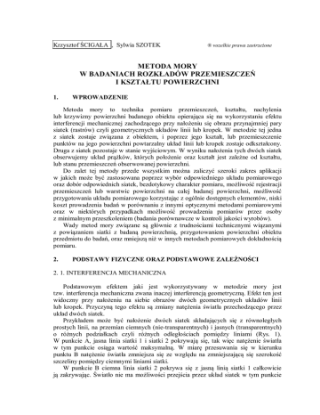 Krzysztof ŚCIGAŁA , Sylwia SZOTEK ® wszelkie prawa zastrzeżone METODA MORY W BADANIACH ROZKŁADÓW PRZEMIESZCZEŃ I KSZTAŁTU POWIERZCHNI 1. WPROWADZENIE Metoda mory to technika pomiaru przemieszczeń, kształtu, nachylenia lub krzywizny powierzchni badanego obiektu opierająca się na wykorzystaniu efektu interferencji mechanicznej zachodzącego przy nałożeniu się obrazu przynajmniej pary siatek (rastrów) czyli geometrycznych układów linii lub kropek. W metodzie tej jedna z siatek zostaje związana z obiektem, i poprzez jego kształt, lub przemieszczenie punktów na jego powierzchni powtarzalny układ linii lub kropek zostaje odkształcony. Druga z siatek pozostaje w stanie wyjściowym. W wyniku nałożenia tych dwóch siatek obserwujemy układ prążków, których położenie oraz kształt jest zależne od kształtu, lub stanu przemieszczeń obserwowanej powierzchni. Do zalet tej metody przede wszystkim można zaliczyć szeroki zakres aplikacji w jakich może być zastosowana poprzez wybór odpowiedniego układu pomiarowego oraz dobór odpowiednich siatek, bezdotykowy charakter pomiaru, możliwość rejestracji przemieszczeń lub warstwic powierzchni na całej badanej powierzchni, możliwość przygotowania układu pomiarowego korzystając z ogólnie dostępnych elementów, niski koszt prowadzenia badań w porównaniu z innymi optycznymi metodami pomiarowymi oraz w niektórych przypadkach możliwość prowadzenia pomiarów przez osoby z minimalnym przeszkoleniem (badania porównawcze w kontroli jakości wyrobów). Wady metod mory związane są głównie z trudnościami technicznymi wiązanymi z powiązaniem siatki z badaną powierzchnią, przygotowaniem powierzchni obiektu przedmiotu do badań, oraz mniejszą niż w innych metodach pomiarowych dokładnością pomiaru. 2. PODSTAWY FIZYCZNE ORAZ PODSTAWOWE ZALEŻNOŚCI 2. 1. INTERFERENCJA MECHANICZNA Podstawowym efektem jaki jest wykorzystywany w metodzie mory jest tzw. interferencja mechaniczna zwana inaczej interferencją geometryczną. Efekt ten jest widoczny przy nałożeniu na siebie obrazów dwóch geometrycznych układów linii lub kropek. Przyczyną tego efektu są zmiany natężenia światła przechodzącego przez układ dwóch siatek. Przykładem może być nałożenie dwóch siatek składających się z równoległych prostych linii, na przemian ciemnych (nie-transparentnych) i jasnych (transparentnych) o różnych podziałkach czyli różnych odległościach pomiędzy liniami (Rys. 1). W punkcie A, jasna linia siatki 1 i siatki 2 pokrywają się, tak więc natężenie światła w tym punkcie osiąga wartość maksymalną. W miarę przesuwania się w kierunku punktu B natężenie światła zmniejsza się ze względu na zmniejszającą się szerokość szczeliny pomiędzy ciemnymi liniami siatki. W punkcie B ciemna linia siatki 2 pokrywa się z jasną linią siatki 1 całkowicie ją zakrywając. Światło nie ma możliwości przejścia przez układ siatek w tym punkcie i jego natężenie spada do zera. W punkcie B będziemy więc obserwować ciemny prążek, natomiast w punkcie A prążek jasny. B A B c1 SIATKA 1 SIATKA 2 c2 1+2 Rys. 1. Efekt interferencji mechanicznej Jak zatem widać z powyższego interferencja mechaniczna nie jest zjawiskiem nakładania się dwóch fal i nie należy jej utożsamiać z interferencją optyczną. 1.2. PODSTAWOWE OBRAZY PRĄŻKOWE ORAZ ZALEŻNOŚCI JE OPISUJĄCE Wśród obrazów prążkowych jakie powstają przy nałożeniu dwóch siatek, można wyróżnić pewne podstawowe układy prążków jakie powstają przy podstawowych rozkładach przemieszczeń bądź dla podstawowych kształtów badanych przemieszczeń. W badaniach przemieszczeń podstawowe obrazy prążkowe powstają przy czystym przemieszczeniu liniowym oraz przy czystym przemieszczeniu kątowym. Przez przypadek czystego przemieszczenia liniowego należy tu rozumieć nałożenie dwóch siatek o tej samej podziałce c w (czyli tej samej odległości pomiędzy liniami ciemnymi), z których jedna (związana z powierzchnią badanego obiektu) poddana została liniowemu odkształceniu x. W wyniku odkształcenia podziałka siatki obiektowej zwiększy się do wartości c o. Efekt nałożenia dwóch siatek będzie więc w tym przypadku identyczny jak efekt nałożenia dwóch siatek o różnych podziałkach c1 i c2 prezentowany na rys. 2. Efektem nałożenia siatek będzie układ prostoliniowych, równoodległych prążków, prostopadłych do kierunku odkształcenia powierzchni obiektu (Rys. 2). S iat ka 1 S iat ka 2 1+2 Rys. 2. Obraz prążków mory dla czystego przemieszczenia liniowego Wartości przemieszczeń punktów na powierzchni obiektu mogą być w tym przypadku wyznaczone na podstawie zależności: (1) u x mcw gdzie: ux – przemieszczenie w kierunku prostopadłym do kierunku prążków mory, m – numer prążka, cw – podziałka siatki nieodkształconej. Numer prążka można określić w ten sposób, że prążek o numerze 1 to prążek, którego odległość do punktu w którym przemieszczenie ux = 0 jest najmniejsza, odsuwając się od tego punktu kolejne prążki będą miały kolejne numery. Odległość pomiędzy kolejnymi prążkami można zmierzyć na obrazie prążkowym lub określić na podstawie wzoru: (2) ncw gdzie: - odległość pomiędzy kolejnymi prążkami mory, n – liczba działek siatki wzorcowej pomiędzy osiami kolejnych prążków, cw – podziałka siatki nieodkształconej. W przypadku czystego przemieszczenia kątowego jednej z siatek względem drugiej, czyli obrotu jednej z siatek wokół ustalonego punktu bez przemieszczenia liniowego. Dla takiego przypadku przemieszczenia dwóch siatek, obraz prążkowy, będzie składał się z równoległych, równoodległych prążków, ułożonych względem linii siatki wzorcowej pod pewnym kątem (Rys. 3). Składowe przemieszczeń prostopadłe do kierunku linii siatki wzorcowej możemy wyznaczyć na podstawie zależności (1). Kąt obrotu siatek względem