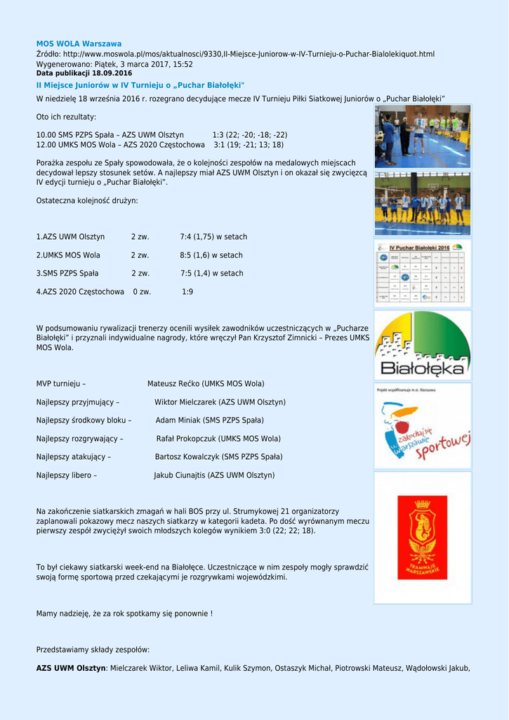 MOS WOLA Warszawa Źródło: http://www.moswola.pl/mos/aktualnosci/9330,II-Miejsce-Juniorow-w-IV-Turnieju-o-Puchar-Bialolekiquot.html Wygenerowano: Piątek, 3 marca 2017, 15:52 Data publikacji 18.09.2016 II Miejsce Juniorów w IV Turnieju o „Puchar Białołęki" W niedzielę 18 września 2016 r. rozegrano decydujące mecze IV Turnieju Piłki Siatkowej Juniorów o „Puchar Białołęki” Oto ich rezultaty: 10.00 SMS PZPS Spała – AZS UWM Olsztyn 1:3 (22; -20; -18; -22) 12.00 UMKS MOS Wola – AZS 2020 Częstochowa 3:1 (19; -21; 13; 18) Porażka zespołu ze Spały spowodowała, że o kolejności zespołów na medalowych miejscach decydował lepszy stosunek setów. A najlepszy miał AZS UWM Olsztyn i on okazał się zwycięzcą IV edycji turnieju o „Puchar Białołęki”. Ostateczna kolejność drużyn: 1.AZS UWM Olsztyn 2 zw. 7:4 (1,75) w setach 2.UMKS MOS Wola 2 zw. 8:5 (1,6) w setach 3.SMS PZPS Spała 2 zw. 7:5 (1,4) w setach 4.AZS 2020 Częstochowa 0 zw. 1:9 W podsumowaniu rywalizacji trenerzy ocenili wysiłek zawodników uczestniczących w „Pucharze Białołęki” i przyznali indywidualne nagrody, które wręczył Pan Krzysztof Zimnicki – Prezes UMKS MOS Wola. MVP turnieju – Mateusz Rećko (UMKS MOS Wola) Najlepszy przyjmujący – Wiktor Mielczarek (AZS UWM Olsztyn) Najlepszy środkowy bloku – Adam Miniak (SMS PZPS Spała) Najlepszy rozgrywający – Rafał Prokopczuk (UMKS MOS Wola) Najlepszy atakujący – Bartosz Kowalczyk (SMS PZPS Spała) Najlepszy libero – Jakub Ciunajtis (AZS UWM Olsztyn) Na zakończenie siatkarskich zmagań w hali BOS przy ul. Strumykowej 21 organizatorzy zaplanowali pokazowy mecz naszych siatkarzy w kategorii kadeta. Po dość wyrównanym meczu pierwszy zespół zwyciężył swoich młodszych kolegów wynikiem 3:0 (22; 22; 18). To był ciekawy siatkarski week-end na Białołęce. Uczestniczące w nim zespoły mogły sprawdzić swoją formę sportową przed czekającymi je rozgrywkami wojewódzkimi. Mamy nadzieję, że za rok spotkamy się ponownie ! Przedstawiamy składy zespołów: AZS UWM Olsztyn: Mielczarek Wiktor, Leliwa Kamil, Kulik Szymon, Ostaszyk Michał, Piotrowski Mateusz, Wądołowski Jakub, Fabisiak Norbert, Kubacki Oliwier, Świdroń Adam, Jaczewski Mateusz, Wodzyński Filip, Lasecki Hubert, Ciunajtis Jakub, Siemaszko Łukasz. Trenerzy: Salski Sergiusz, Wiśniewski Rafał. Kierownik: Lewandowski Robert AZS 2020 Częstochowa: Niemiec Mateusz, Rakus Oskar, Witek Szymon, Mańko Hubert, Makówka Jakub, Drążek Patryk, Tatar Paweł, Rykała Krzysztof, Pałuszka Łukasz, Woźniak Kacper, Nowak Kamil, Ligocki Patryk. Trener: Pudo Wojciech. Statystyk: Pasierb Adrian. SMS PZPS Spała: Wachowicz Wojciech, Kowalczyk Bartosz, Rajchelt Łukasz, Kruk Miłosz, Foltynowicz Patryk, Firszt Bartosz, Brdak Jakub, Baran Damian, Miniak Adam, Kapica Remigiusz, Stolc Tomasz. Trenerzy: Skrobot Marek, Pszczoła Piotr. Fizjoterapeuta: Tataradziński Piotr. UMKS MOS Wola: Kacperkiewicz Adrian, Grzymała Daniel, Belkiewicz Patryk, Żabicki Kacper, Warzywoda Max, Prokopczuk Rafał, Bączek Konrad, Strulak Sebastian, Siewierski Wiktor, Duluk Grzegorz, Jaskuła Marcin, Godlewski Michał, Rećko Mateusz, Borowski Paweł. Trener: Cop Konrad. Statystyk: Goździkiewicz Kacper UMKS MOS Wola kadeci: Kreft Bartosz, Czaplicki Marcin, Trzciński Michał, Kulesza Kacper, Boguszewski Krystian, Pawlak Piotr, Maliszewski Franek, Duszak Michał, Drobek Mikołaj, Skibiński Michał, Ślezankiweicz Aleks, Bieliński Lech, Molga Grzegorz, Kaciczak Ernest, Kawałek Patryk, Kulik Maksymilian, Ochnik Kuba, Narewki Jakub, Pielasa Maciej. Trenerzy: Trzciński Kamil i Goździkiewicz Kacper. Fotogaleria: https://www.facebook.com/moswola/photos/?tab=album&album_id=1158276554231238 Komentarz (0) dodaj komentarz Brak komentarzy dodaj komentarz