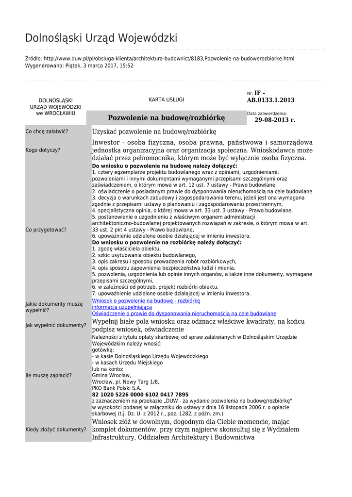 Dolnośląski Urząd Wojewódzki Źródło: http://www.duw.pl/pl/obsluga-klienta/architektura-budownict/8183,Pozwolenie-na-budowerozbiorke.html Wygenerowano: Piątek, 3 marca 2017, 15:52 Nr: IF DOLNOŚLĄSKI URZĄD WOJEWÓDZKI we WROCŁAWIU KARTA USŁUGI Pozwolenie na budowę/rozbiórkę – AB.0133.1.2013 Data zatwierdzenia: 29-08-2013 r. Co chcę załatwić? Uzyskać pozwolenie na budowę/rozbiórkę Kogo dotyczy? Inwestor - osoba fizyczna, osoba prawna, państwowa i samorządowa jednostka organizacyjna oraz organizacja społeczna. Wnioskodawca może działać przez pełnomocnika, którym może być wyłącznie osoba fizyczna. Co przygotować? Jakie dokumenty muszę wypełnić? Do wniosku o pozwolenie na budowę należy dołączyć: 1. cztery egzemplarze projektu budowlanego wraz z opiniami, uzgodnieniami, pozwoleniami i innymi dokumentami wymaganymi przepisami szczególnymi oraz zaświadczeniem, o którym mowa w art. 12 ust. 7 ustawy - Prawo budowlane, 2. oświadczenie o posiadanym prawie do dysponowania nieruchomością na cele budowlane 3. decyzja o warunkach zabudowy i zagospodarowania terenu, jeżeli jest ona wymagana zgodnie z przepisami ustawy o planowaniu i zagospodarowaniu przestrzennym, 4. specjalistyczna opinia, o której mowa w art. 33 ust. 3 ustawy - Prawo budowlane, 5. postanowienie o uzgodnieniu z właściwym organem administracji architektoniczno-budowlanej projektowanych rozwiązań w zakresie, o którym mowa w art. 33 ust. 2 pkt 4 ustawy - Prawo budowlane, 6. upoważnienie udzielone osobie działającej w imieniu inwestora. Do wniosku o pozwolenie na rozbiórkę należy dołączyć: 1. zgodę właściciela obiektu, 2. szkic usytuowania obiektu budowlanego, 3. opis zakresu i sposobu prowadzenia robót rozbiórkowych, 4. opis sposobu zapewnienia bezpieczeństwa ludzi i mienia, 5. pozwolenia, uzgodnienia lub opinie innych organów, a także inne dokumenty, wymagane przepisami szczególnymi, 6. w zależności od potrzeb, projekt rozbiórki obiektu, 7. upoważnienie udzielone osobie działającej w imieniu inwestora. Wniosek o pozwolenie na budowę - rozbiórkę informacja uzupełniająca Oświadczenie o prawie do dysponowania nieruchomością na cele budowlane Jak wypełnić dokumenty? Wypełnij białe pola wniosku oraz odznacz właściwe kwadraty, na końcu podpisz wniosek, oświadczenie Ile muszę zapłacić? Należności z tytułu opłaty skarbowej od spraw załatwianych w Dolnośląskim Urzędzie Wojewódzkim należy wnosić: gotówką: - w kasie Dolnośląskiego Urzędu Wojewódzkiego - w kasach Urzędu Miejskiego lub na konto: Gmina Wrocław, Wrocław, pl. Nowy Targ 1/8, PKO Bank Polski S.A. 82 1020 5226 0000 6102 0417 7895 z zaznaczeniem na przekazie „DUW - za wydanie pozwolenia na budowę/rozbiórkę" w wysokości podanej w załączniku do ustawy z dnia 16 listopada 2006 r. o opłacie skarbowej (t.j. Dz. U. z 2012 r., poz. 1282, z późn. zm.) Kiedy złożyć dokumenty? Wniosek złóż w dowolnym, dogodnym dla Ciebie momencie, mając komplet dokumentów, przy czym najpierw skonsultuj się z Wydziałem Infrastruktury, Oddziałem Architektury i Budownictwa Dolnośląski Urząd Wojewódzki, Wydział Infrastruktury, Oddział Architektury i Budownictwa Pokój Pracownik Telefon e.mail Nr Aneta Klimczak 2111 071 340 67 72 [email protected] - Kierownik Oddziału Gdzie załatwię sprawę? Co zrobi Urząd? Jaki jest czas reakcji? Jak się odwołać? Informacje dodatkowe [email protected] [email protected] [email protected] [email protected] [email protected] [email protected] j.koł[email protected] Ewa Sławik 2114 071 340 64 93 Elżbieta Derdzińska-Tubek 2114 071 340 64 93 Wiesław Suropek 2107 071 340 67 75 Joanna Tabisz 2112 071 340 65 86 Marek Wolf 2101 071 340 66 39 Mateusz Świsulski 2101 071 340 65 98 Jadwiga Kołacz 2115 071 340 65 13 Adam Dobrowolski 2115 071 340 65 13 [email protected] Waldemar Wojciechowski 2108 071 340 66 34 Monika Nowak 2107 071 340 67 75 [email protected] [email protected] Dawid Luberda Z-ca Kierownika 2109 071 340 66 42 [email protected] Rozpatrzy wniosek Wezwie do uzupełnienia braków formalnych wniosku Zawiadomi o wszczęciu postępowania Wezwie do uzupełnienia braków materialnych dokumentacji Wyda decyzję pozytywną, negatywną lub umorzy postępowanie Pozwolenie na budowę - nie później niż 65 dni od dnia złożenia wniosku. Pozwolenie na rozbiórkę - miesiąc, sprawy skomplikowane dwa miesiące. Stronom przysługuje odwołanie od decyzji administracyjnej do Głównego Inspektora Nadzoru Budowlanego w terminie 14 dni od dnia doręczenia decyzji za pośrednictwem Wojewody Dolnośląskiego. Na każdym etapie realizacji postępowania masz prawo do wglądu w dokumentację sprawy i uzyskiwania informacji na temat realizacji postępowania. Jako dowód w postępowaniu należy dopuścić wszystko, co może przyczynić się do wyjaśnienia sprawy (np. dokumenty, zeznania świadków, opinie biegłych oraz oględziny), a nie jest sprzeczne z prawem. Po akceptacji i podpisaniu decyzja rozstrzygająca w sprawie jest rozsyłana drogą pocztową (za potwierdzeniem odbioru) wszystkim stronom postępowania. Jeżeli we wskazanym terminie nie wpłynie od stron lub strony, które potwierdziły jej otrzymanie, odwołanie lub żądanie uzupełnienia bądź zmiany, decyzja staje się ostateczna. Kończy to bieg postępowania. Zaświadczenie o ostateczności decyzji wydawane jest na pisemne żądanie. Zaświadczenie podlega opłacie skarbowej w wysokości 17 zł, określonej w cz. II pkt 21 załącznika do ustawy z dnia 16 listopada 2006 r. o opłacie skarbowej (t.j. Dz. U. z 2012 r., poz. 1282, z późn. zm.). Opłaty z tytułu opłaty skarbowej od spraw załatwianych w Dolnośląskim Urzędzie Wojewódzkim należy wnosić: gotówką: - w kasie Dolnośląskiego Urzędu Wojewódzkiego - w kasach Urzędu Miejskiego lub na konto: Gmina Wrocław, Wrocław, pl. Nowy Targ 1/8, PKO Bank Polski S.A. 82 1020 5226 0000 6102 0417 7895 Kopie dokumentów załąc