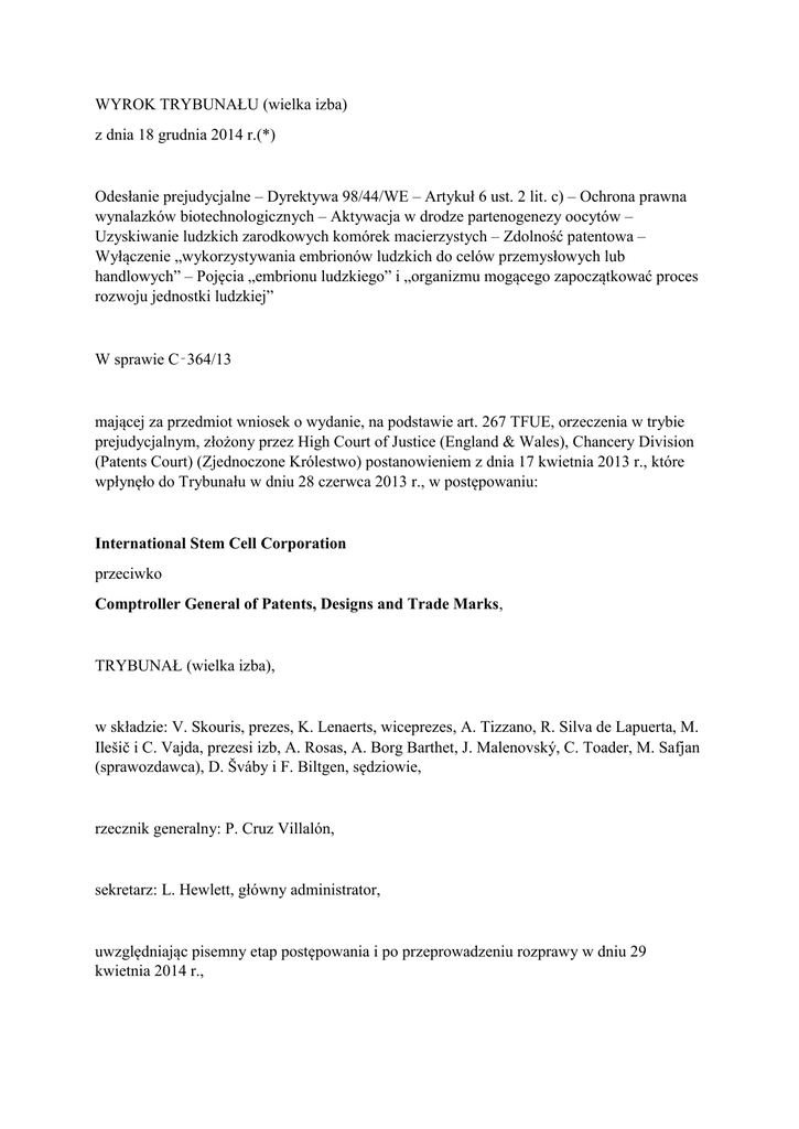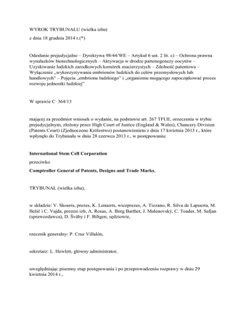 WYROK TRYBUNAŁU (wielka izba) z dnia 18 grudnia 2014 r.(*) Odesłanie prejudycjalne – Dyrektywa 98/44/WE – Artykuł 6 ust. 2 lit. c) – Ochrona prawna wynalazków biotechnologicznych – Aktywacja w drodze partenogenezy oocytów – Uzyskiwanie ludzkich zarodkowych komórek macierzystych – Zdolność patentowa – Wyłączenie „wykorzystywania embrionów ludzkich do celów przemysłowych lub handlowych” – Pojęcia „embrionu ludzkiego” i „organizmu mogącego zapoczątkować proces rozwoju jednostki ludzkiej” W sprawie C‑364/13 mającej za przedmiot wniosek o wydanie, na podstawie art. 267 TFUE, orzeczenia w trybie prejudycjalnym, złożony przez High Court of Justice (England & Wales), Chancery Division (Patents Court) (Zjednoczone Królestwo) postanowieniem z dnia 17 kwietnia 2013 r., które wpłynęło do Trybunału w dniu 28 czerwca 2013 r., w postępowaniu: International Stem Cell Corporation przeciwko Comptroller General of Patents, Designs and Trade Marks, TRYBUNAŁ (wielka izba), w składzie: V. Skouris, prezes, K. Lenaerts, wiceprezes, A. Tizzano, R. Silva de Lapuerta, M. Ilešič i C. Vajda, prezesi izb, A. Rosas, A. Borg Barthet, J. Malenovský, C. Toader, M. Safjan (sprawozdawca), D. Šváby i F. Biltgen, sędziowie, rzecznik generalny: P. Cruz Villalón, sekretarz: L. Hewlett, główny administrator, uwzględniając pisemny etap postępowania i po przeprowadzeniu rozprawy w dniu 29 kwietnia 2014 r., rozważywszy uwagi przedstawione: – w imieniu International Stem Cell Corporation przez P. Aclanda, QC, oraz A. Cooke’a, solicitor, – w imieniu rządu Zjednoczonego Królestwa przez S. Brighouse, działającą w charakterze pełnomocnika, wspieraną przez T. Mitchesona, barrister, – w imieniu rządu francuskiego przez D. Colasa oraz F.X. Bréchota, działających w charakterze pełnomocników, – w imieniu rządu polskiego przez B. Majczynę, działającego w charakterze pełnomocnika, – w imieniu rządu portugalskiego przez L. Ineza Fernandesa oraz R. Solnada Cruza, działających w charakterze pełnomocników, – w imieniu rządu szwedzkiego przez A. Falk, L. Swedenborga oraz C. Meyer‑Seitz, działających w charakterze pełnomocników, – w imieniu Komisji Europejskiej przez F.W. Bulsta, J. Samnaddę oraz T. van Rijna, działających w charakterze pełnomocników, po zapoznaniu się z opinią rzecznika generalnego na posiedzeniu w dniu 17 lipca 2014 r., wydaje następujący Wyrok 1 Wniosek o wydanie orzeczenia w trybie prejudycjalnym dotyczy wykładni art. 6 ust. 2 lit. c) dyrektywy 98/44/WE Parlamentu Europejskiego i Rady z dnia 6 lipca 1998 r. w sprawie ochrony prawnej wynalazków biotechnologicznych (Dz.U. L 213, s. 13). 2 Powyższy wniosek został przedstawiony w ramach sporu między International Stem Cell Corporation (zwaną dalej „ISCO”) a Comptroller General of Patents, Designs and Trade Marks (zwanym dalej „Comptrollerem”) w przedmiocie odmowy rejestracji patentów krajowych z uwagi na fakt, że wnioski o rejestrację odnoszące się do aktywacji oocytów w drodze partenogenezy dotyczą wykorzystania „embrionów ludzkich” w rozumieniu dyrektywy 98/44. Ramy prawne Prawo Unii 3 Motywy 1–3, 16, 37–39, 42 i 43 dyrektywy 98/44 mają następujące brzmienie: „(1) Biotechnologia i inżynieria genetyczna odgrywają coraz ważniejszą rolę w licznych gałęziach przemysłu i ochrona wynalazków biotechnologicznych z pewnością ma fundamentalne znaczenie dla rozwoju przemysłowego Wspólnoty. (2) W szczególności w dziedzinie inżynierii genetycznej badania i rozwój wymagają znacznej ilości inwestycji wysokiego ryzyka i dlatego jedynie odpowiednia ochrona prawna może uczynić je zyskownymi. (3) Skuteczna i zharmonizowana ochrona we wszystkich państwach członkowskich jest istotna do celu utrzymania i wspierania inwestycji w dziedzinie biotechnologii. […] (16) Prawo patentowe musi być stosowane z uwzględnieniem podstawowych zasad chroniących godność i integralność osoby; istotne jest potwierdzenie zasady, że ciało ludzkie, w każdym stadium jego formowania się lub rozwoju, włącznie z komórkami zarodkowymi, oraz zwykłe odkrycie jednego z jego elementów lub jednego z jego produktów, włącznie z sekwencją lub częściową sekwencją genu ludzkiego, nie mo[gą] być opatentowane; zasady te są zgodne z kryteriami zdolności patentowej właściwej dla prawa patentowego, zgodnie z którym zwykłe odkrycie nie może być opatentowane. […] (37) W niniejszej dyrektywie należy położyć nacisk na zasadę, według której musi być wyłączona możliwość udzielenia patentu na wynalazki, których wykorzystanie handlowe narusza porządek publiczny lub dobre obyczaje. (38) Stanowiąca część niniejszej dyrektywy powinna również zawierać przykładowy wykaz wynalazków, na które jest wyłączona możliwość udzielenia patentu, tak aby dostarczyć krajowym sądom i urzędom patentowym ogólnej wskazówki co do wykładni odniesienia do porządku publicznego i dobrych obyczajów; wykaz ten na pewno nie może być uznany za wyczerpujący; z pewnością wyłączona jest możliwość udzielenia patentu na sposoby, których wykorzystanie narusza godność człowieka, takie jak sposoby wytwarzania chimer z komórek zarodkowych ludzi i zwierząt lub innych wybranych komórek ludzi i zwierząt. (39) Porządek publiczny i dobre obyczaje odpowiadają w szczególności etycznym i moralnym zasadom uznawanym przez państwa członkowskie, których przestrzeganie jest szczególnie istotne w dziedzinie biotechnologii ze względu na potencjalny zakres wynalazków w tej dziedzinie oraz ich nieodłączne powiązanie z żywą materią; takie etyczne i moralne zasady uzupełniają standardowe, prawnie dopuszczalne przez prawo patentowe badania niezależnie od technicznej sfery wynalazku. […] (42) Ponadto należy wyłączyć możliwość udzielenia patentu na stosowanie embrionów ludzkich do celów przemysłowych lub han
