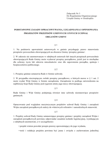 Załącznik Nr 3 Do Regulaminu Organizacyjnego Urzędu Gminy w Grudziądzu PODSTAWOWE ZASADY OPRACOWYWANIA, UZGADNIANIA I OPINIOWANIA PROJEKTÓW PRZEPISÓW GMINNYCH I INNYCH UCHWAŁ ORGANÓW GMINY §1 1. Na podstawie upoważnień ustawowych w gminie przysługuje prawo stanowienia przepisów powszechnie obowiązujących na obszarze Gminy /przepisy gminne/. 2. W zakresie nie unormowanym w odrębnych ustawach lub innych przepisach powszechnie obowiązujących Rada Gminy może wydawać przepisy porządkowe, jeżeli jest to niezbędne dla ochrony życia lub zdrowia mieszkańców oraz dla zapewnienia porządku, spokoju i bezpieczeństwa publicznego. §2 1. Przepisy gminne ustanawia Rada w formie uchwały. 2. W przypadku niecierpiącym zwłoki przepisy porządkowe, o których mowa w § 1 ust. 2 może wydać Wójt Gminy w formie zarządzenia. Zarządzenie to podlega zatwierdzeniu na najbliższej Sesji Rady Gminy pod rygorem utraty jego mocy obowiązującej. §3 Rada Gminy i Wójt Gminy podejmują również inne uchwały niestanowiące przepisów gminnych. §4 Opracowanie pod względem merytorycznym projektów uchwał Rady Gminy i zarządzeń Wójta zarządzeń porządkowych należy do właściwych referatów i samodzielnych stanowisk. §5 1. Projekty uchwał Rady Gminy ustanawiające przepisy gminne i projekty zarządzeń Wójta i zarządzeń porządkowych powinny odpowiadać zasadom techniki legislacyjnej, wynikającym z odrębnych unormowań, a w szczególności: • projekt winien powołać przepis prawny upoważniający do jego wydania, • treść i redakcja projektu powinna być jasna i zwięzła z zachowaniem jednolitej terminologii wynikającej z obowiązujących przepisów, • określić datę wejścia w życie oraz sposób publikacji. 2. Treść projektów należy ujmować w paragrafach, ustępy, punkty i litery. Podziały wyższego stopnia można stosować, jeżeli za tym przemawiają względy przejrzystości i czytelności przepisów. §6 1. Jeżeli podjecie uchwał lub zarządzenia Wójta zgodnie z obowiązującymi przepisami wymaga zgody lub porozumienia z określonymi organami, instytucjami lub organizacjami, projekt uchwały, projekt zarządzenia Wójta należy przedstawić jednostkom celem zajęcia stanowiska. 2. Projekty uchwał i zarządzeń winny być uzgodnione ze Skarbnikiem Gminy jeżeli dotyczą zadań budżetowych albo mogą spowodować skutki gospodarcze bądź finansowe jak również z innymi referatami i jednostkami jeżeli regulują sprawy związane z ich zakresem działania. 3. Wszystkie projekty uchwał Rady Gminy i projekty zarządzeń Wójta oraz zarządzeń porządkowych podlegają ponadto zaopiniowaniu przez radcę prawnego pod względem prawnym. §7 Dokonanie czynności określonych w § 6 przedłożenie projektu wraz z uzasadnieniem należy do referatu lub samodzielnego stanowiska przygotowującego projekt. §8 1. Rejestr uchwał Rady Gminy, rejestr zarządzeń Wójta oraz zarządzeń porządkowych oraz zbiory przepisów gminnych prowadzone są na stanowisku ds. Obsługi Rady gminy i działalności gospodarczej oraz na stanowisku ds. organizacyjno-kadrowych. 2. Zbiór przepisów gminnych winien być dostępny do powszechnego wglądu. §9 Sekretarz Gminy zapewnia skuteczny sposób przekazywania do powszechnej wiadomości przepisy gminne.
