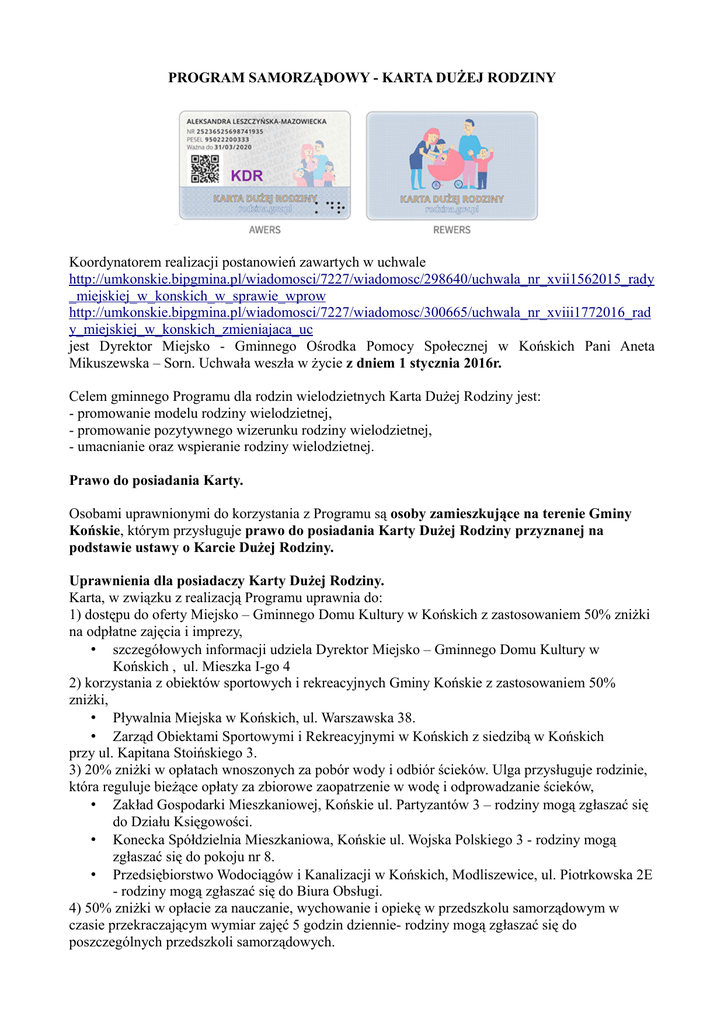 PROGRAM SAMORZĄDOWY - KARTA DUŻEJ RODZINY Koordynatorem realizacji postanowień zawartych w uchwale http://umkonskie.bipgmina.pl/wiadomosci/7227/wiadomosc/298640/uchwala_nr_xvii1562015_rady _miejskiej_w_konskich_w_sprawie_wprow http://umkonskie.bipgmina.pl/wiadomosci/7227/wiadomosc/300665/uchwala_nr_xviii1772016_rad y_miejskiej_w_konskich_zmieniajaca_uc jest Dyrektor Miejsko - Gminnego Ośrodka Pomocy Społecznej w Końskich Pani Aneta Mikuszewska – Sorn. Uchwała weszła w życie z dniem 1 stycznia 2016r. Celem gminnego Programu dla rodzin wielodzietnych Karta Dużej Rodziny jest: - promowanie modelu rodziny wielodzietnej, - promowanie pozytywnego wizerunku rodziny wielodzietnej, - umacnianie oraz wspieranie rodziny wielodzietnej. Prawo do posiadania Karty. Osobami uprawnionymi do korzystania z Programu są osoby zamieszkujące na terenie Gminy Końskie, którym przysługuje prawo do posiadania Karty Dużej Rodziny przyznanej na podstawie ustawy o Karcie Dużej Rodziny. Uprawnienia dla posiadaczy Karty Dużej Rodziny. Karta, w związku z realizacją Programu uprawnia do: 1) dostępu do oferty Miejsko – Gminnego Domu Kultury w Końskich z zastosowaniem 50% zniżki na odpłatne zajęcia i imprezy, • szczegółowych informacji udziela Dyrektor Miejsko – Gminnego Domu Kultury w Końskich , ul. Mieszka I-go 4 2) korzystania z obiektów sportowych i rekreacyjnych Gminy Końskie z zastosowaniem 50% zniżki, • Pływalnia Miejska w Końskich, ul. Warszawska 38. • Zarząd Obiektami Sportowymi i Rekreacyjnymi w Końskich z siedzibą w Końskich przy ul. Kapitana Stoińskiego 3. 3) 20% zniżki w opłatach wnoszonych za pobór wody i odbiór ścieków. Ulga przysługuje rodzinie, która reguluje bieżące opłaty za zbiorowe zaopatrzenie w wodę i odprowadzanie ścieków, • Zakład Gospodarki Mieszkaniowej, Końskie ul. Partyzantów 3 – rodziny mogą zgłaszać się do Działu Księgowości. • Konecka Spółdzielnia Mieszkaniowa, Końskie ul. Wojska Polskiego 3 - rodziny mogą zgłaszać się do pokoju nr 8. • Przedsiębiorstwo Wodociągów i Kanalizacji w Końskich, Modliszewice, ul. Piotrkowska 2E - rodziny mogą zgłaszać się do Biura Obsługi. 4) 50% zniżki w opłacie za nauczanie, wychowanie i opiekę w przedszkolu samorządowym w czasie przekraczającym wymiar zajęć 5 godzin dziennie- rodziny mogą zgłaszać się do poszczególnych przedszkoli samorządowych. 5) dopłat do opłaty za gospodarowanie odpadami komunalnymi w wysokości 2 zł na każde dziecko. Dopłata przysługuje rodzinie, która terminowo reguluje opłaty za gospodarowanie odpadami komunalnymi, • Urząd Miasta i Gminy Końskie , ul. Partyzantów 1- rodziny mogą zgłaszać się do pokoju nr 29. • Zakład Gospodarki Mieszkaniowej , Końskie ul. Partyzantów 3– rodziny mogą zgłaszać się do Działu Księgowości. • Konecka Spółdzielnia Mieszkaniowa, Końskie ul. Wojska Polskiego 3– rodziny mogą zgłaszać się do pokoju nr 8. 6) ulg, rabatów, upustów oferowanych przez podmioty, które przystąpią do Programu na podstawie porozumienia zawartego z Gminą Końskie. Dokument identyfikujący osobę uprawnioną do korzystania z Programu. Dokument identyfikujący osobę uprawnioną do korzystania z Programu jest Karta Dużej Rodziny przyznana na podstawie ustawy o Karcie Dużej Rodziny. Identyfikatorem Gminy Końskie są następujące cyfry: 2605033 . Obowiązek informacyjny wnioskodawcy. W przypadku wystąpienia zmian mających wpływ na uprawnienie do korzystania z Karty Dużej Rodziny członek rodziny wielodzietnej jest obowiązany do niezwłocznego powiadomienia o zmianach. WAŻNE DLA POSIADACZY KARTY DUŻEJ RODZINY. Prosimy o zwracanie uwagi na termin ważności karty. ZOSTAŃ PARTNEREM GMINNEGO PROGRAMU DLA RODZIN WIELODZIETNYCH KARTA DUŻEJ RODZINY. Program ma charakter otwarty i ewolucyjny. Przedsiębiorcy i instytucje niebędące jednostkami organizacyjnymi Gminy Końskie mogą włączyć się w realizację Programu wypełniając deklarację Przedsiębiorcy i instytucje oferujące zniżki informują o realizacji Programu w miejscu realizacji uprawnień umieszczając w widoczny miejscu znak graficzny. Szczegółowych informacji udzielają pracownicy Miejsko -Gminnego Ośrodka Pomocy Społecznej w Końskich w pokoju nr 23 tel. 413727920 wew. 53. Załączniki do pobrania: 1. Deklaracja zgłoszenia podmiotu jako partnera gminnego Programu dla rodzin wielodzietnych Karta Dużej Rodziny. 2. Znak graficzny.