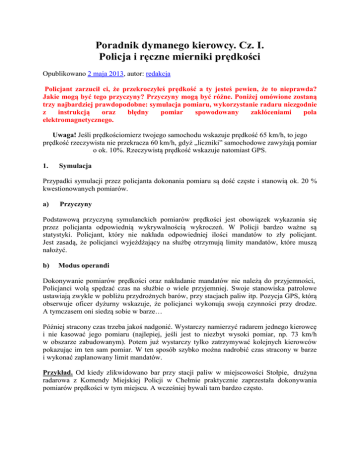 Poradnik dymanego kierowcy. Cz. I. Policja i ręczne mierniki prędkości Opublikowano 2 maja 2013, autor: redakcja Policjant zarzucił ci, że przekroczyłeś prędkość a ty jesteś pewien, że to nieprawda? Jakie mogą być tego przyczyny? Przyczyny mogą być różne. Poniżej omówione zostaną trzy najbardziej prawdopodobne: symulacja pomiaru, wykorzystanie radaru niezgodnie z instrukcją oraz błędny pomiar spowodowany zakłóceniami pola elektromagnetycznego. Uwaga! Jeśli prędkościomierz twojego samochodu wskazuje prędkość 65 km/h, to jego prędkość rzeczywista nie przekracza 60 km/h, gdyż „liczniki” samochodowe zawyżają pomiar o ok. 10%. Rzeczywistą prędkość wskazuje natomiast GPS. 1. Symulacja Przypadki symulacji przez policjanta dokonania pomiaru są dość częste i stanowią ok. 20 % kwestionowanych pomiarów. a) Przyczyny Podstawową przyczyną symulanckich pomiarów prędkości jest obowiązek wykazania się przez policjanta odpowiednią wykrywalnością wykroczeń. W Policji bardzo ważne są statystyki. Policjant, który nie nakłada odpowiedniej ilości mandatów to zły policjant. Jest zasadą, że policjanci wyjeżdżający na służbę otrzymują limity mandatów, które muszą nałożyć. b) Modus operandi Dokonywanie pomiarów prędkości oraz nakładanie mandatów nie należą do przyjemności, Policjanci wolą spędzać czas na służbie o wiele przyjemniej. Swoje stanowiska patrolowe ustawiają zwykle w pobliżu przydrożnych barów, przy stacjach paliw itp. Pozycja GPS, którą obserwuje oficer dyżurny wskazuje, że policjanci wykonują swoją czynności przy drodze. A tymczasem oni siedzą sobie w barze… Później stracony czas trzeba jakoś nadgonić. Wystarczy namierzyć radarem jednego kierowcę i nie kasować jego pomiaru (najlepiej, jeśli jest to niezbyt wysoki pomiar, np. 73 km/h w obszarze zabudowanym). Potem już wystarczy tylko zatrzymywać kolejnych kierowców pokazując im ten sam pomiar. W ten sposób szybko można nadrobić czas stracony w barze i wykonać zaplanowany limit mandatów. Przykład. Od kiedy zlikwidowano bar przy stacji paliw w miejscowości Stołpie, drużyna radarowa z Komendy Miejskiej Policji w Chełmie praktycznie zaprzestała dokonywania pomiarów prędkości w tym miejscu. A wcześniej bywali tam bardzo często. Okoliczności uprawdopodobniające symulację c) Na wyświetlaczu radaru ręcznego wyświetlają się dwie wartości: prędkość, upływ czasu od dokonania pomiaru. Na złodzieju czapka gore, więc – w przypadkach symulacji - policjanci pokazują zatrzymanemu kierowcy fotoradar z wyświetloną wartością, trzymając przyrząd w znacznej odległości od oczu kierowcy – tak aby nie dostrzegł ile czasu upłynęło od dokonania pomiaru. d) Obrona Symulacja jest łatwa do wykrycia. Wystarczy podejść bliżej radaru i sprawdzić ile czasu upłynęło od momentu pomiaru. Jeśli poprosisz o okazanie tego wyniku, policjant najprawdopodobniej sam wycofa się z mandatu i stwierdzi, „że coś jest nie w porządku”. Gdyby jednak upierał się przy mandacie: należy jak najszybciej: sfotografować radar w taki sposób aby był widoczny wynik pomiaru a także numer fabryczny urządzenia; należy zażądać okazania dokumentu legalizacji radaru i sfotografować ten dokument; należy zażądać okazania przez policjanta legitymacji służbowej i ją także sfotografować, należy niezwłocznie zawiadomić prokuraturę i nie opuszczać miejsca zdarzenia do jej przyjazdu; ponieważ prokuraturze nie można zbytnio ufać, należy też zawiadomić prasę lub inne media. Uwaga! Jeśli nie wykonasz powyższych działań, to w aktach sprawy sądowej znajdzie się dokumentacja innego radaru, a jedynym dowodem na potwierdzenie twojej winy będą zeznania policjantów. Twoje szanse na wygranie sprawy wyniosą wówczas 0%. No chyba, że twój wujek jest prezesem sądu. 2. Wykorzystanie radaru niezgodnie z instrukcją a) Przyczyny Przypadki używania radaru przez policjantów niezgodnie z instrukcją są bardzo częste. Główną przyczyną takiego stanu rzeczy jest przede wszystkim dramatycznie niski poziom wyszkolenia policjantów z wydziałów ruchu drogowego. W okresie PRL większość z nich została by wyrzucona z drogówki za brak posiadanych kwalifikacji. W efekcie większość pomiarów wykonywanych przez policjantów za pomocą ręcznych mierników prędkości to pomiary błędne (nie zawsze błędy te są na niekorzyść kierowcy). Dramatyczne w tym wszystkim jest także to, że sądy nie badają kwalifikacji policjantów do wykonania pomiaru określonym urządzeniem, przyjmując „za objawioną” każdą informację, która pochodzi od funkcjonariusza. Zeznania policjanta, w którym stwierdzi on, że jest pewien, że dokonał pomiaru jest w polskim sądzie nie do podważenia. W 90% procent przypadków sądy nie przeprowadzają żadnych innych dowodów i skazują kierowców tylko i wyłącznie na podstawie takiego zeznania. Nawet jeśli zeznanie to jest niedorzeczne. b) Przykład Kierujący pojazdem osobowym zakwestionował pomiar prędkości wykonany przez funkcjonariusza Komendy Powiatowej Policji w Żninie urządzeniem Iskra 1 w miejscowości Wenecja. Pomiar wykonywany został w odległości ok. 250 m od tablicy oznaczającej początek obszaru zabudowanego, w warunkach wzmożonego ruchu, gdy w polu widzenia znajdowały się inne samochody. Wyrokiem z dnia 15 listopada 2012 r. Sąd Rejonowy w Żninie (sygn. akt W 204/12) uznał kierowcę za winnego tego, że w dniu 2 czerwca 2012 r. przekroczył dozwoloną prędkość w terenie zabudowanym. W sprawie orzekał sędzia Robert Tuchciński. Podstawę ustaleń faktycznych stanowiły jedynie zeznania policjanta Michała Robakowskiego, który dokonywał pomiaru oraz zeznań jego kolegi, który nie wiele pamiętał. Michał Robakowski zeznał m. in., że: „To urządzenie nie ma funkcji by ustawiać zakres odległości. Tak ja na pewno mierzyłem prędko